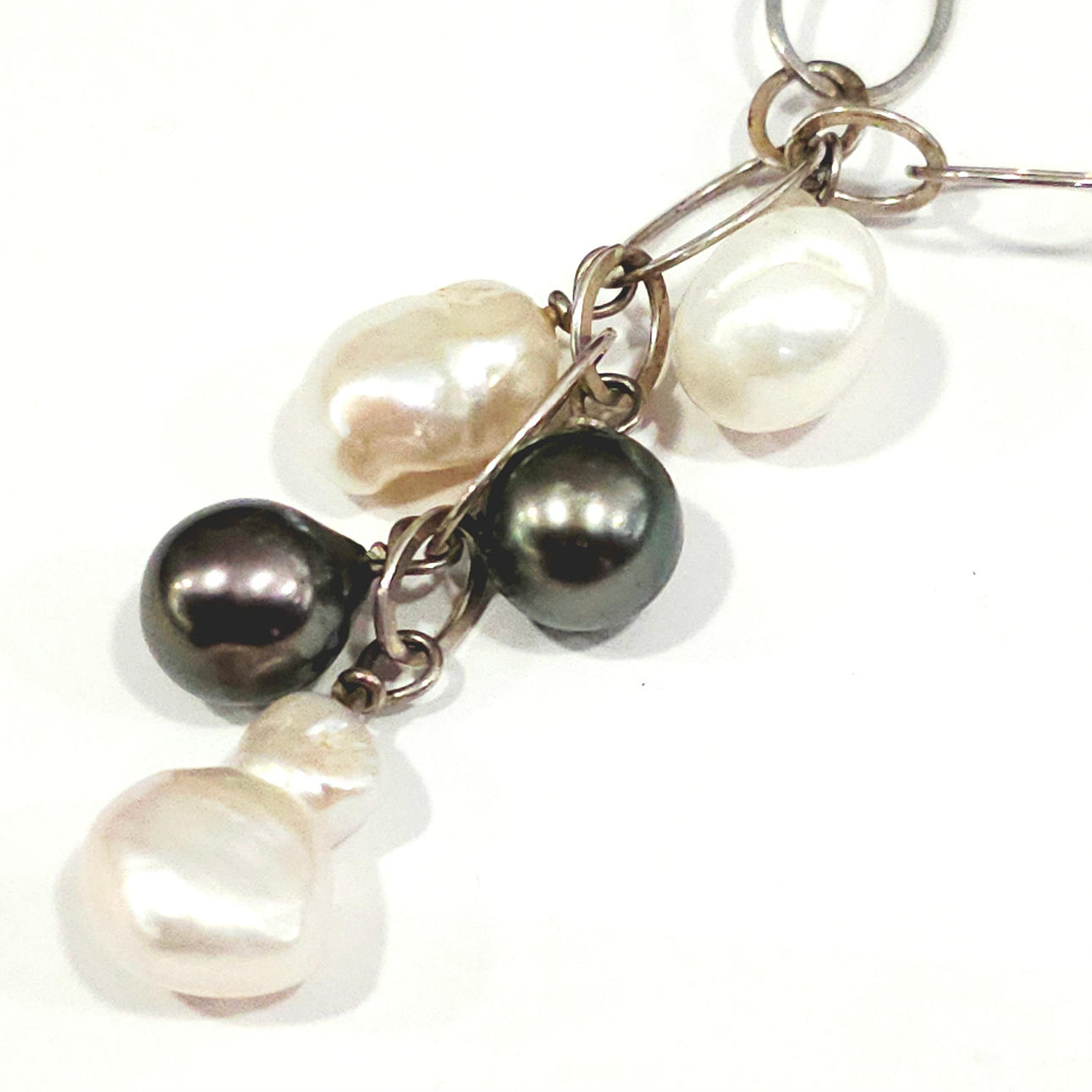 Silver necklace with baroque pearl pendants.