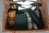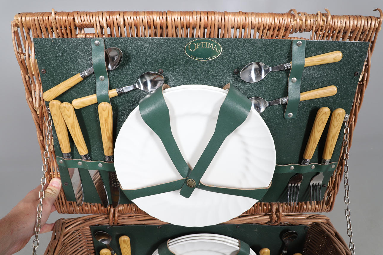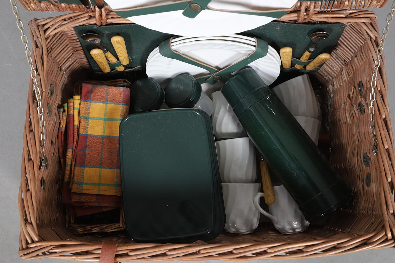four person setting, with ceramic plates and mugs, glasses, cutlery, Thermos flask, napkins etc, 32cm high x 54cm wide x 39cm deep.