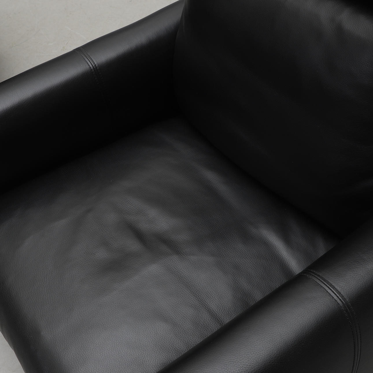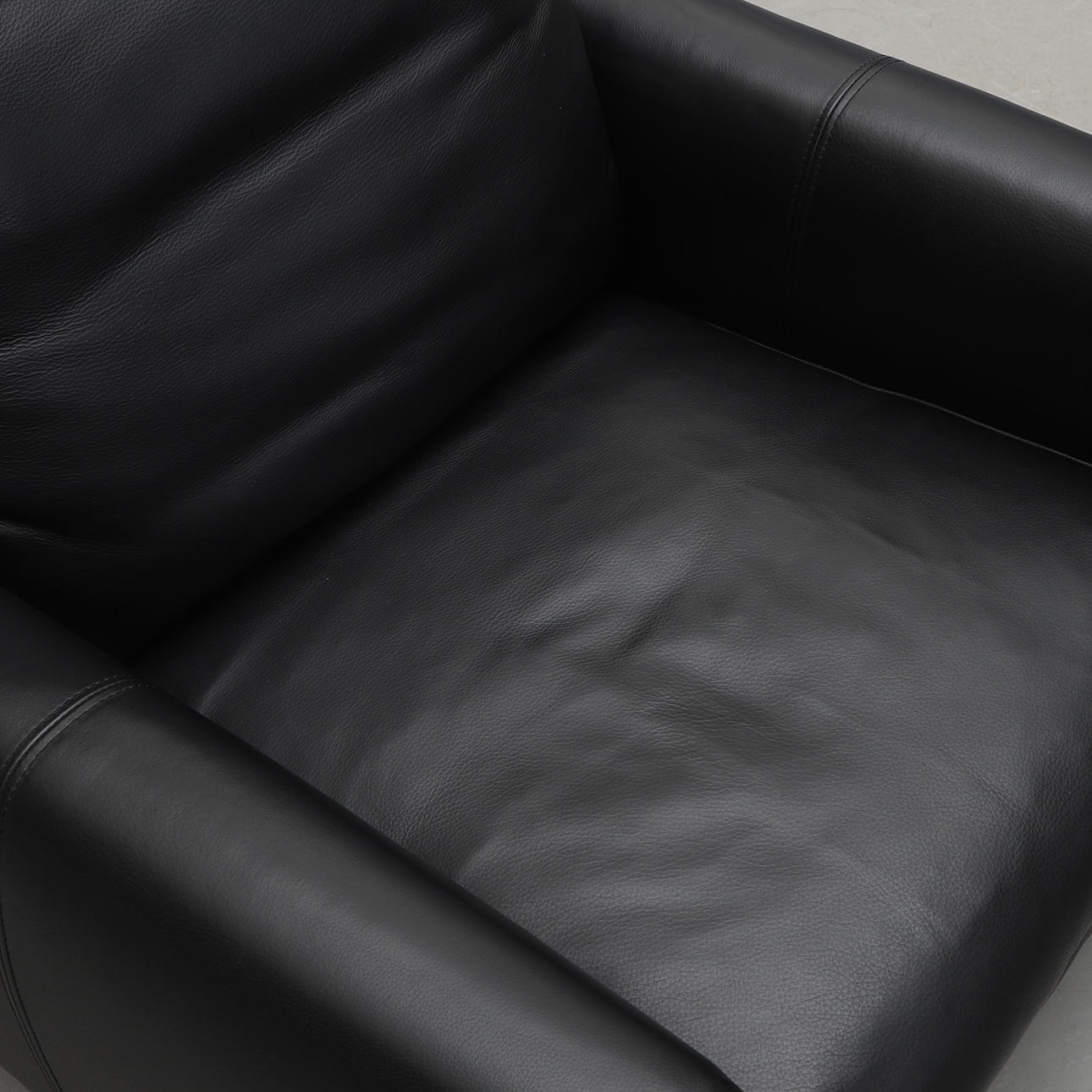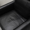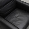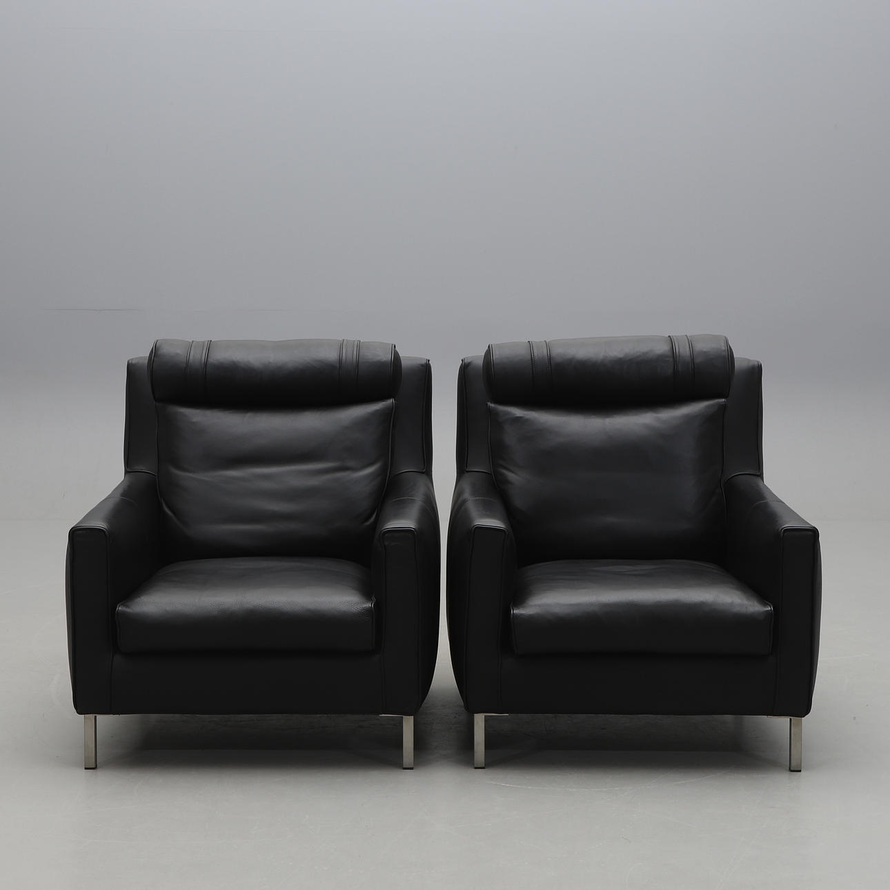 Upholstered and dressed with black leather. Loose cushions in the seat and back. Neck pillow. Labeled. Steel legs. Width 82, depth approx. 90, back height including neck pillow approx. 95, seat height 40 cm.