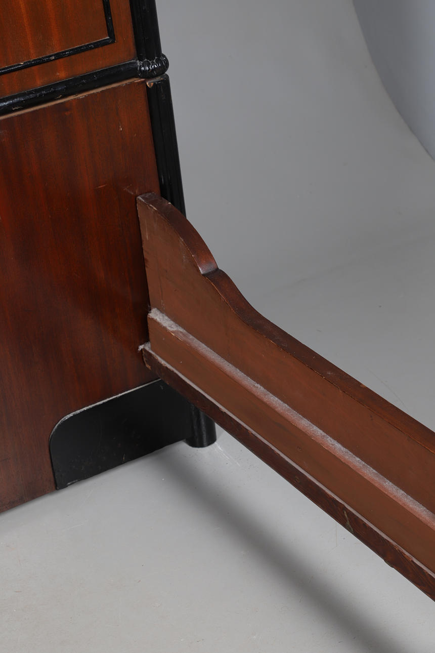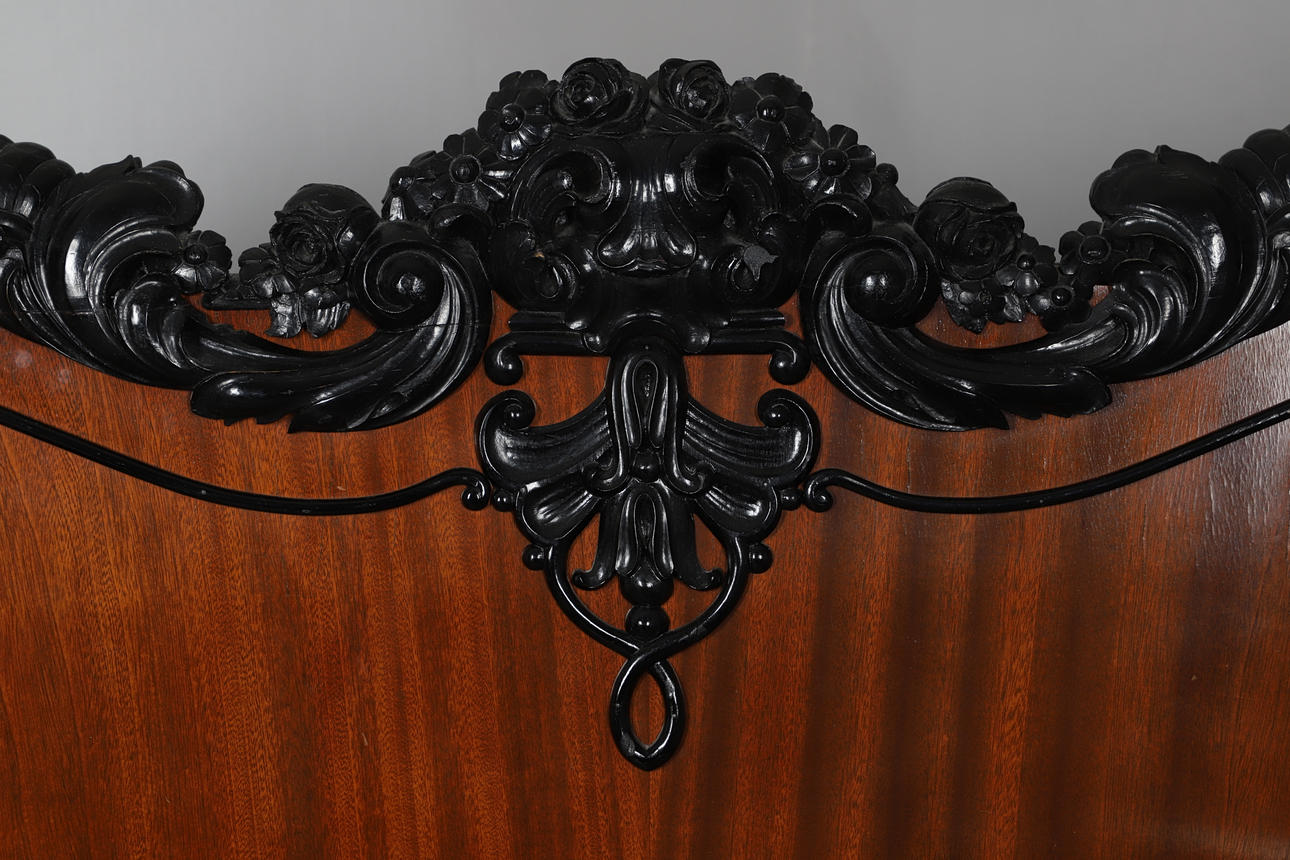 With ebonised foliate decoration to the headboard. Height 164cm, width 212cm, depth 218cm.