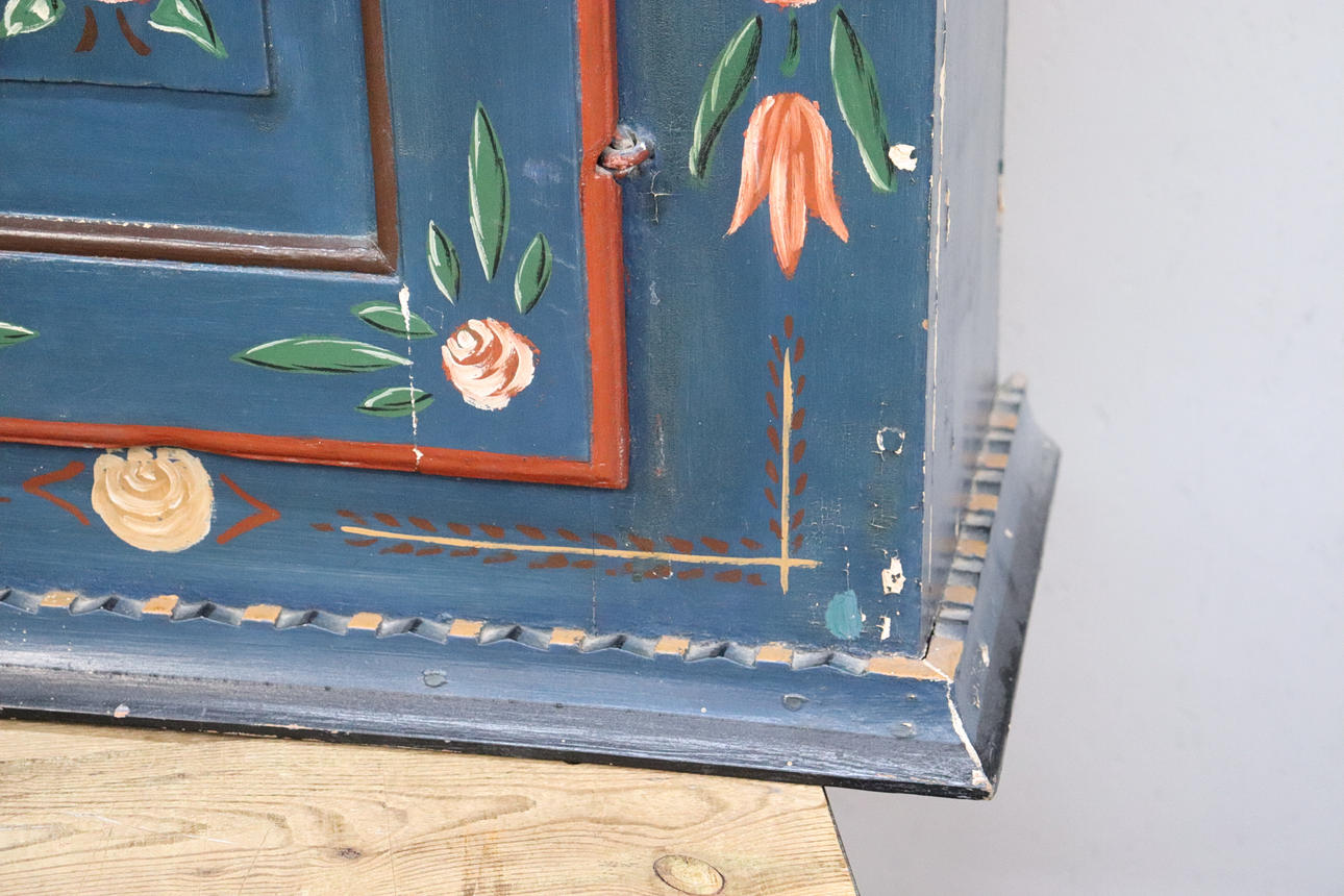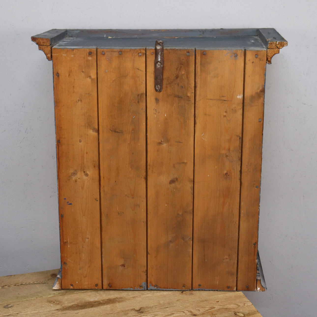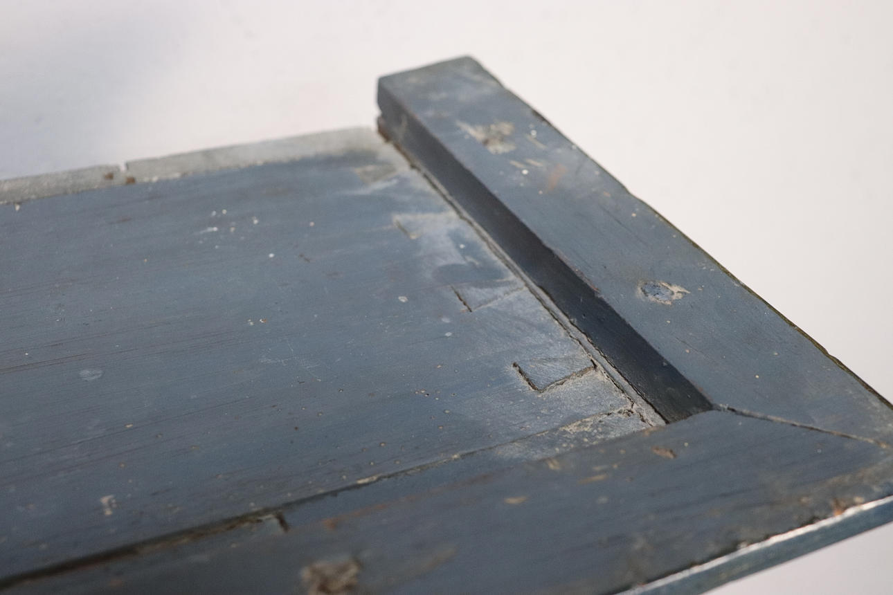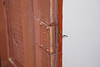 Normal wear and tear, paint loss, renovated, lock replaced, probably later repainted.