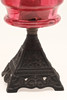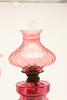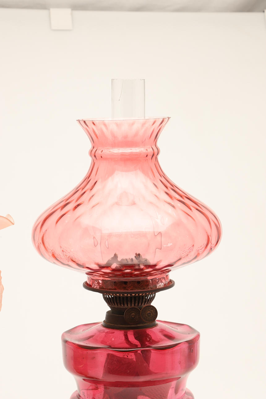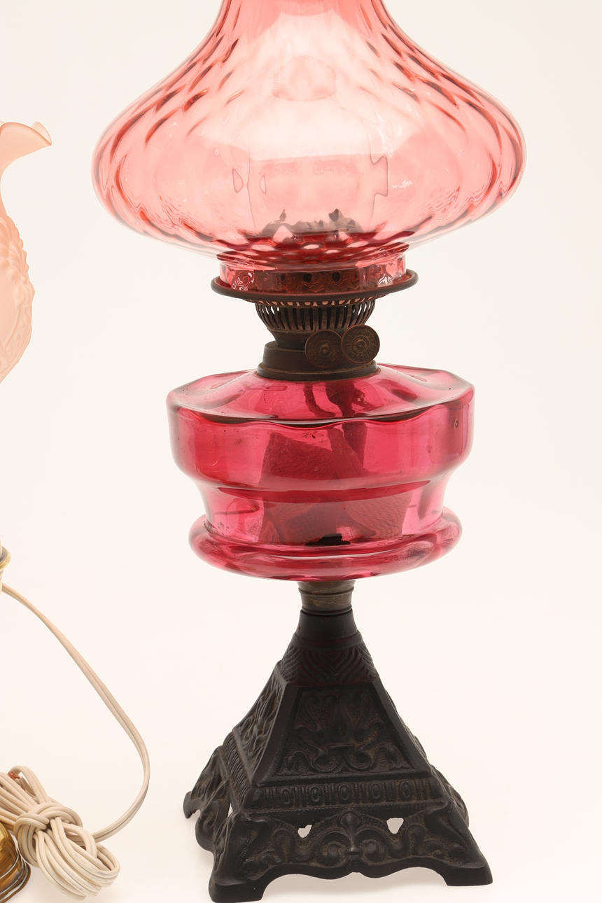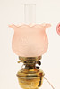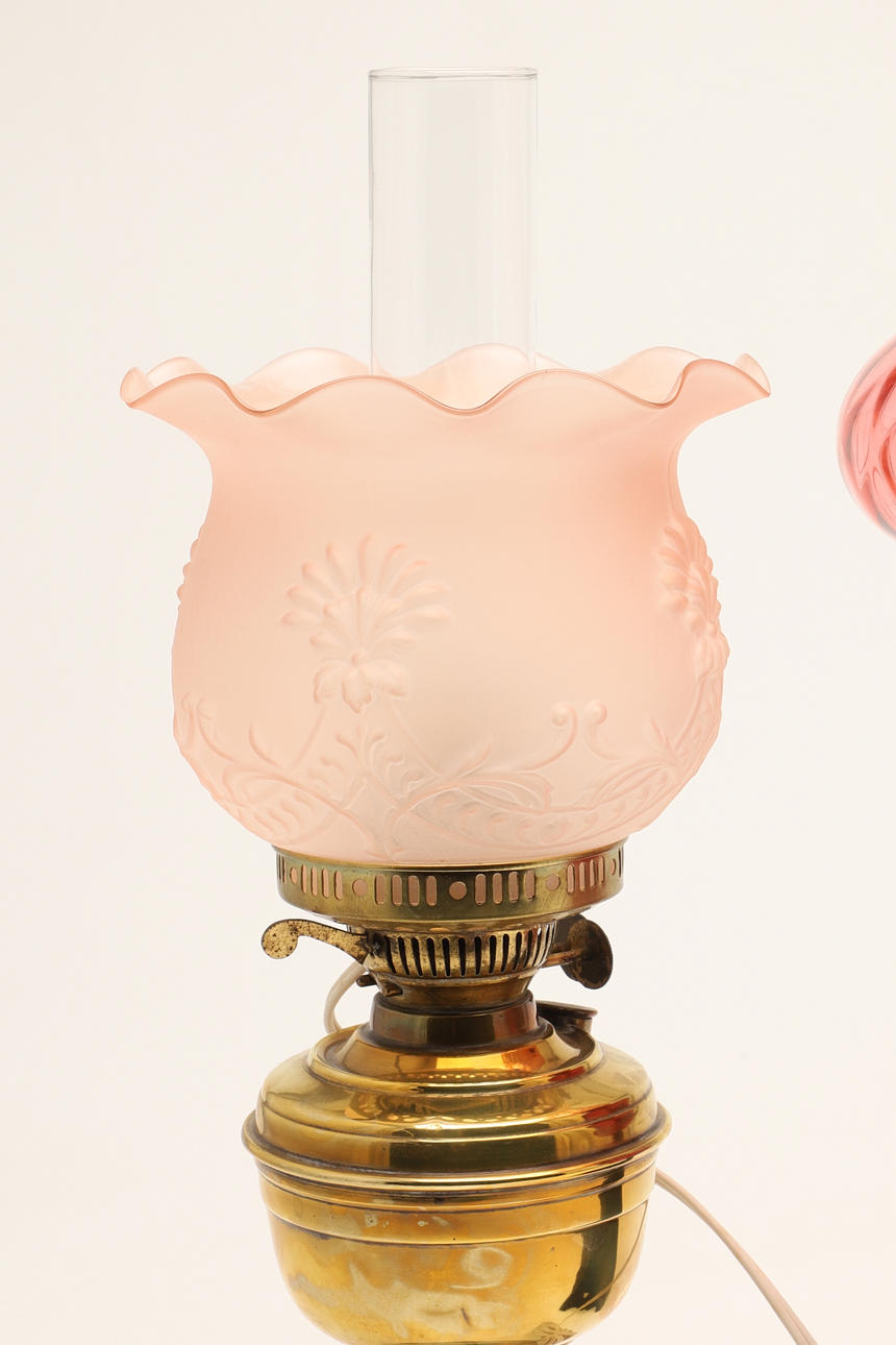 One with a pink floral and foliate decorative shade and flute, with brass base (height 57cm), another pink decorative shade with flute (height 50cm).