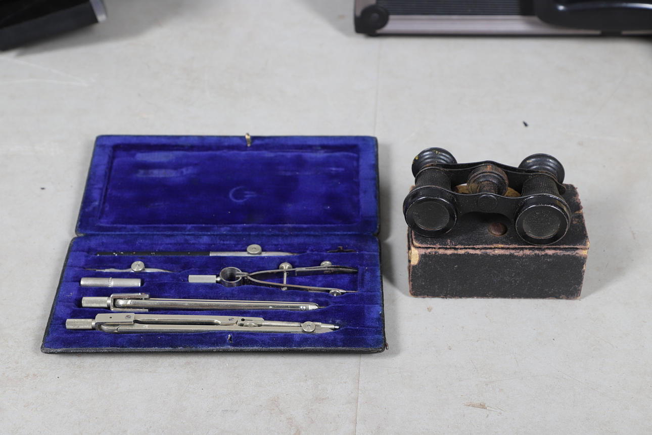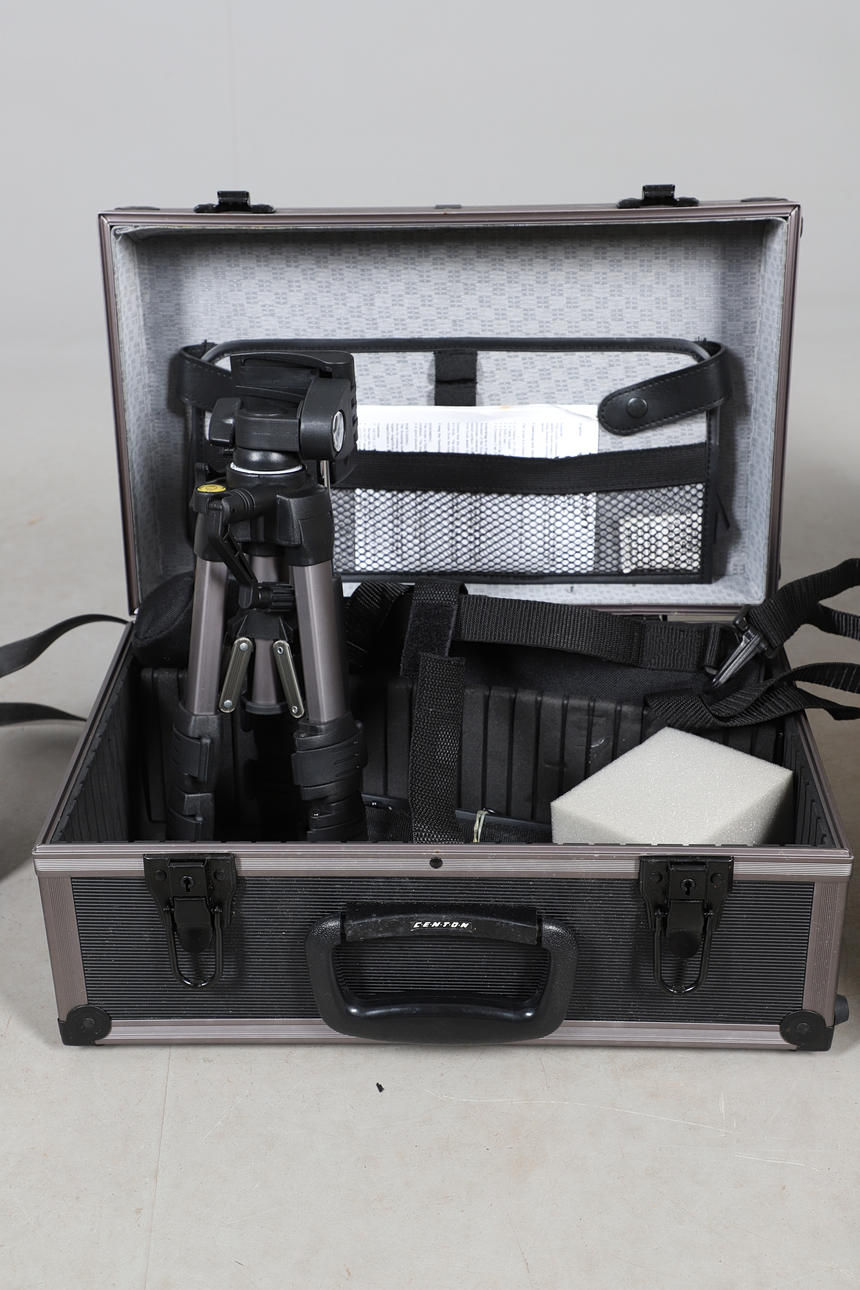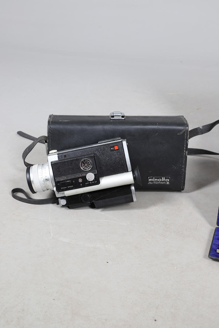 A cased Specto '500' projector with accessories. Together with a Minolta Autopak-8 D6 Video Recorder, and a Centon cased box for a Zoom Spotting Scope (scope is missing) with a tripod inside. A pair of small binoculars etc. Projector box 48x24x28cm.