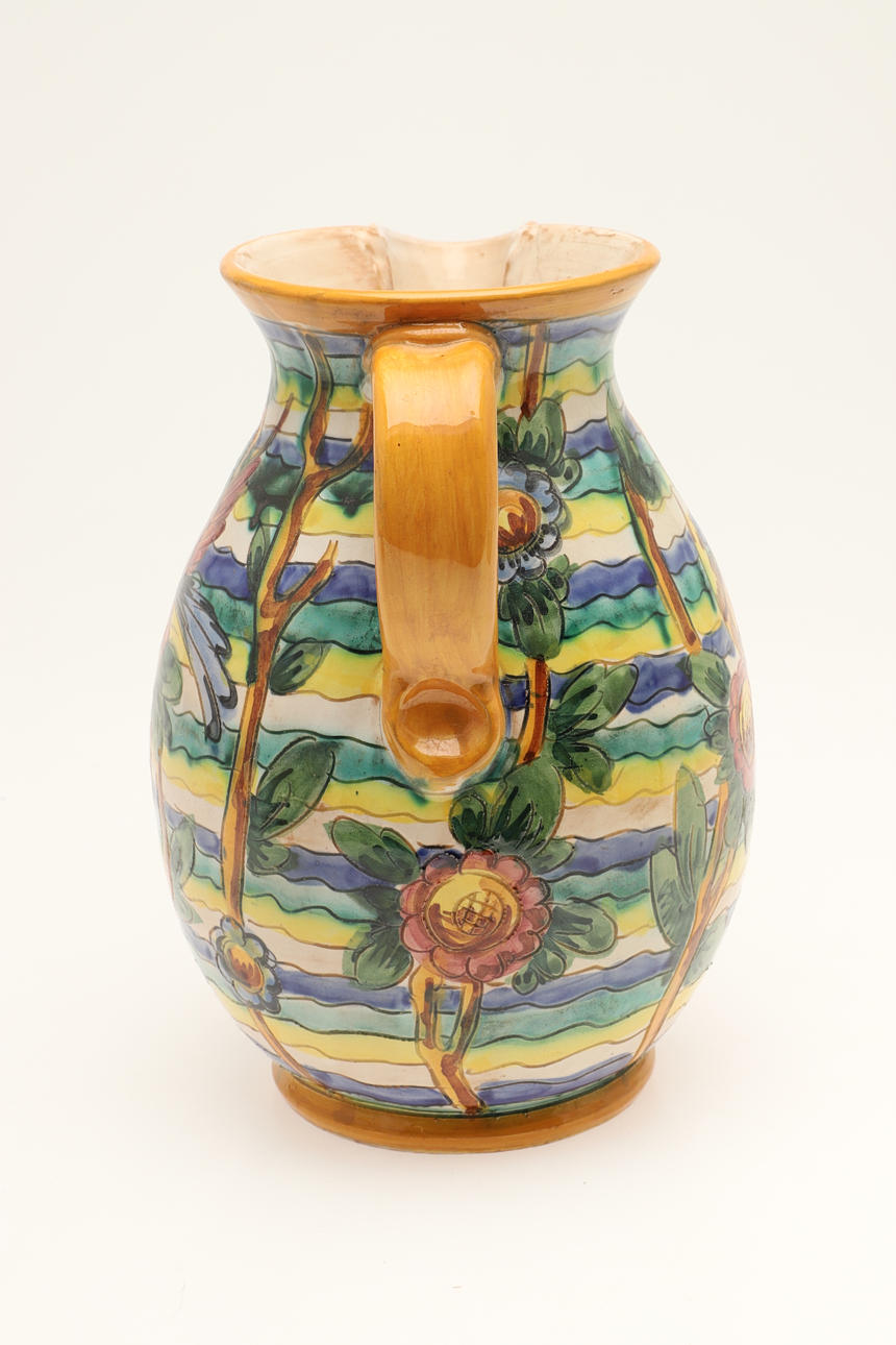 The Slyvac dish with a penguin to the front (diameter 18cm). Marked underneath. Together with a large studio pottery jug (height 25cm) and basket (height 22cm). (3).