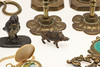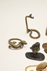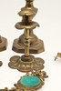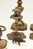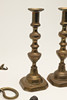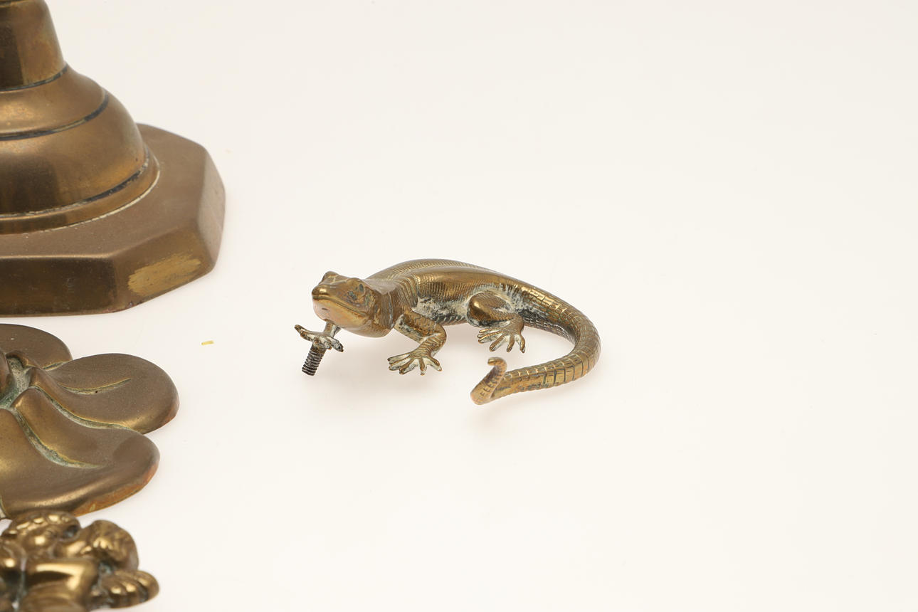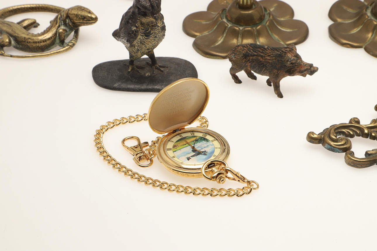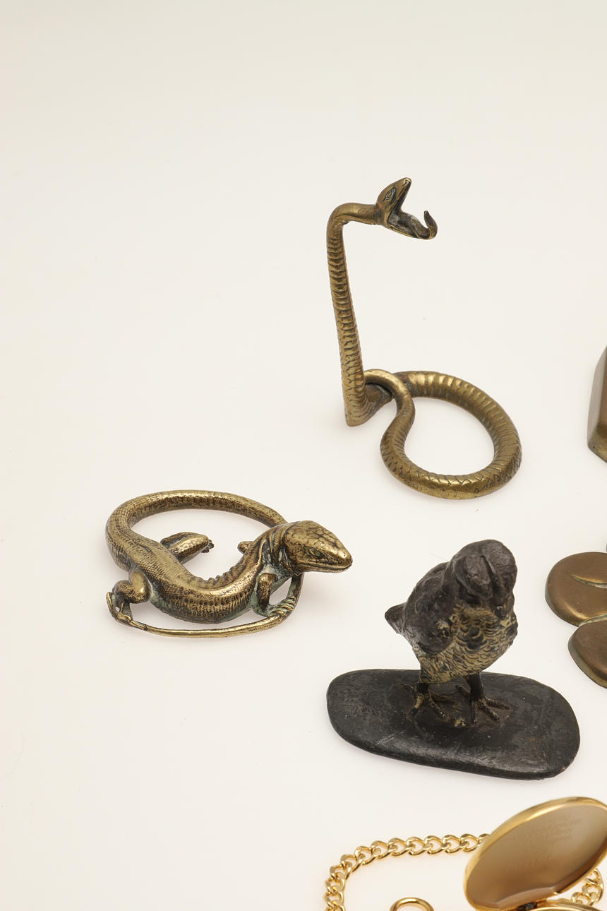 comprising of two pairs of candlesticks, the taller 31cm, a pocket watch stand modelled with cherub detail, 15cm high, Indian brass lizard and snakes, modern Spitfire decorated pocket watch, together with an early 20th century cold painted metal bird, 9cm high, and a painted metal figure of a wild boar.