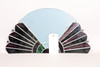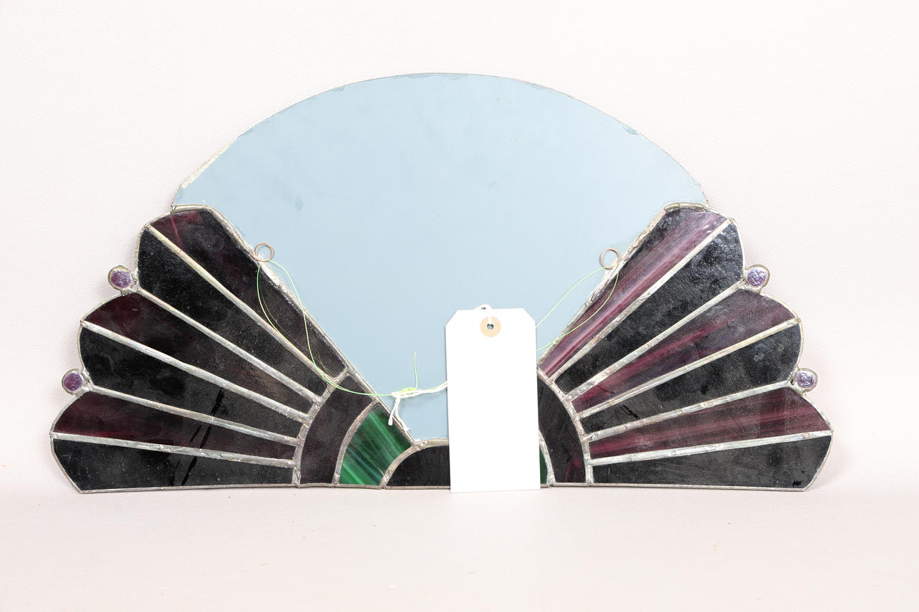 The fan shaped wall mirror with pearlescent and malachite green decoration, 51.5cm x 27.5cm.