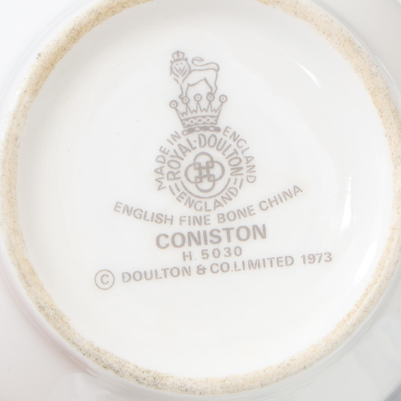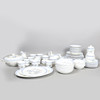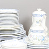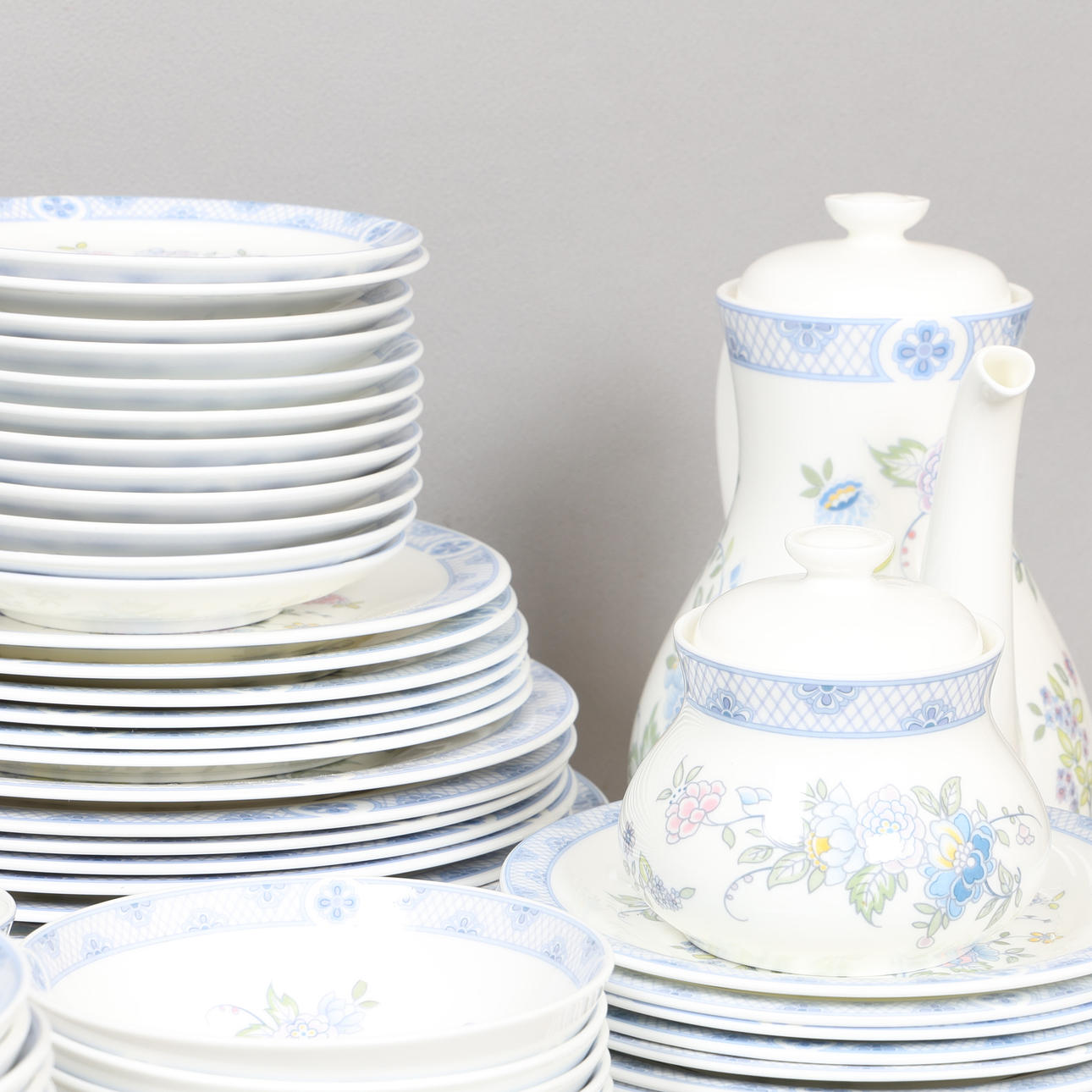 Consisting of six 27cm plates, six 23cm plates, six 20.5cm plates, twelve 16.5cm plates, ten 17.5cm bowls, twelve saucers, thirteen cups, 2 jugs, one coffee pot 21cm high, two sugar bowls, two tureens one with cover, one sauce boat, etc (qty).