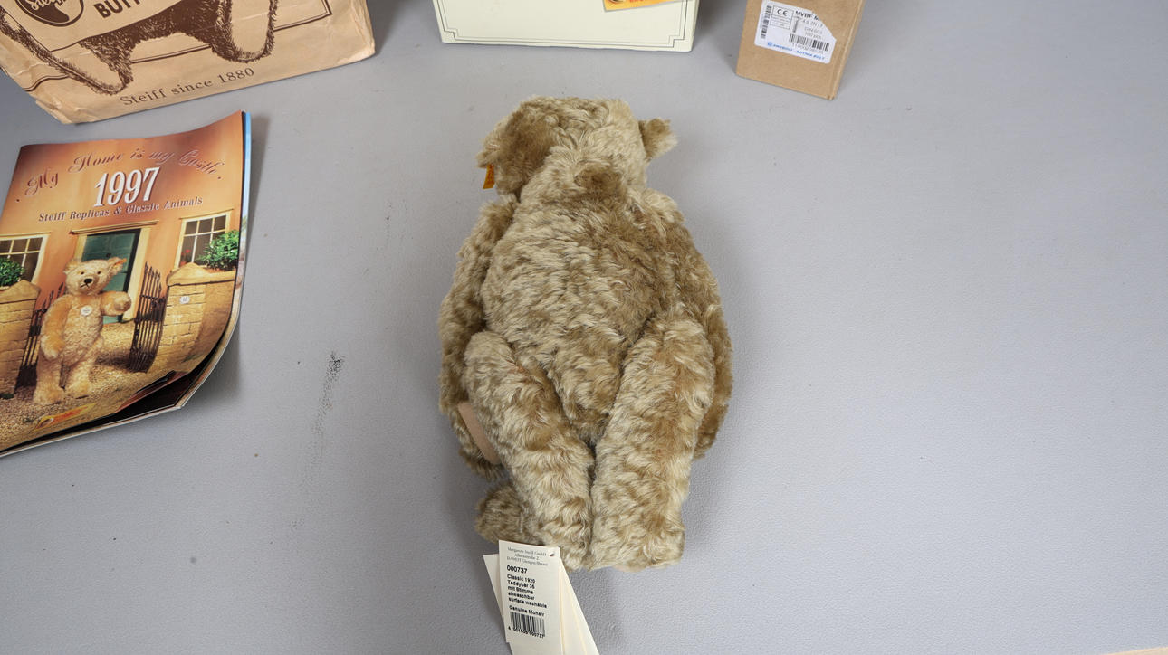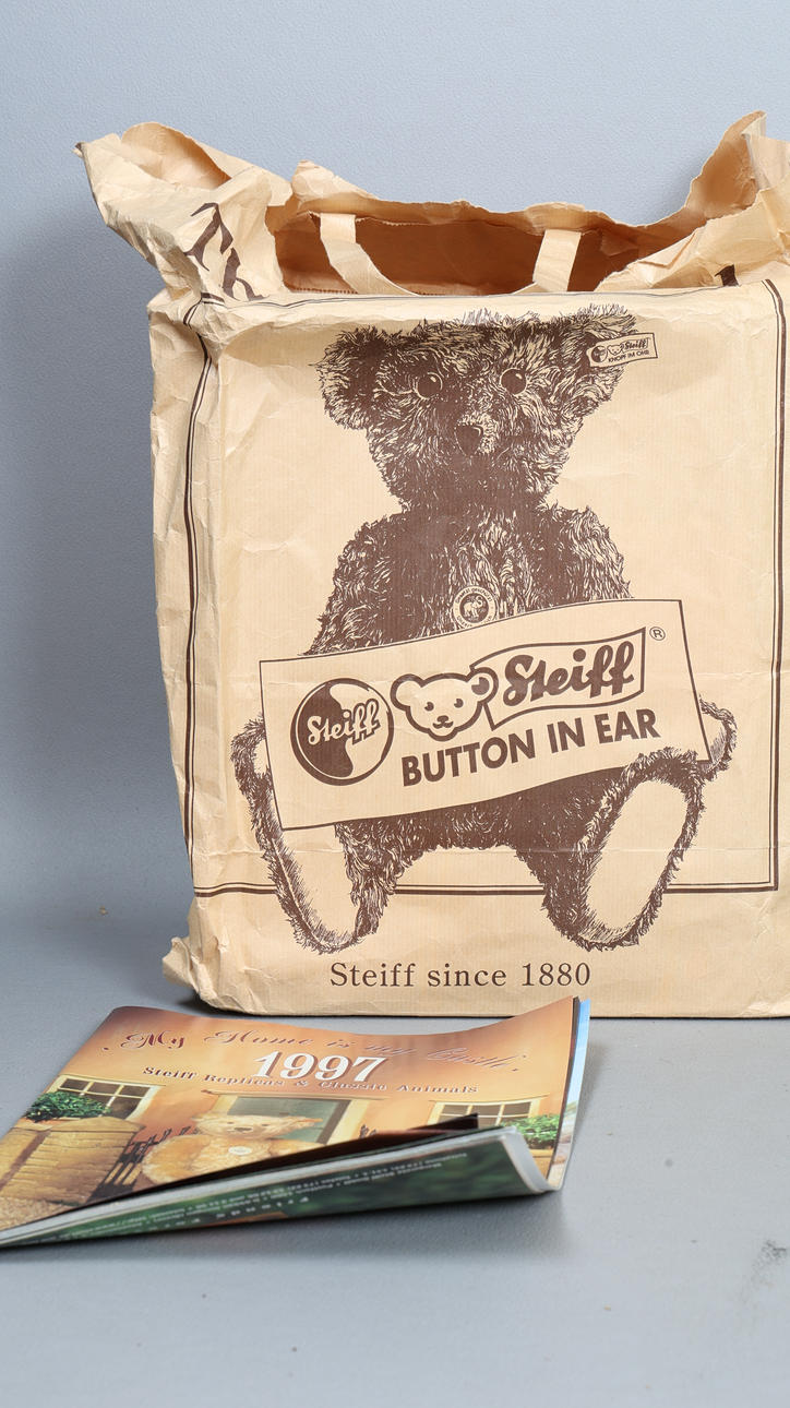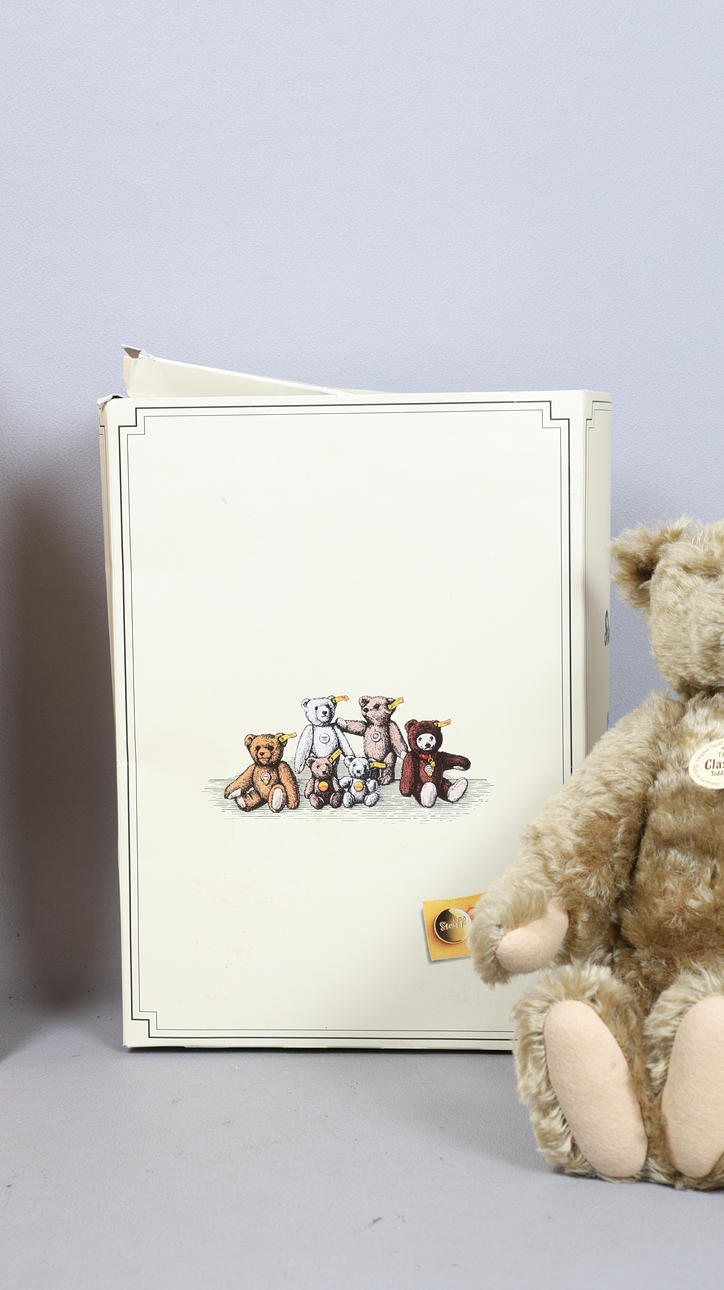 With adjustable arms and legs, button to one ear, 32cm long, with box.