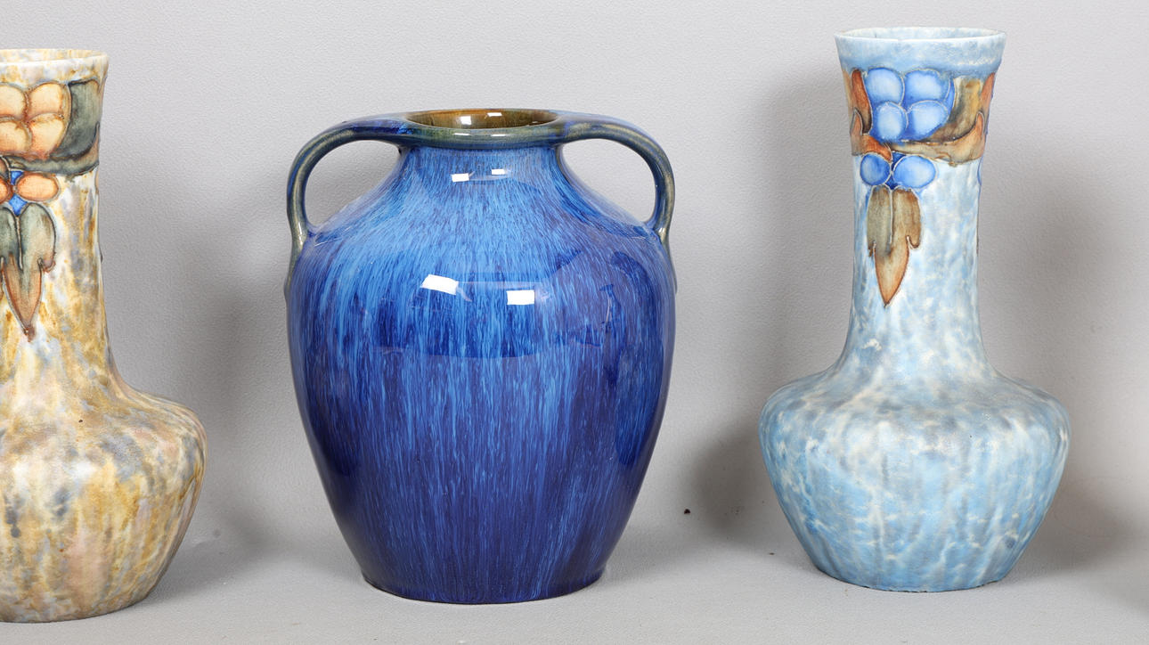 To include three Cranston vases, a Denby twin handled vase, together with a H. M. & Co vase, the largest 27cm high.
