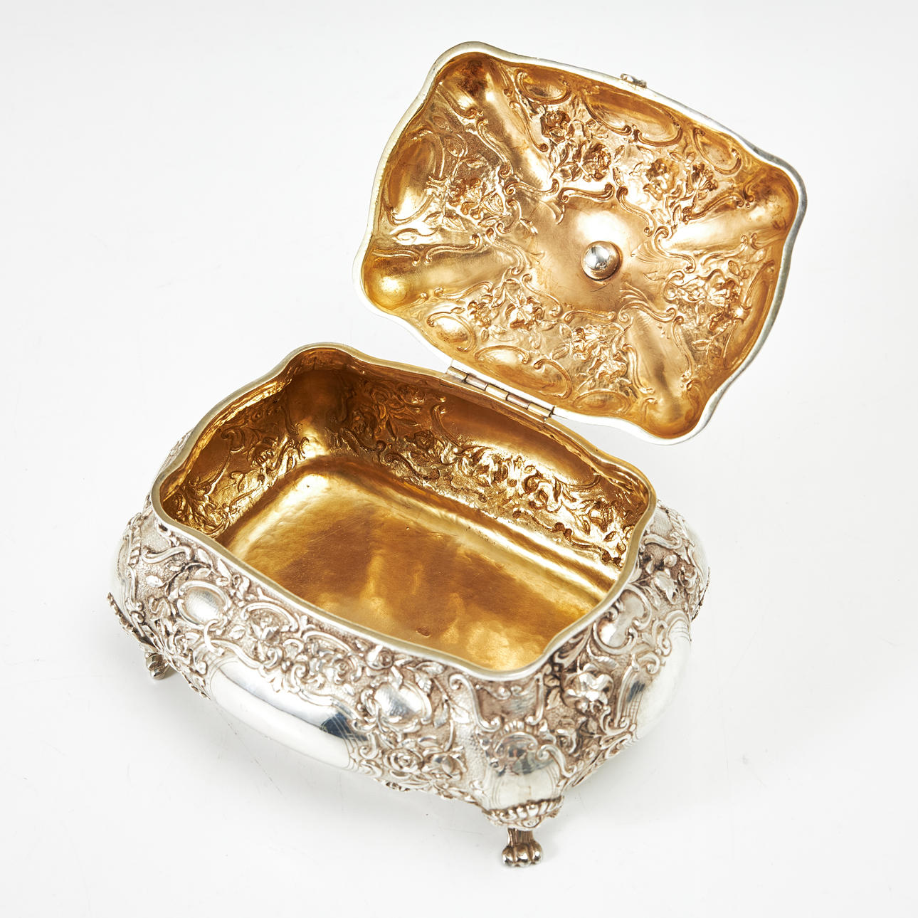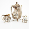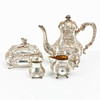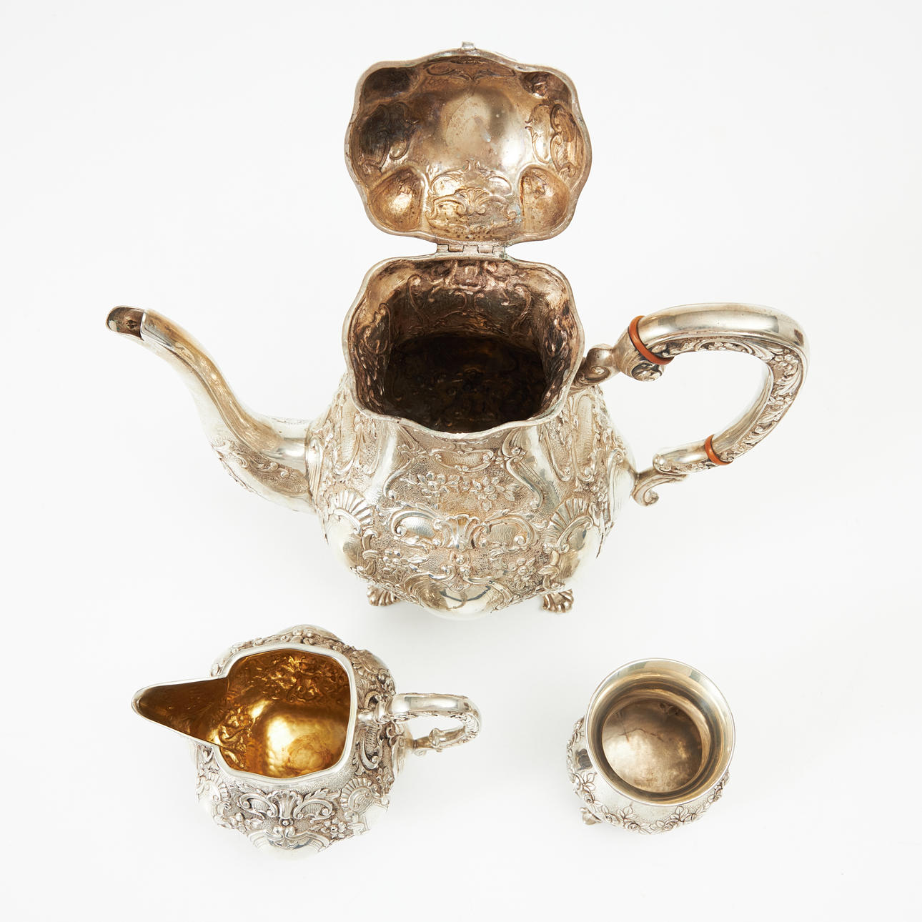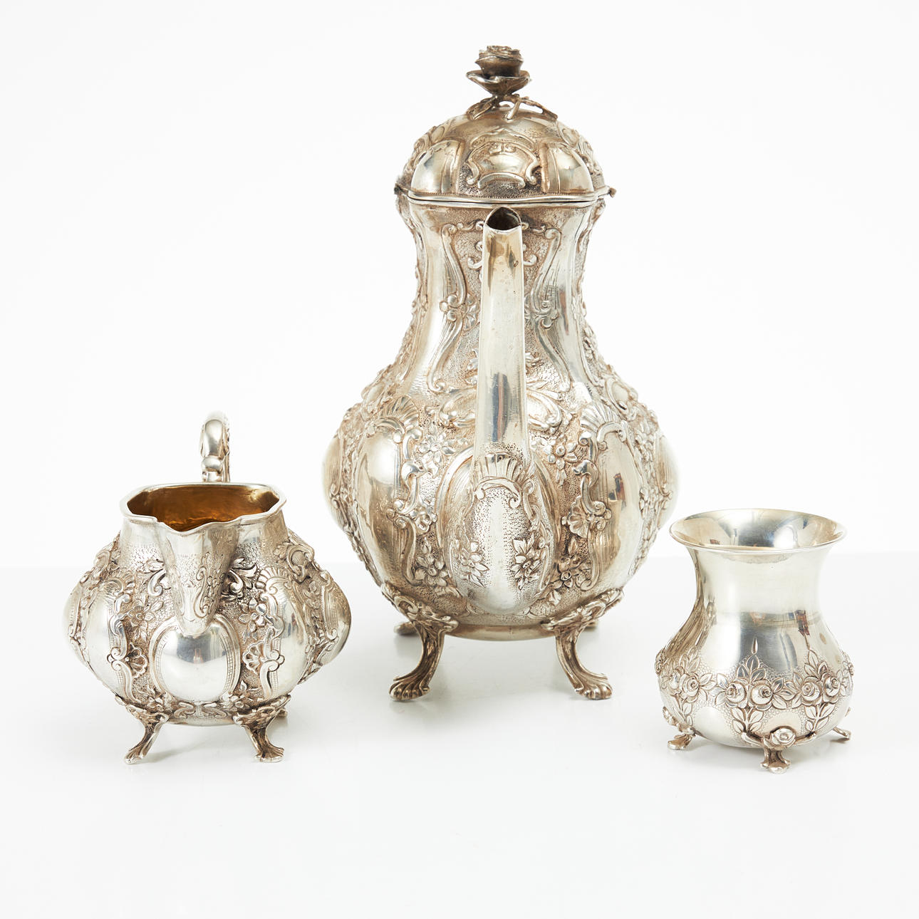 4446321. COFFEE SET, 4 dlr., silver, Rococo style, Hanau, Germany, partially gilded interior, buds in the shape of roses.