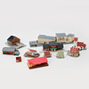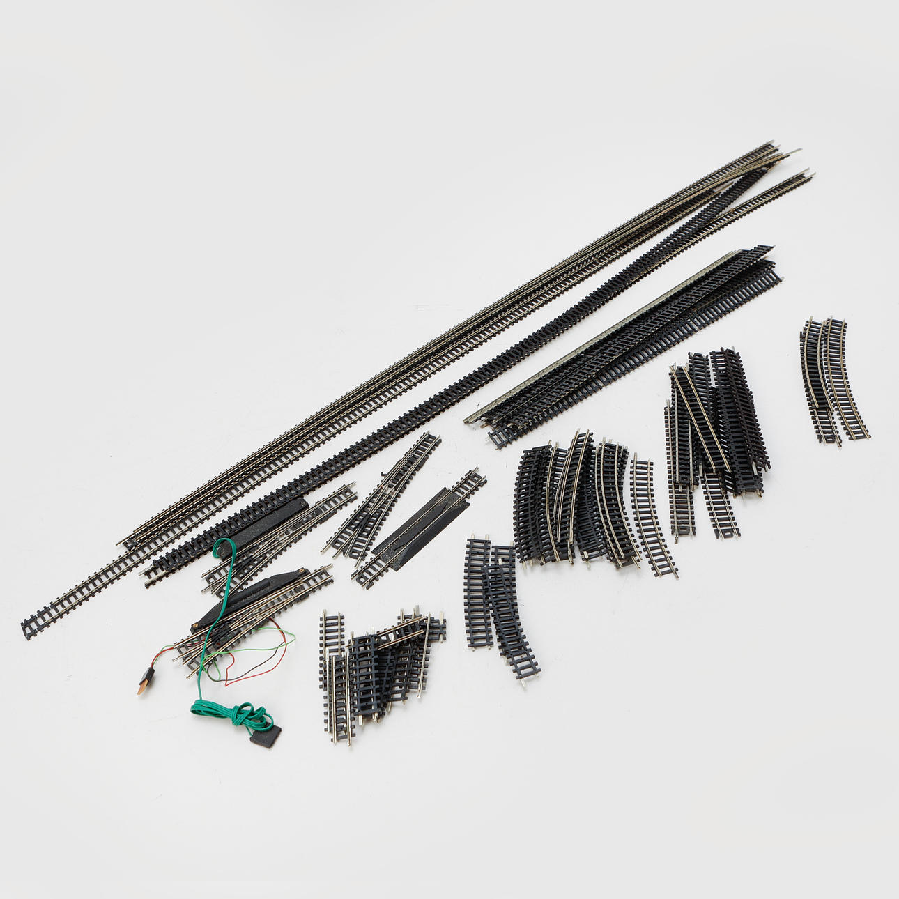 Rails, houses, locomotives, carriages, figures, trees, transformers, etc.