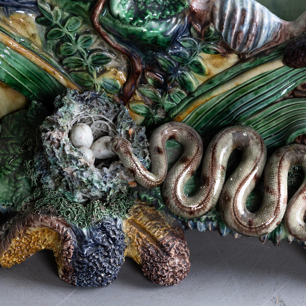Nature motif with snake in nest with egg, unmarked, height approx. 20, 31 x 19 cm.