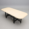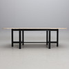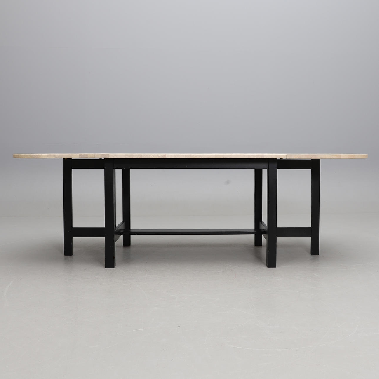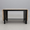Sheet of ash, black lacquered bone frame with folding gates. The disc with two fold-down rounded flaps. Total length 242, folded length 128, height 75.5 cm.