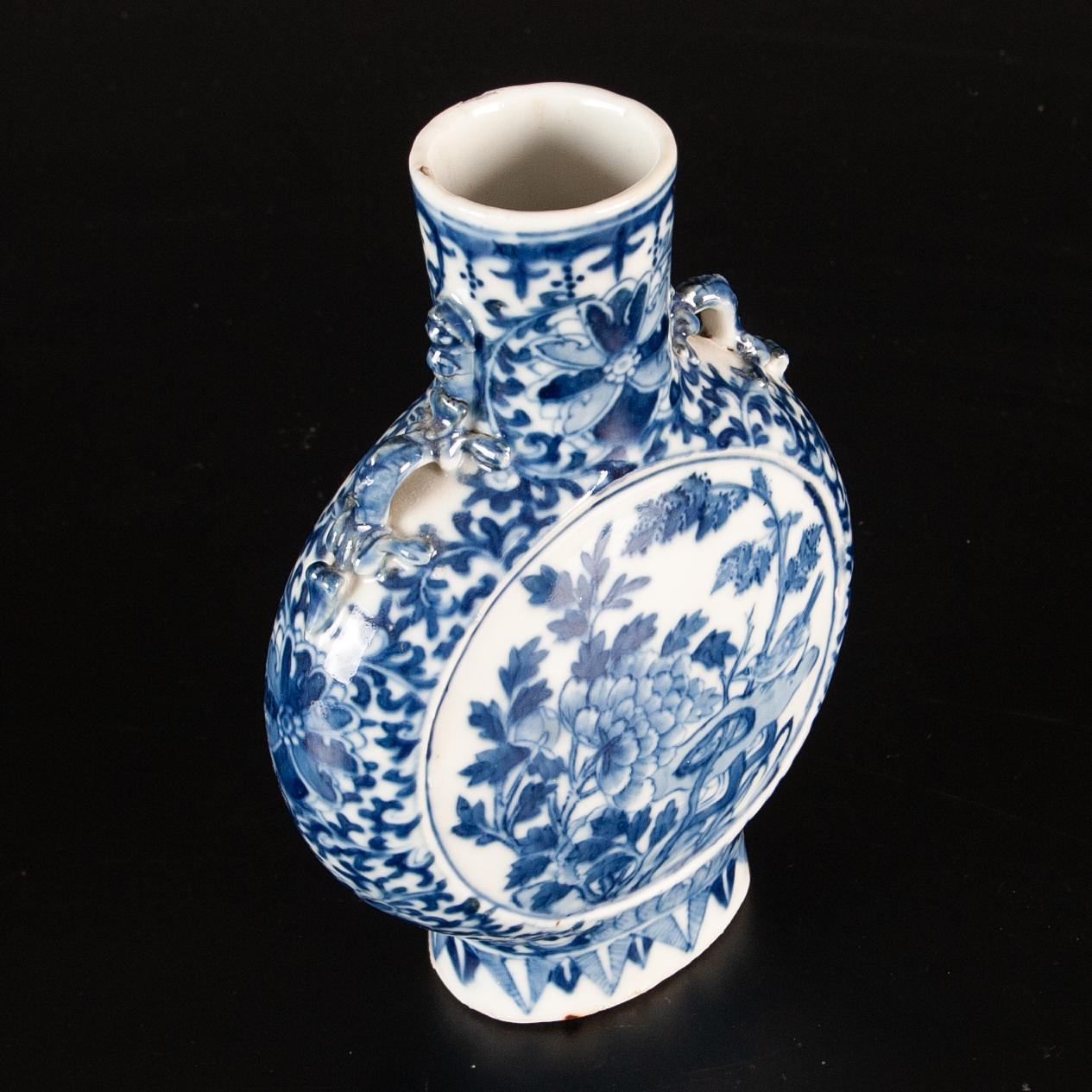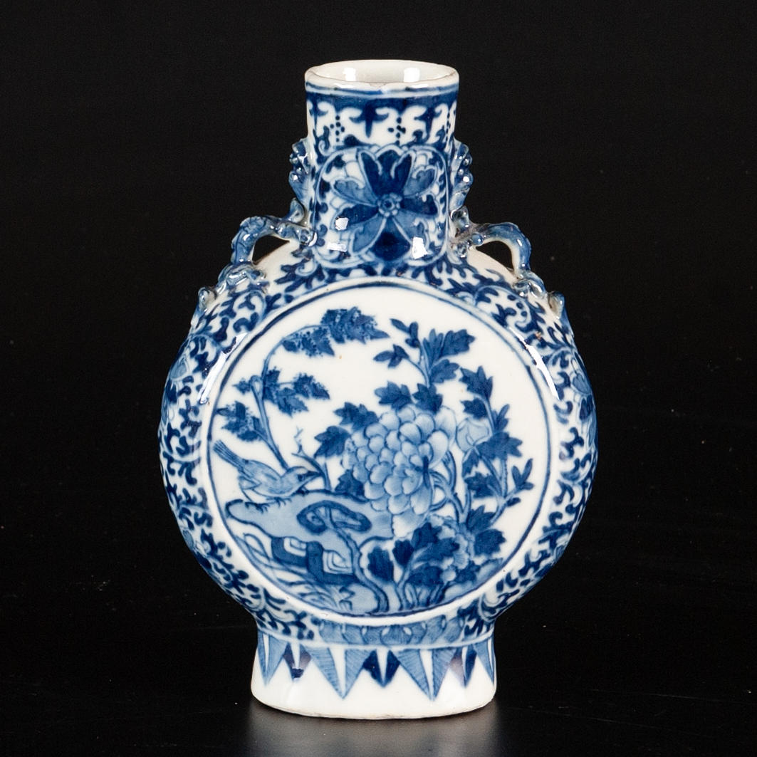 Porcelain with blue underglaze decor of flowers and birds in rounded fields. Height approx. 20 cm.