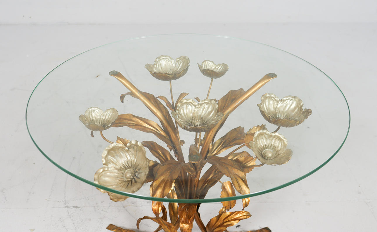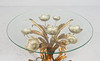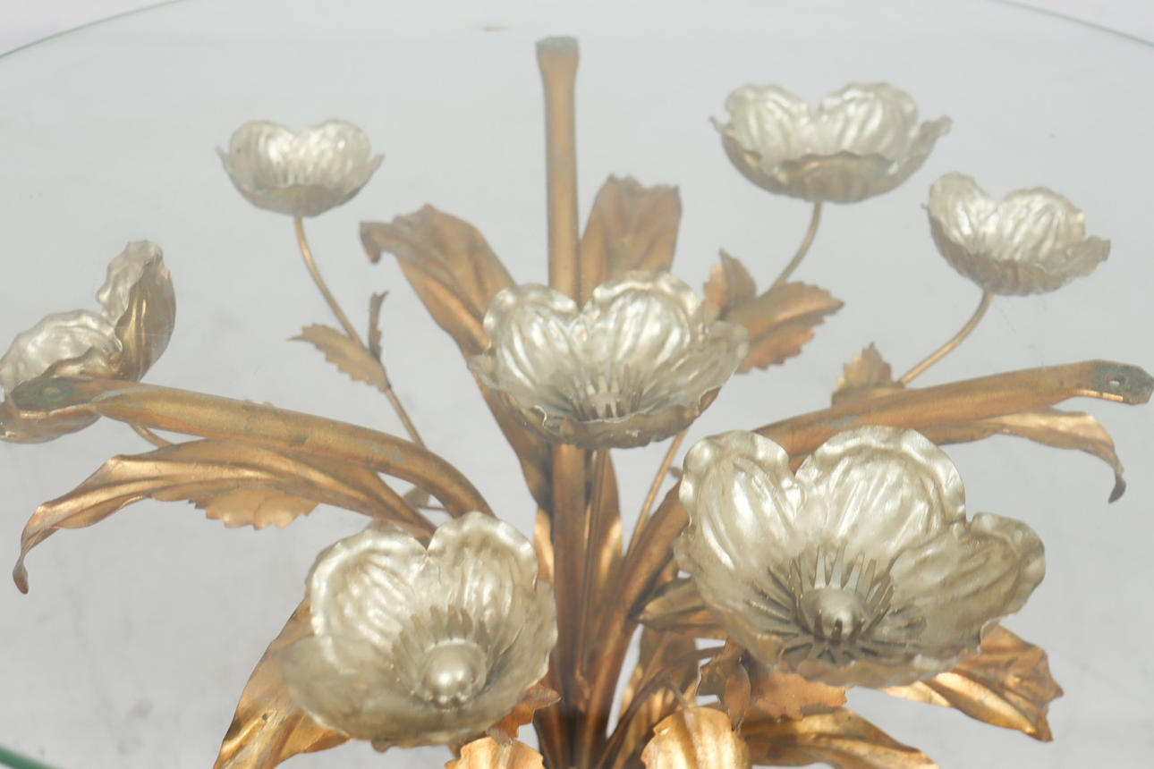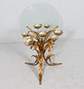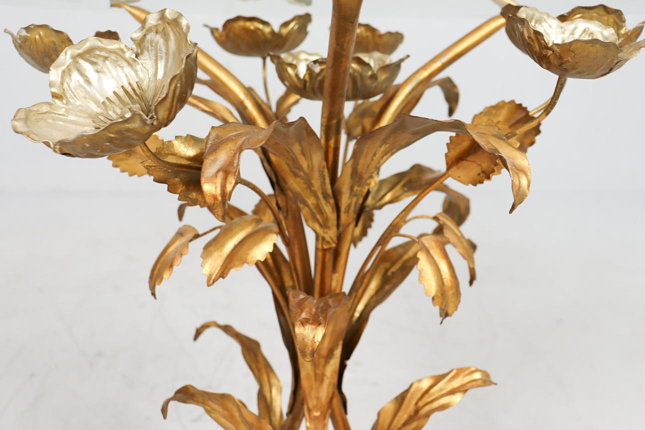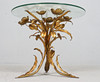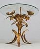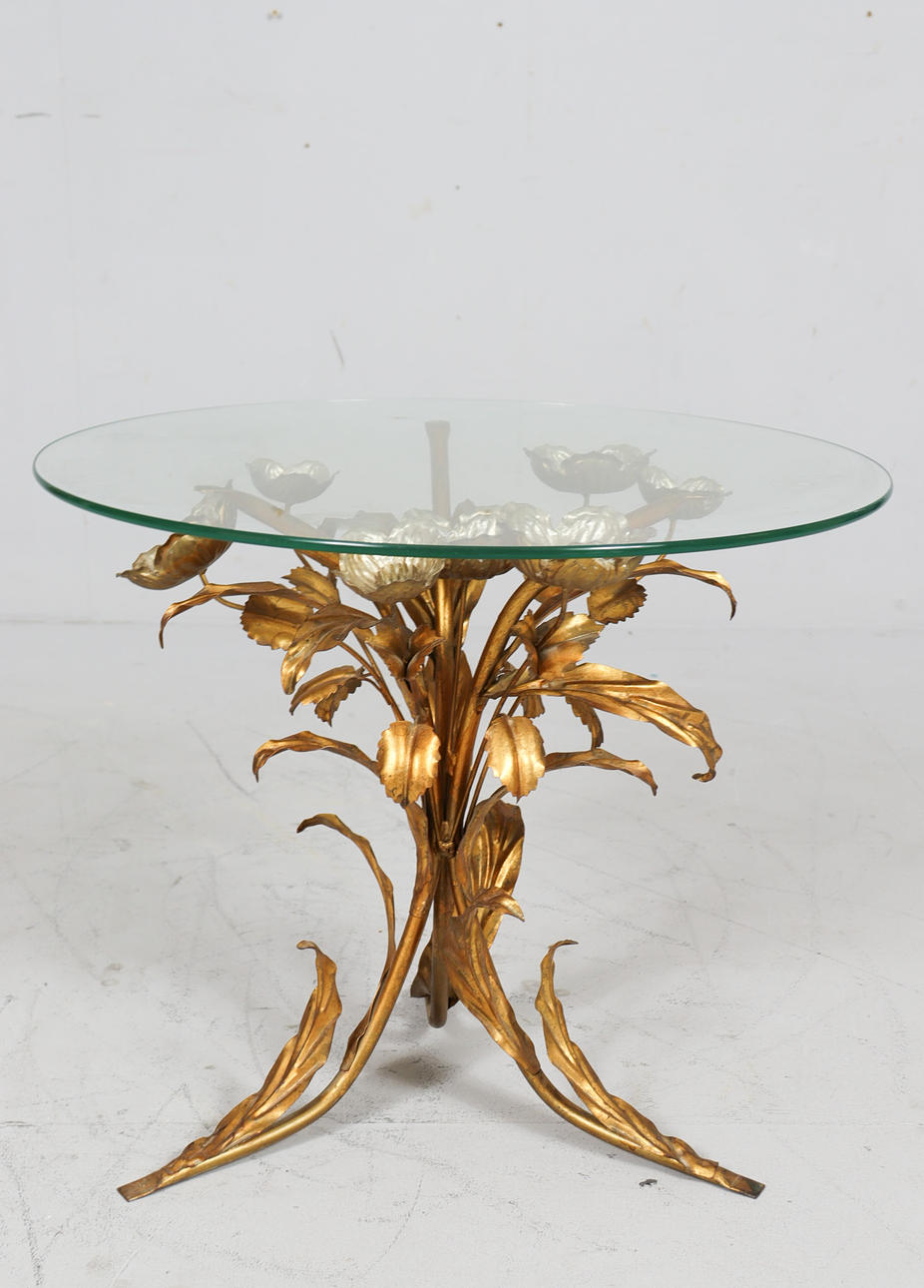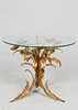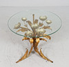 Side table/coffee table, 1970s/Hollywood Regency, construction with a sculptural brass/ gold leaf base with a round, loose glass top,