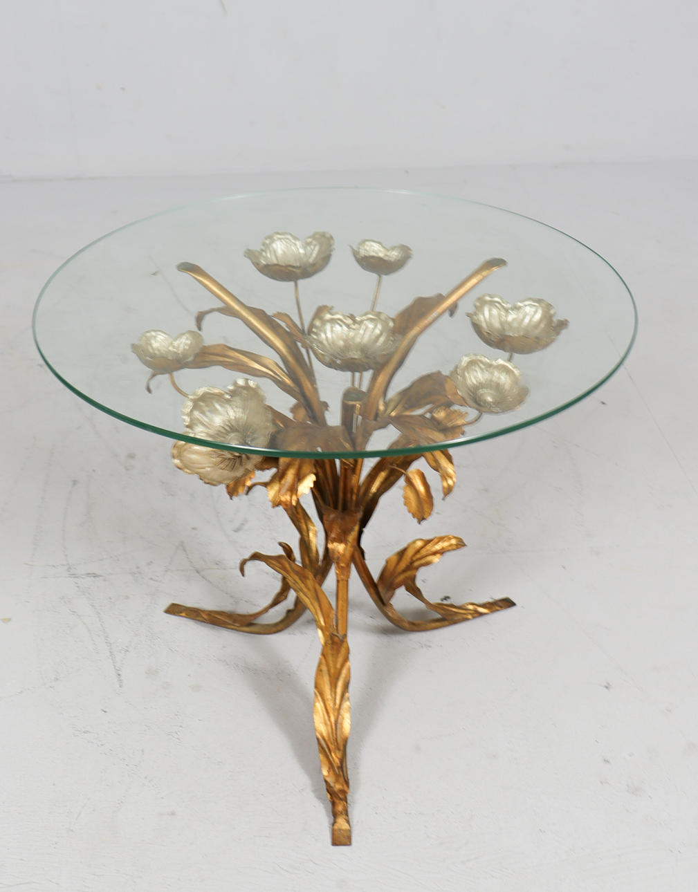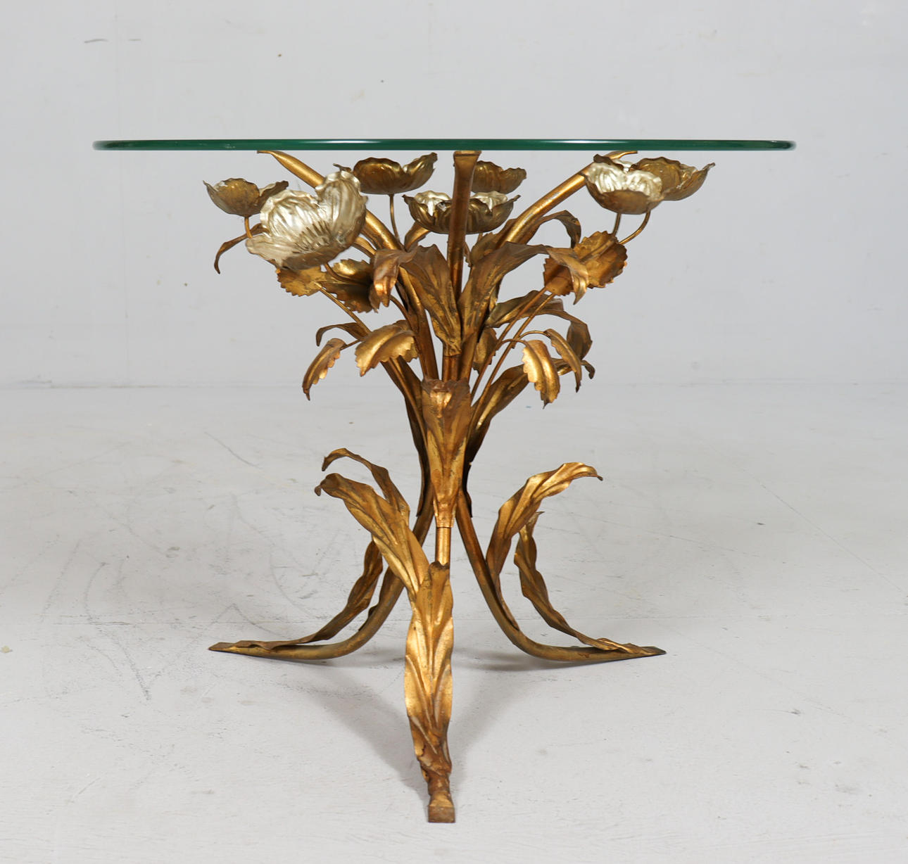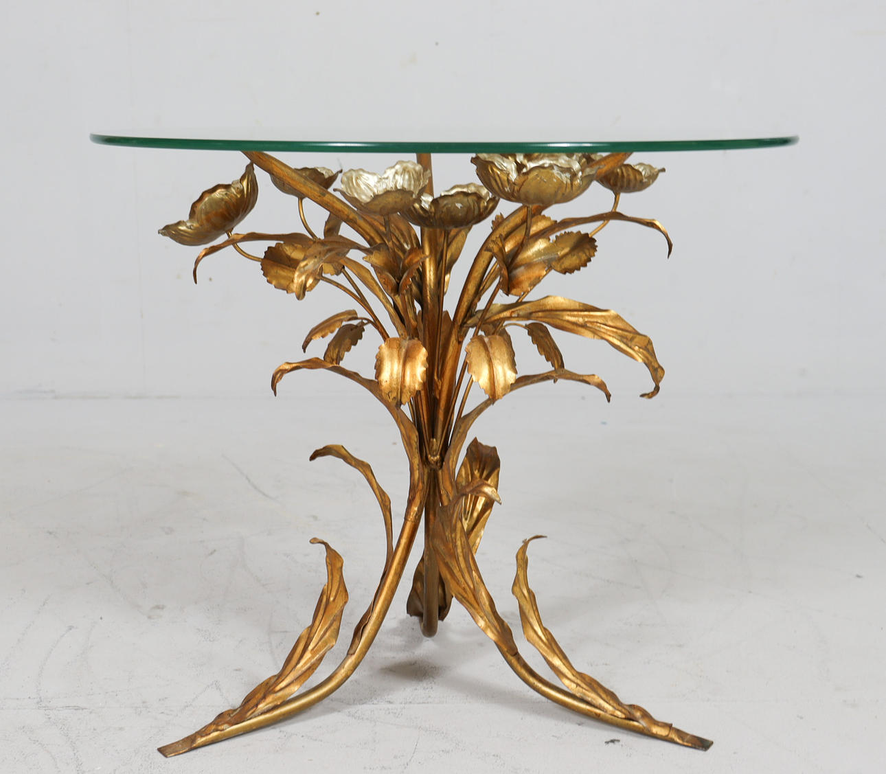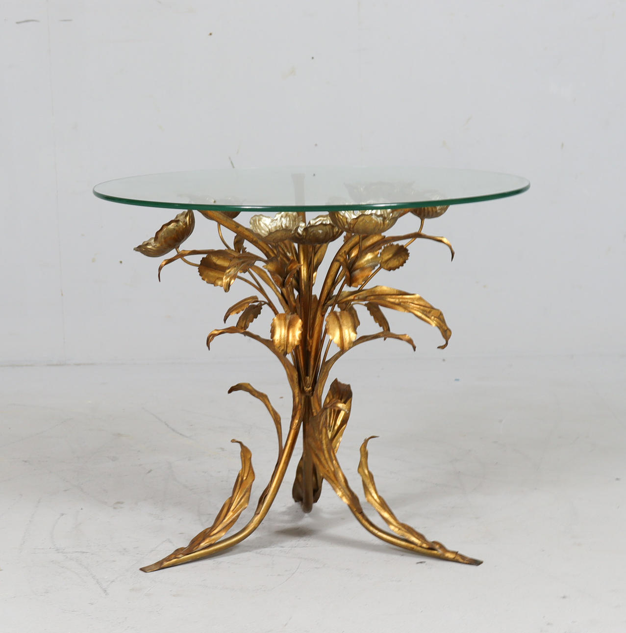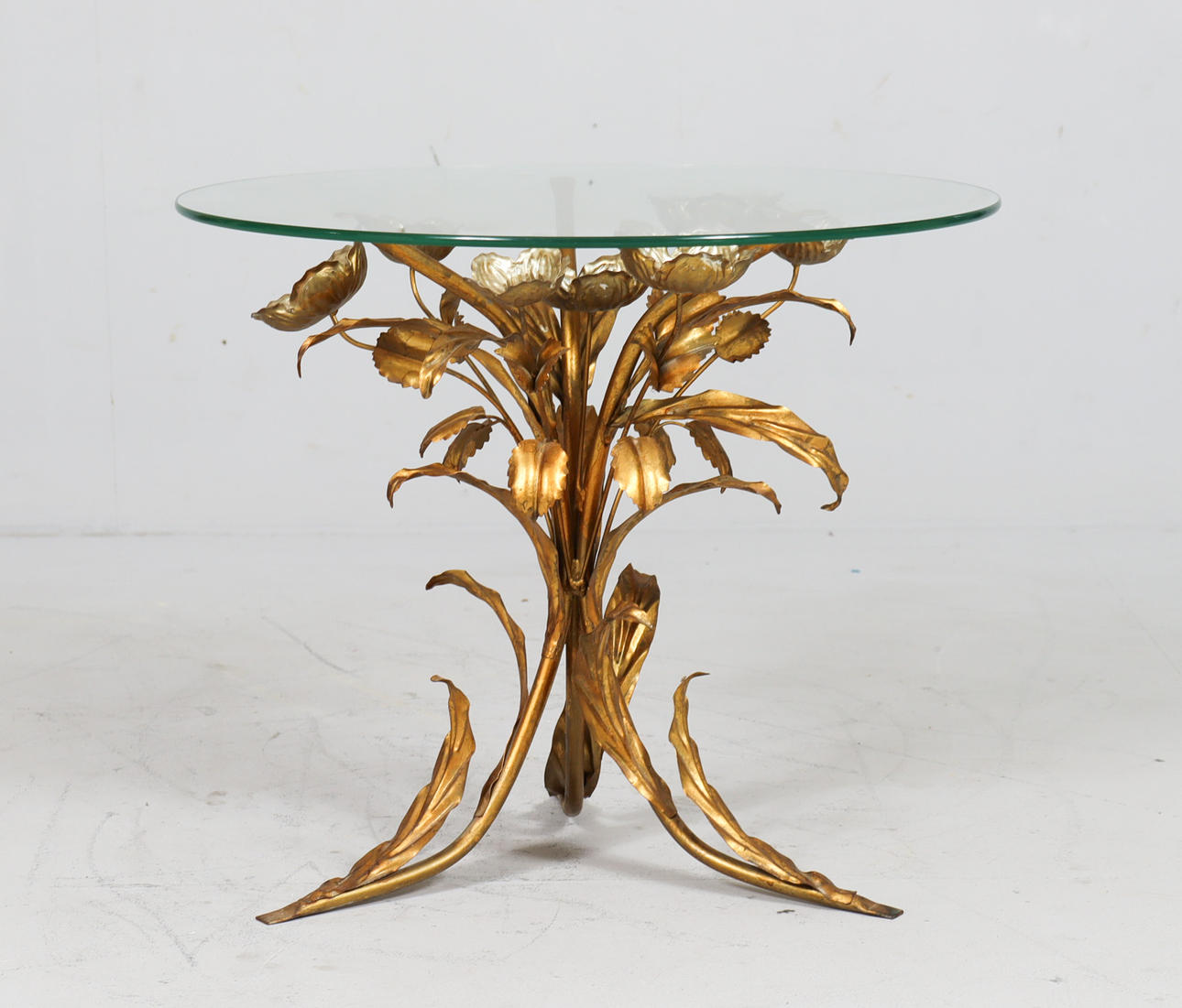 Side table/coffee table, 1970s/Hollywood Regency, construction with a sculptural brass/ gold leaf base with a round, loose glass top,