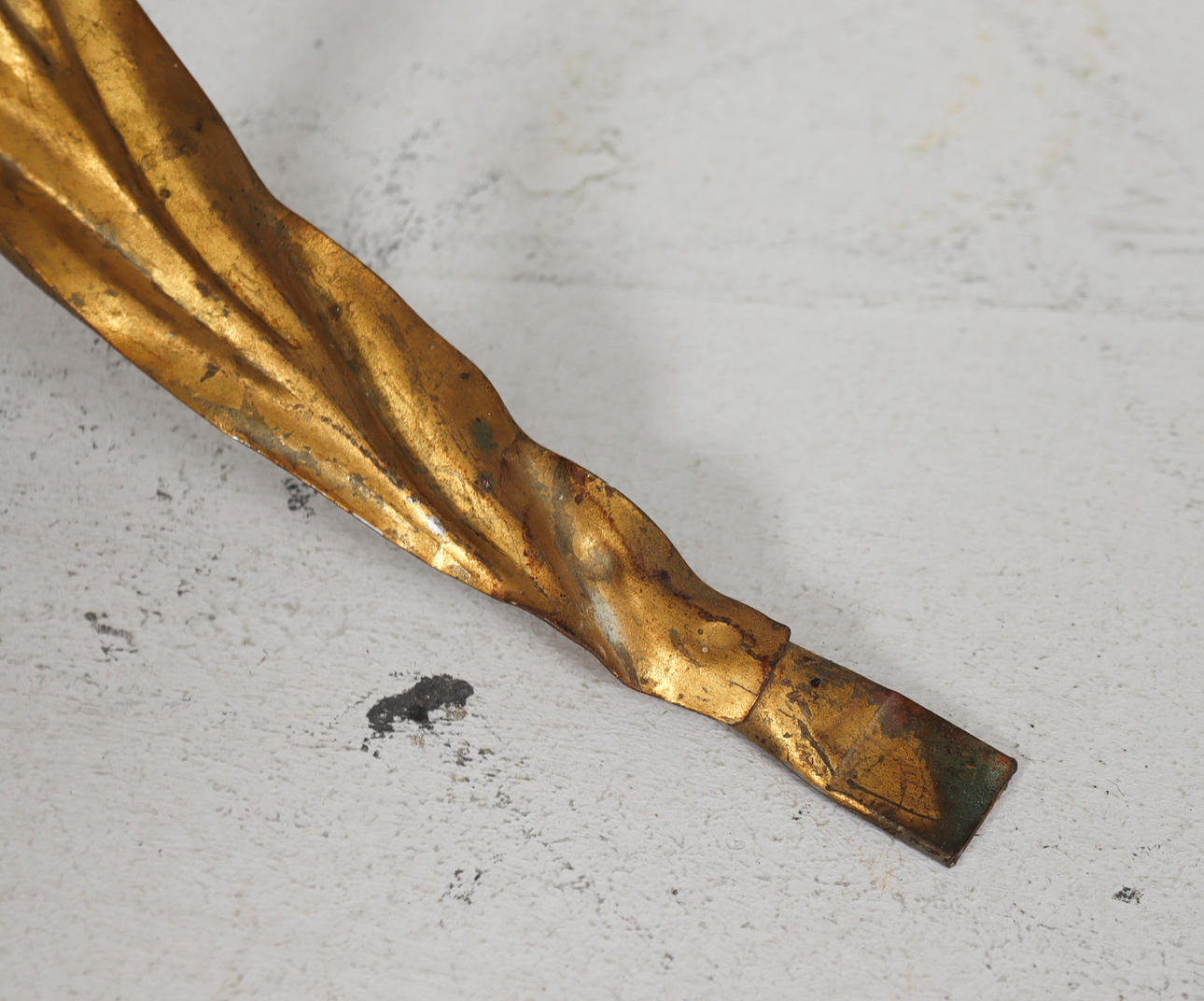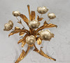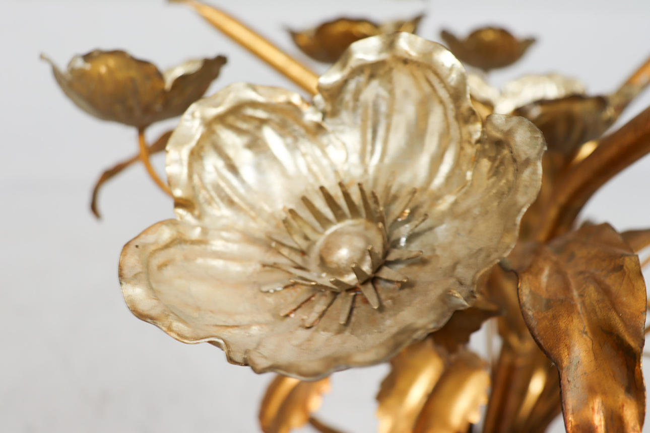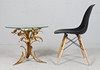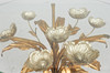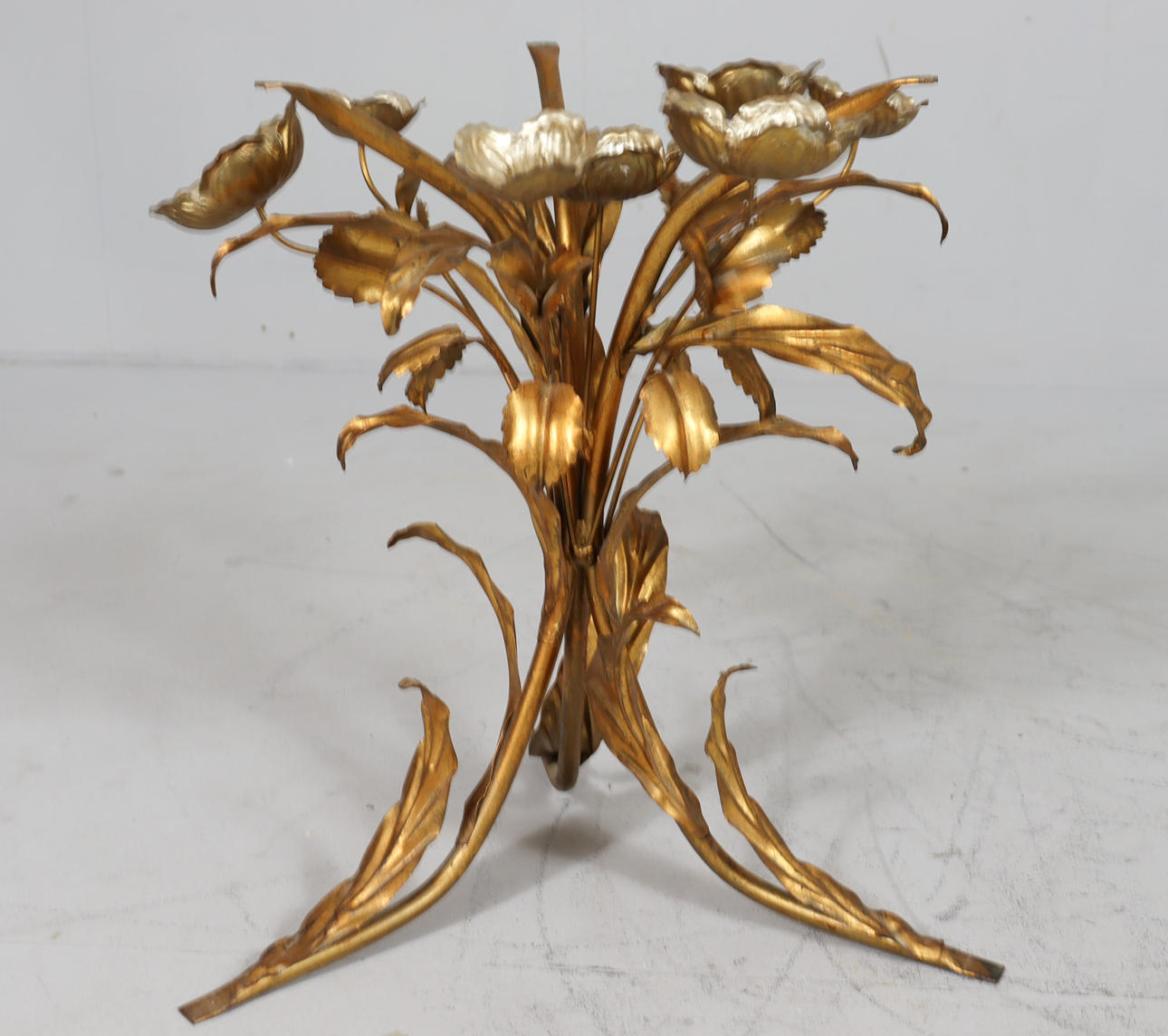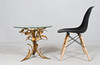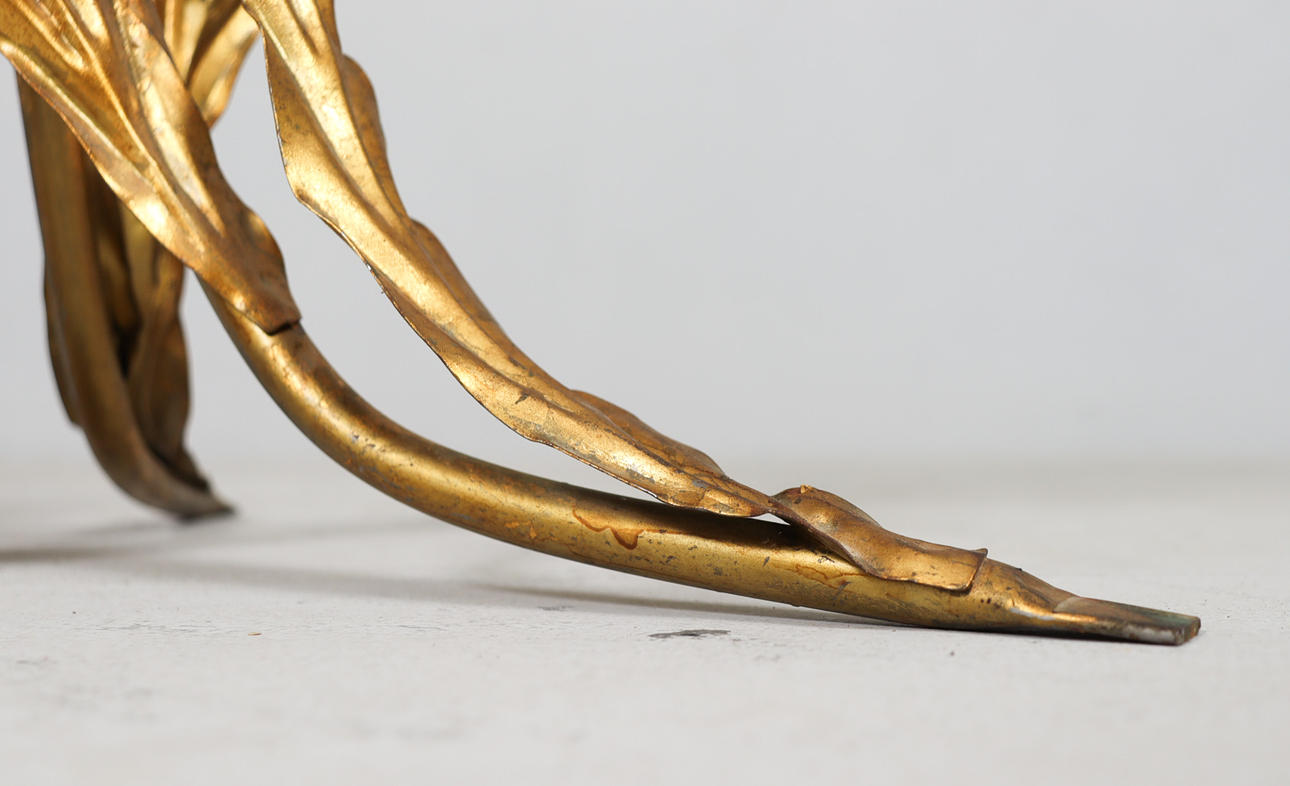 Side table/coffee table, 1970s/Hollywood Regency, construction with a sculptural brass/ gold leaf base with a round, loose glass top,