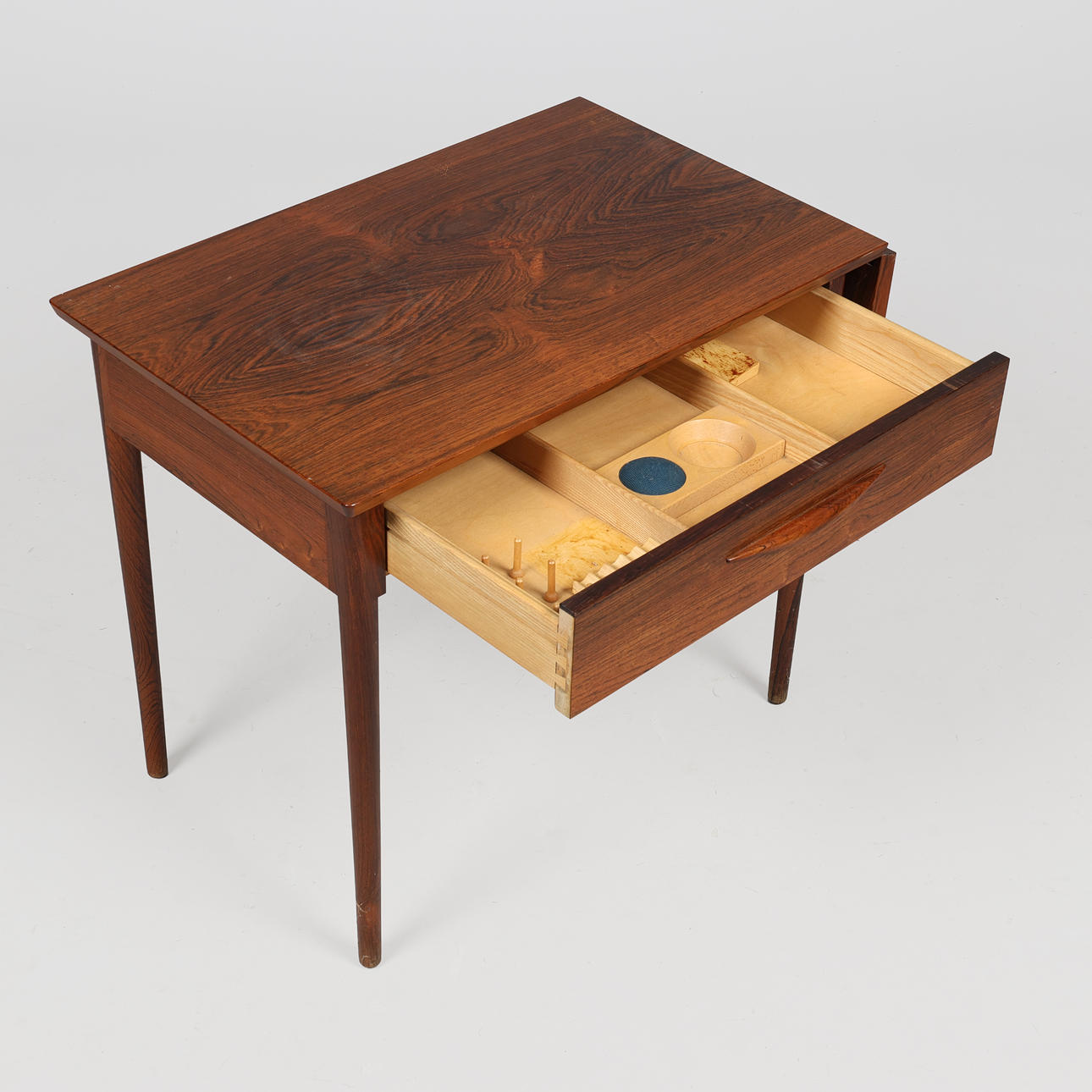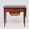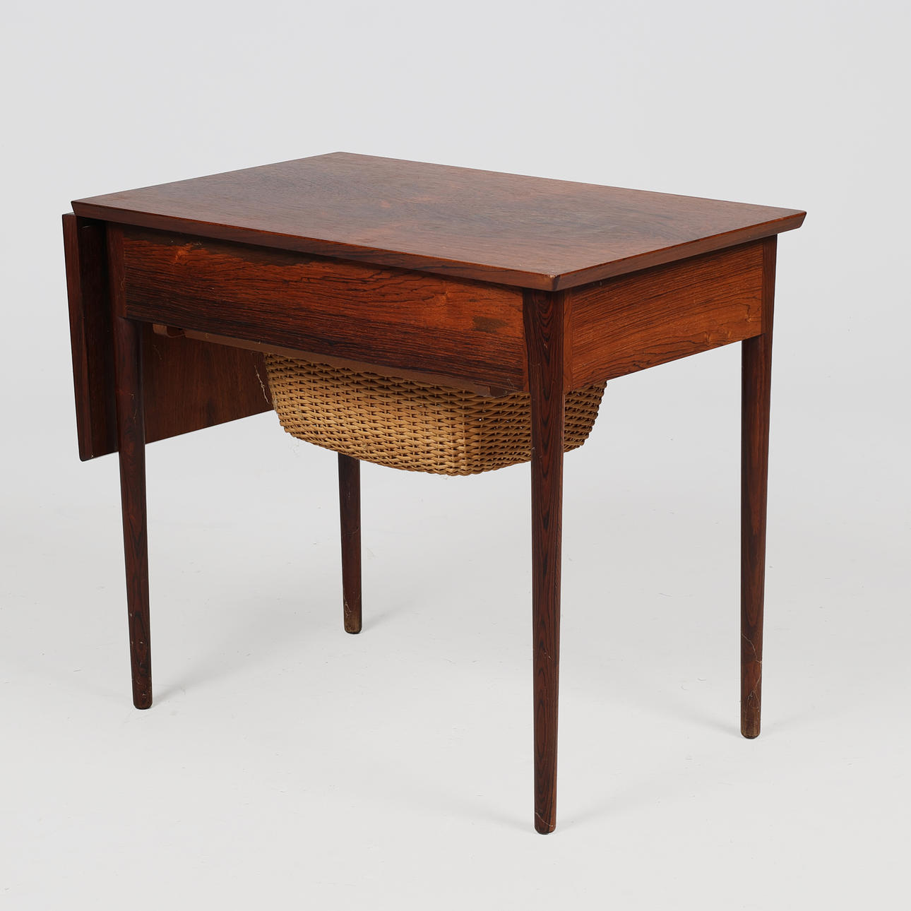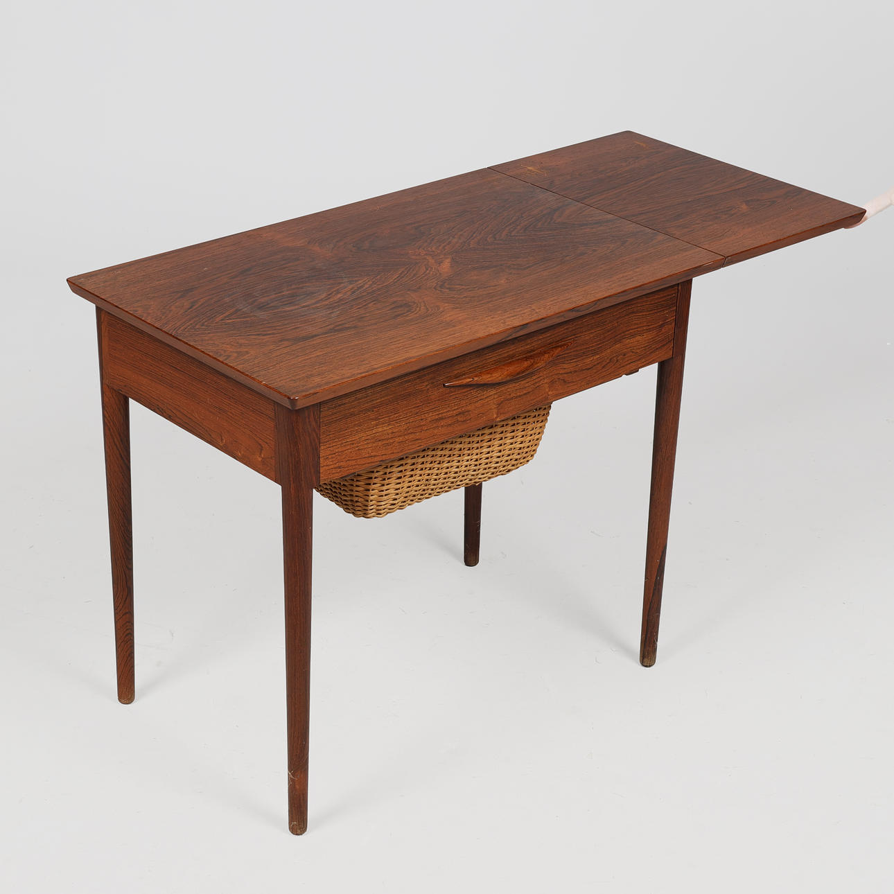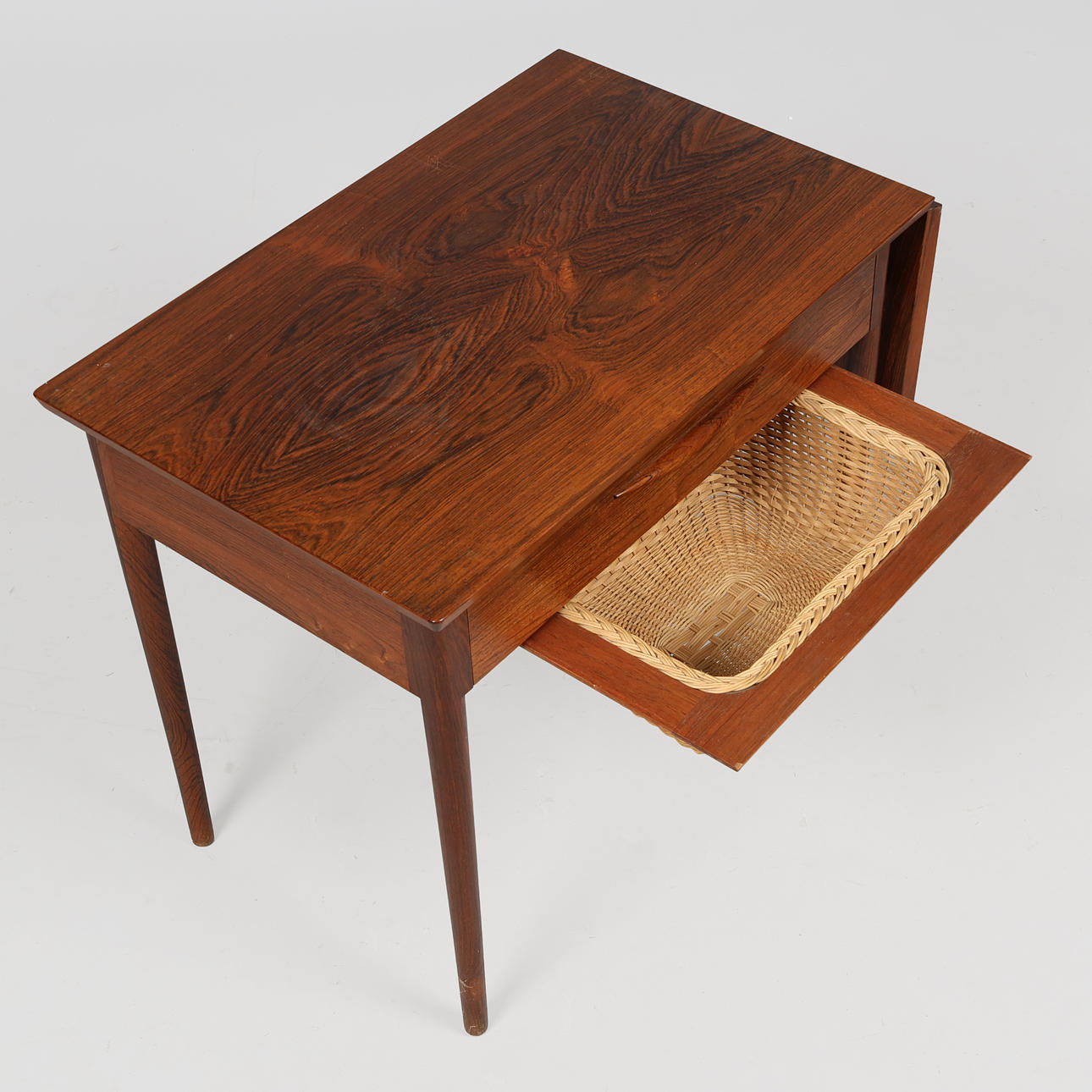 Danish cabinetmaker, rosewood sewing table with tapered legs, drawer with sewing decor, flap and basket for sewing clothes. 1960s. H.56.5 x 65 x 42 cm, knocked out with flap length 92 cm.