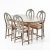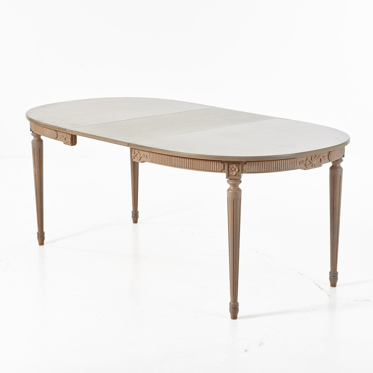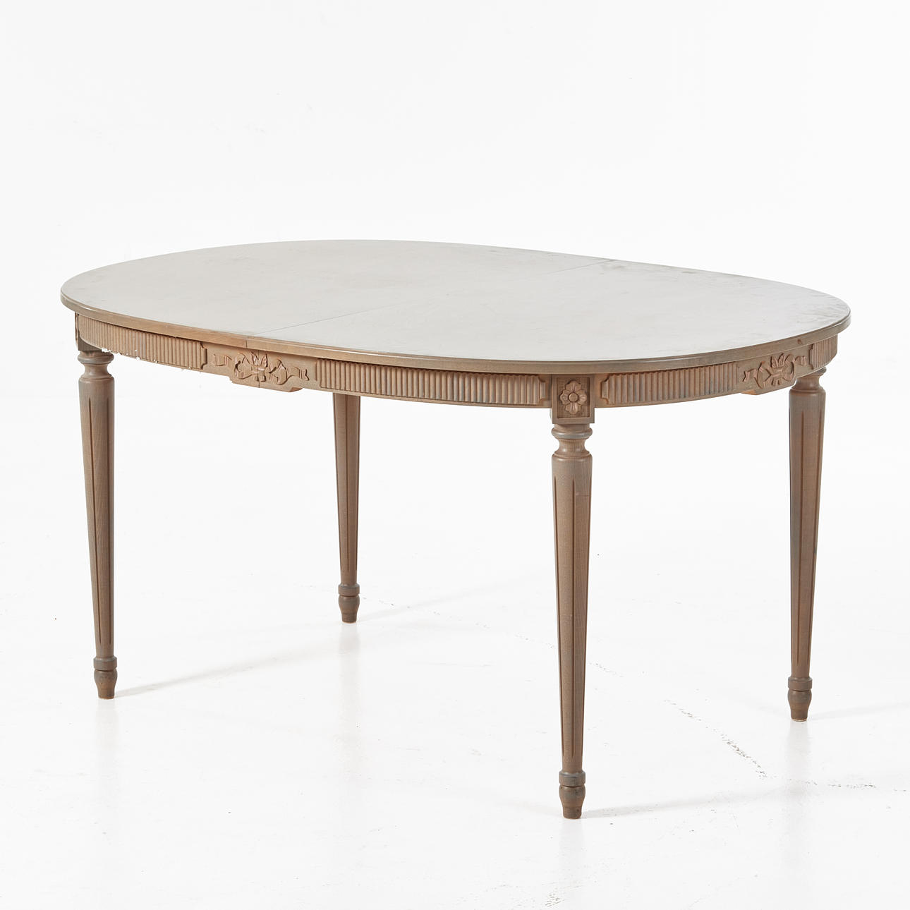 4448175. DINING ROOM GROUP, 5 dlr, Gustavian style, grey stained, cut decor, table with 1 loading top, 4 chairs with textile upholstered loose seats, second half of the 20th century.