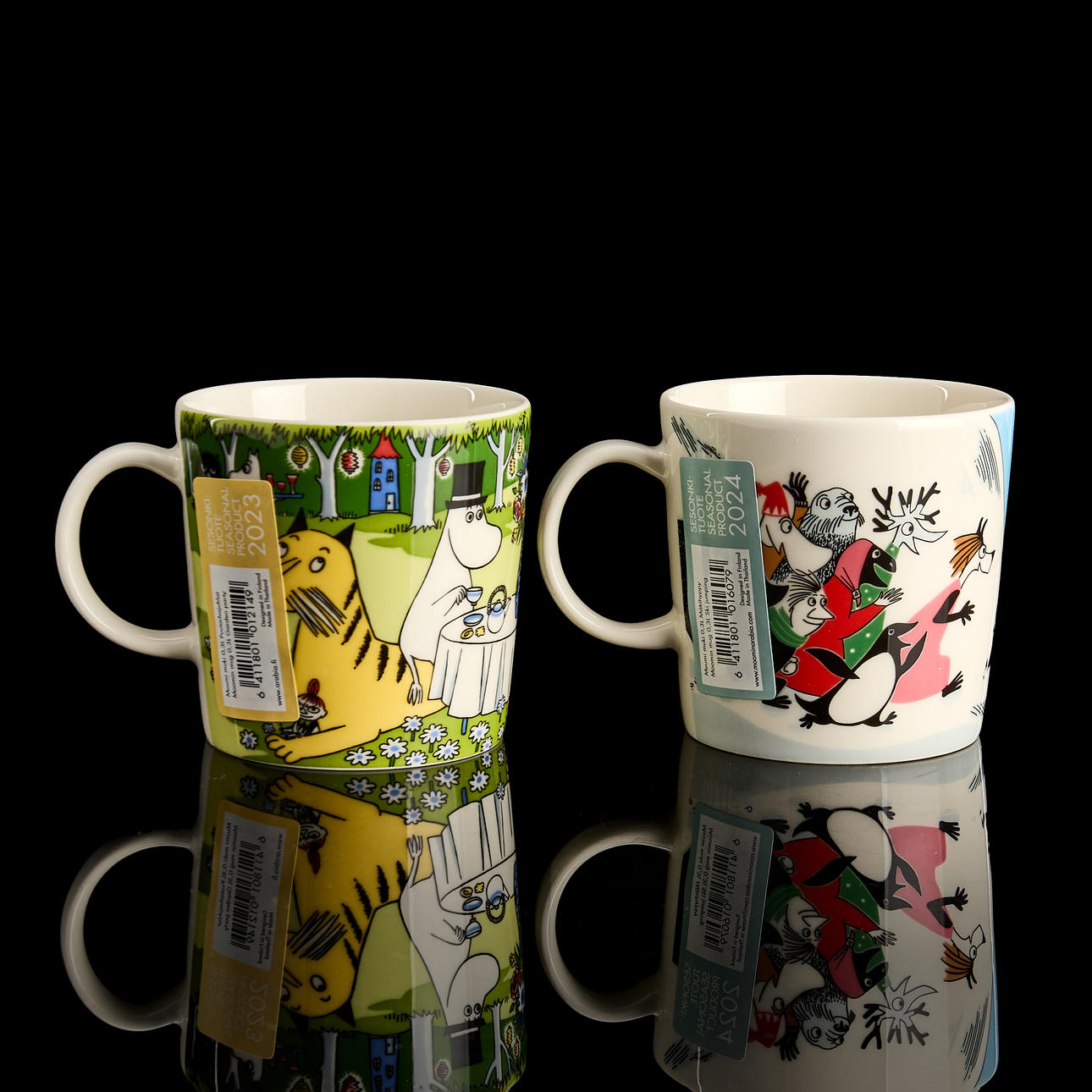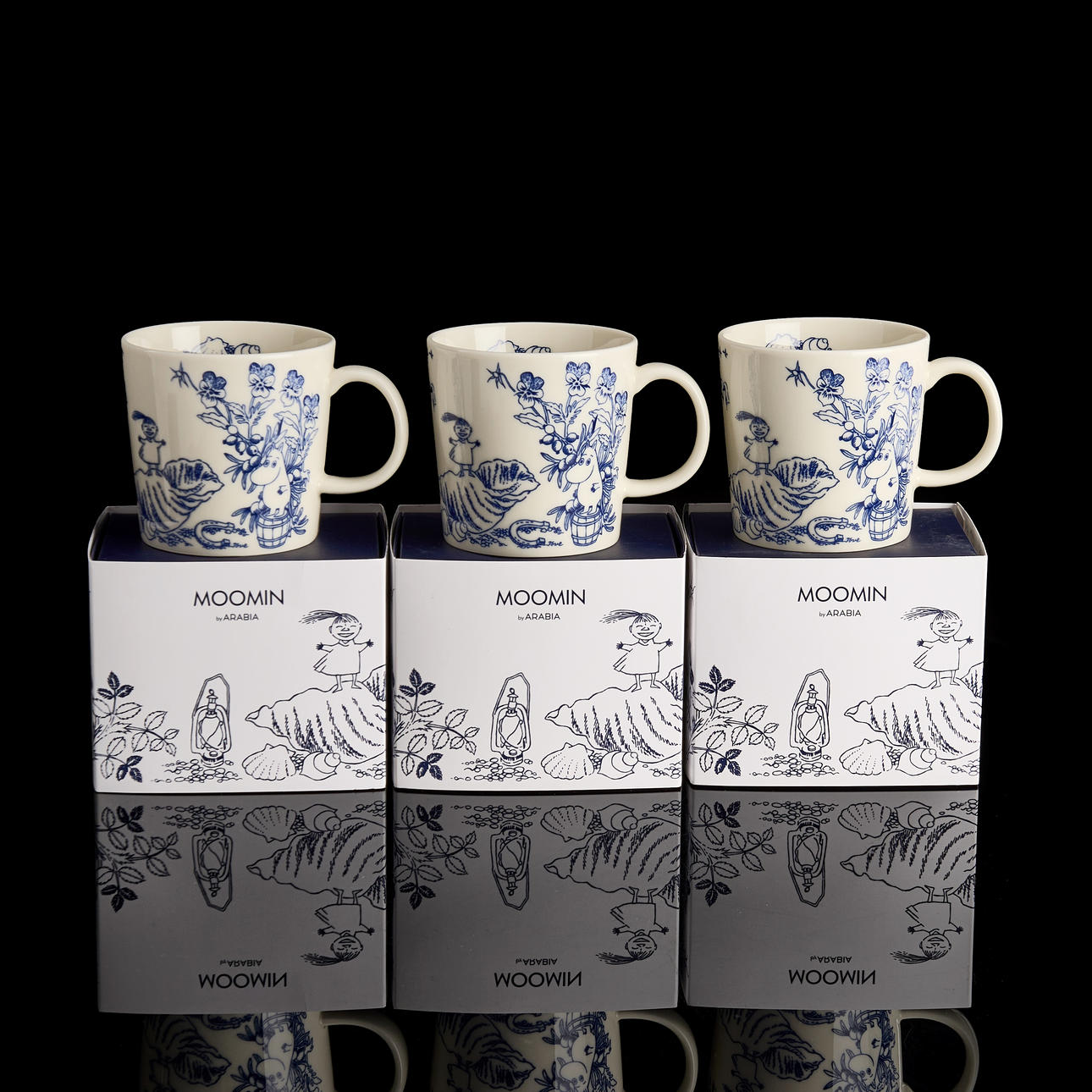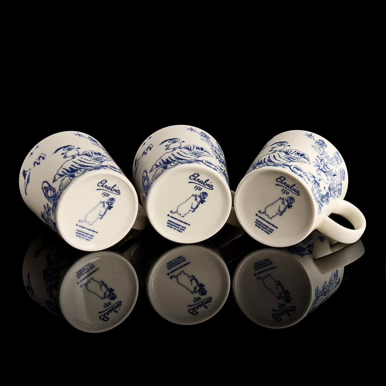 1 mug, “Garden Party” (2023). Height 8 cm 1 mug, “Ski Jumping” (2024). Height 8 cm 3 mugs, “Sea Breeze” (2023), with cartons. Height 8 cm.