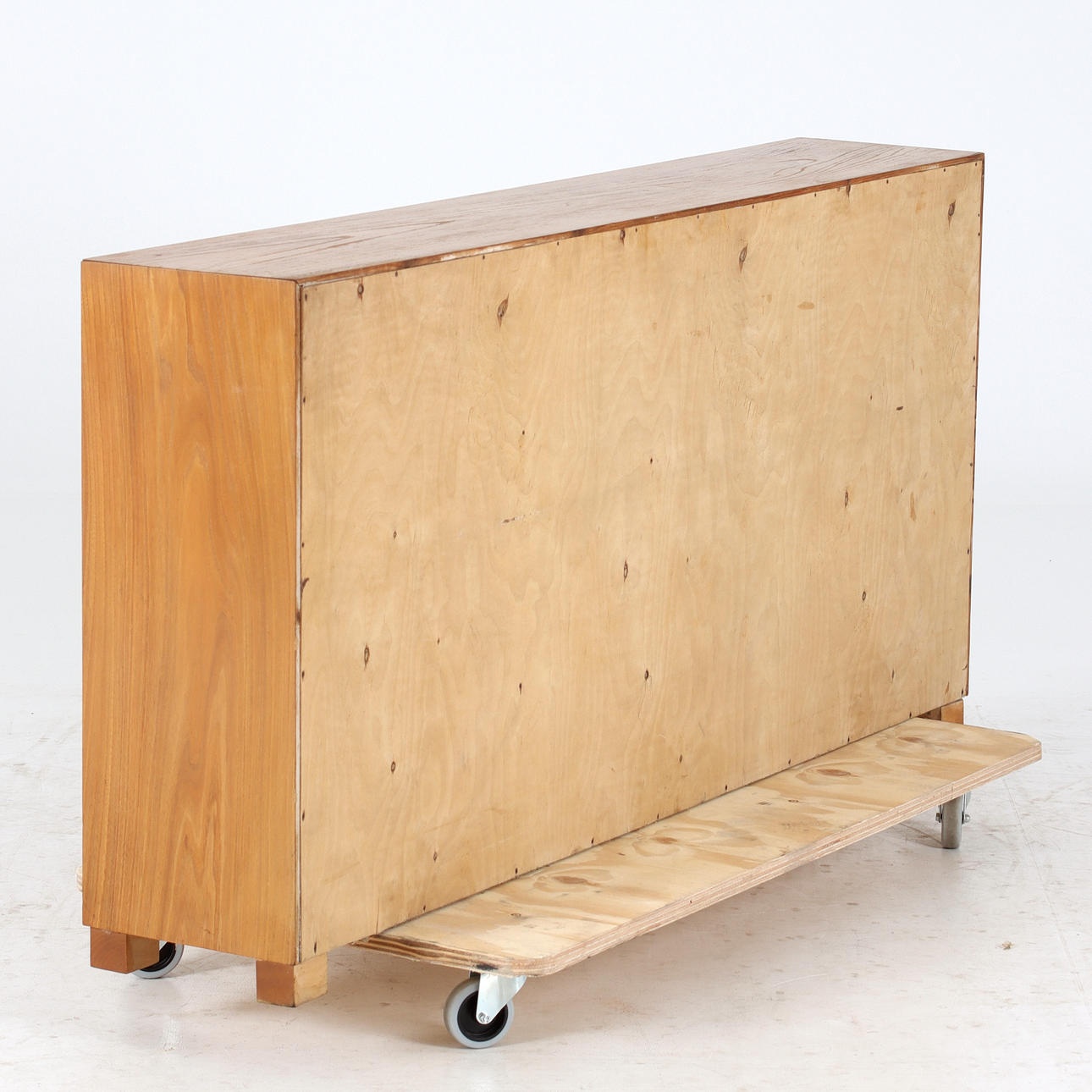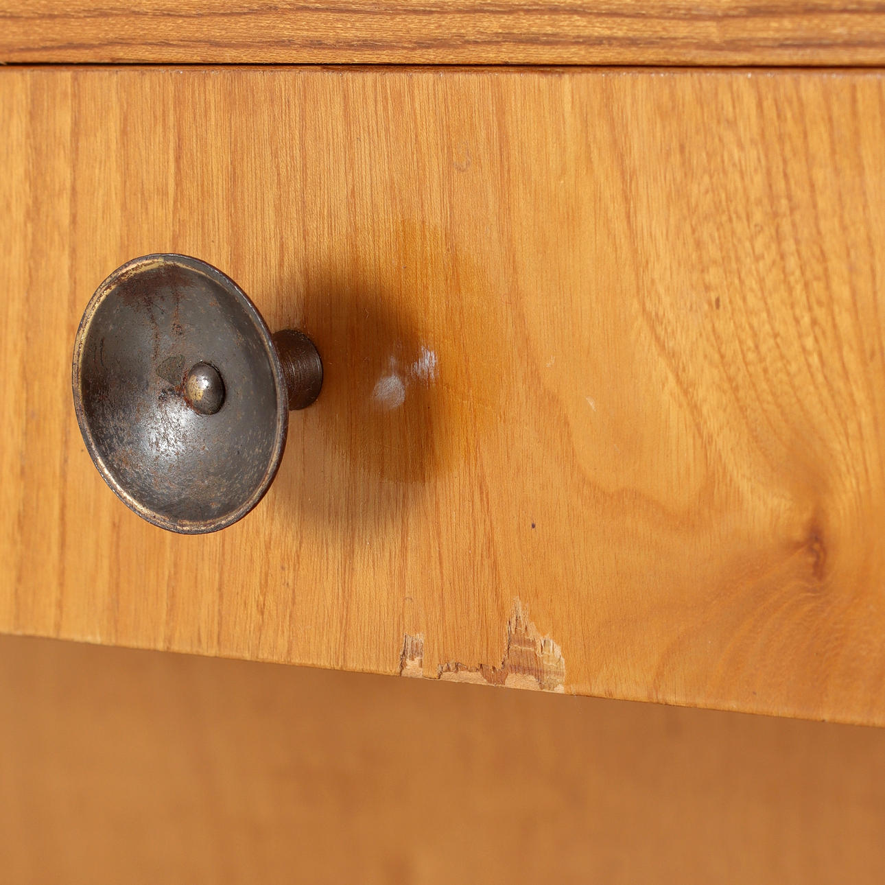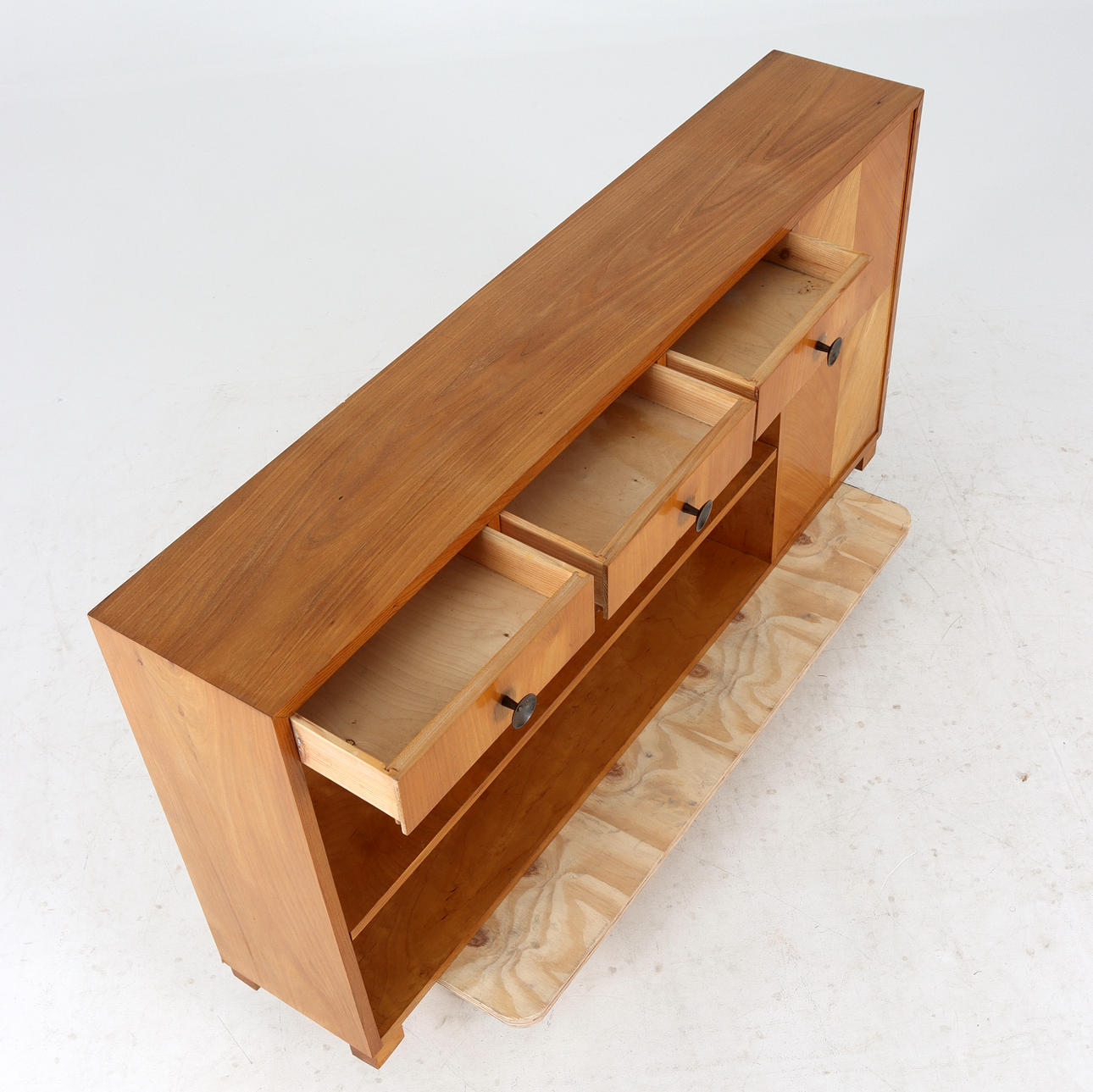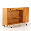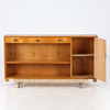 Length 150, width 27, height 75 cm. Three drawers, a shelf and a cabinet with a back shelf.