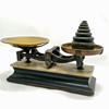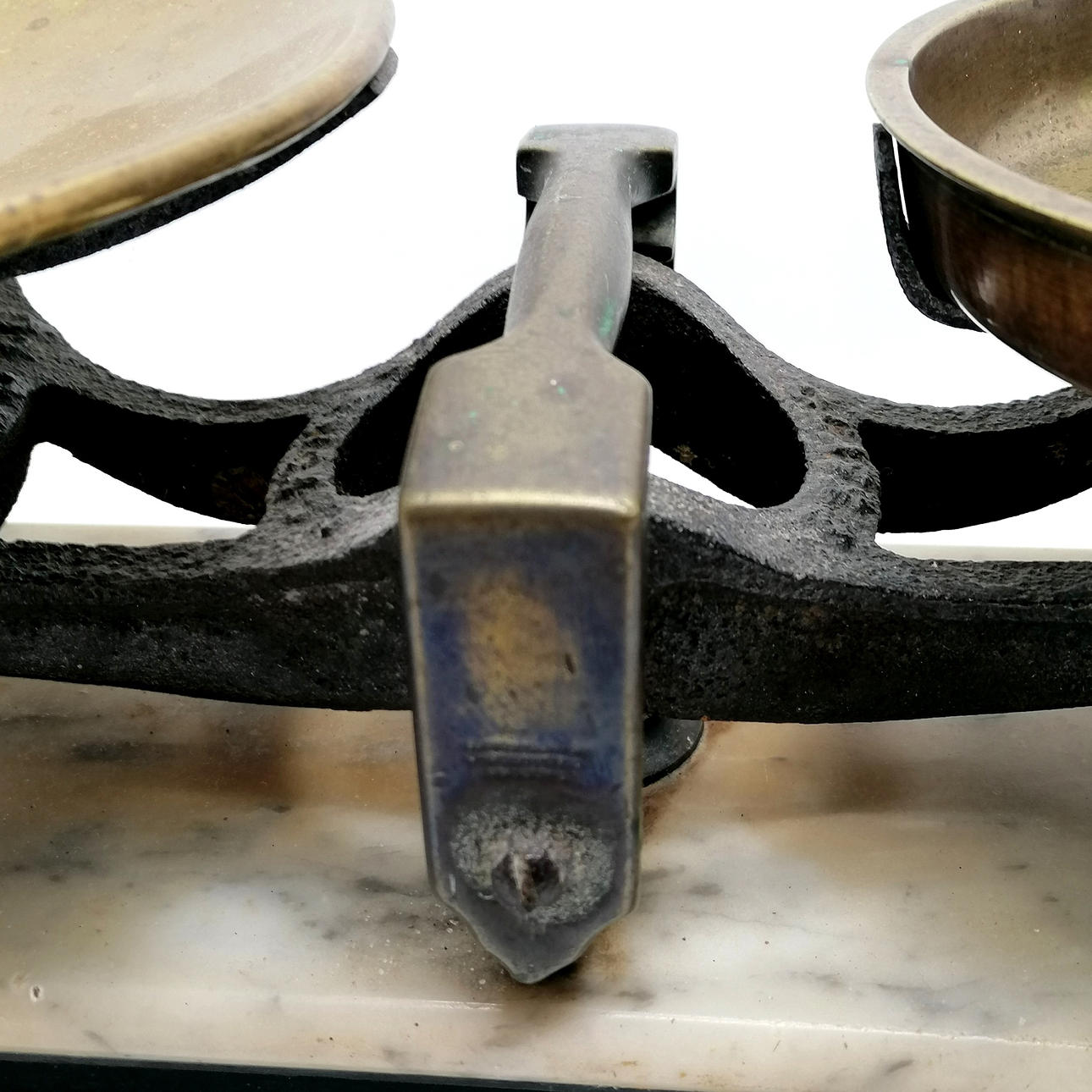 Parnall & Sons (Narrow wine st, Bristol) antique balance scales with wooden base & marble detail with registration mark and with weights - 40cm x 16cm.