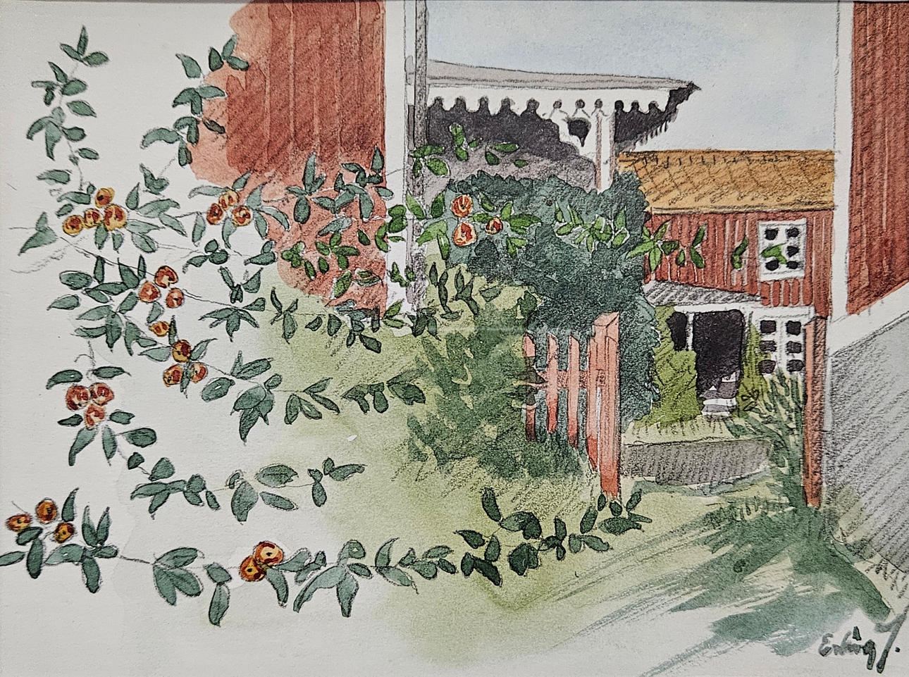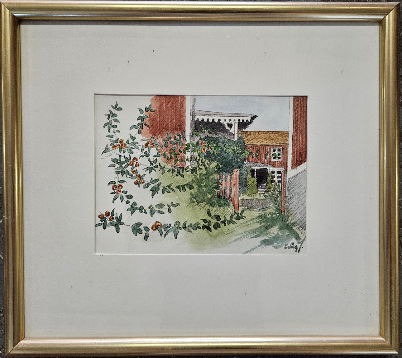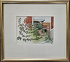 “Summer day in Lund village”, image size approx. 14x18 cm, wooden frame with glass, approx. 31x35 cm.