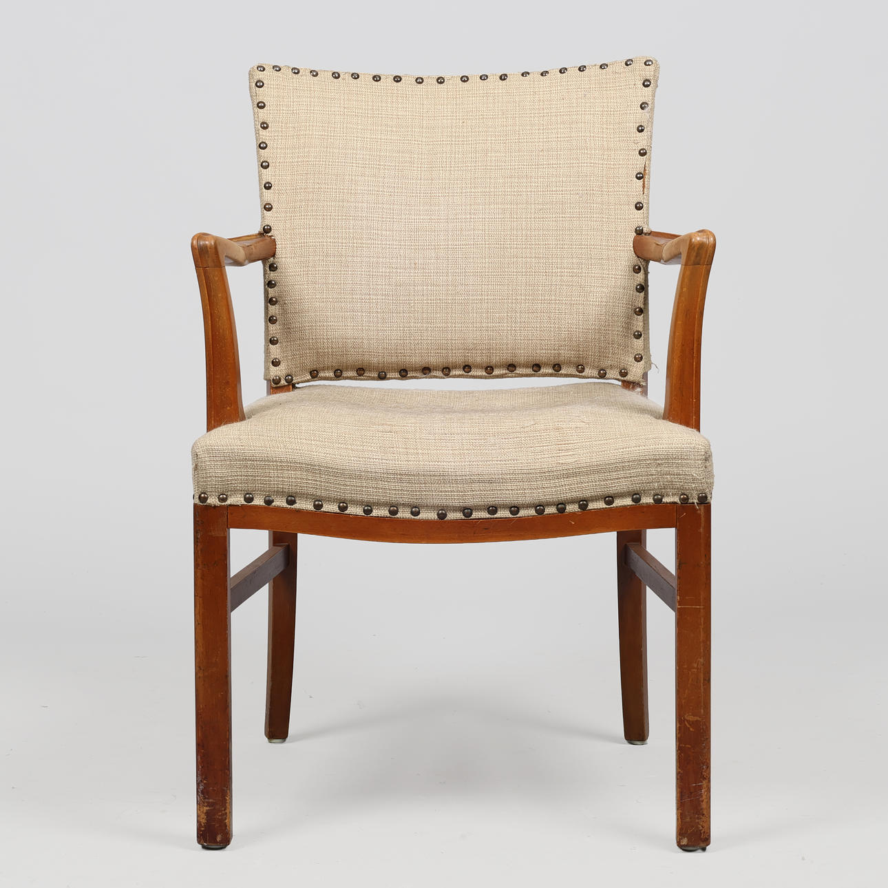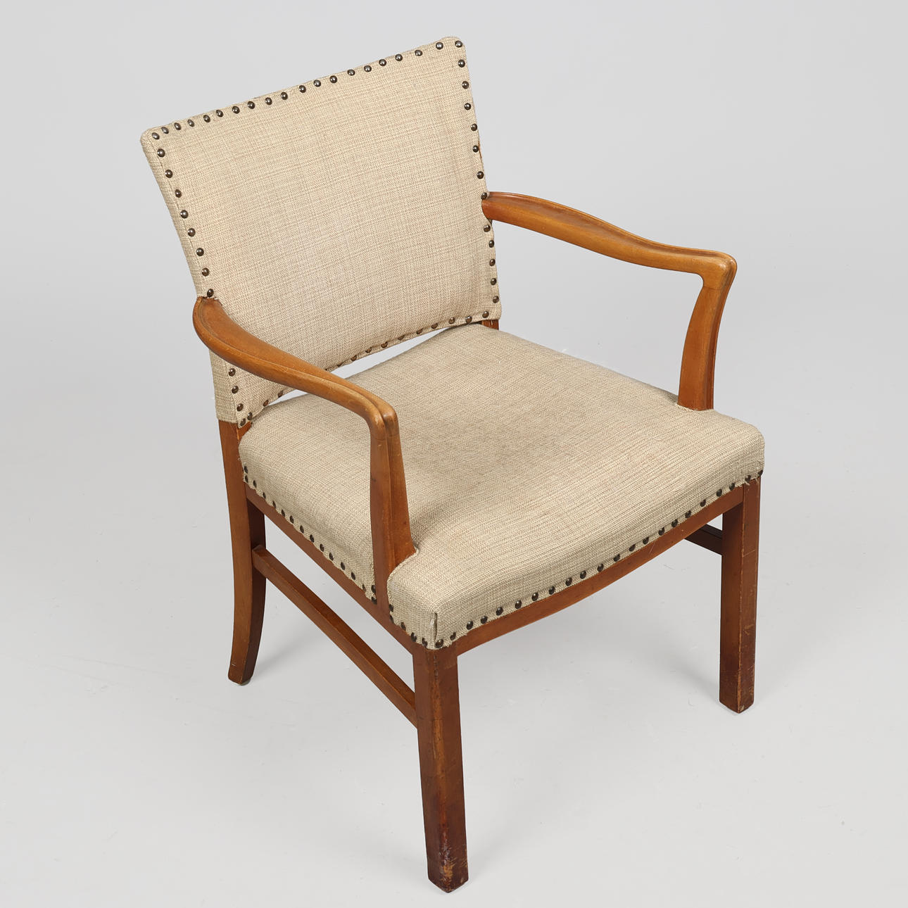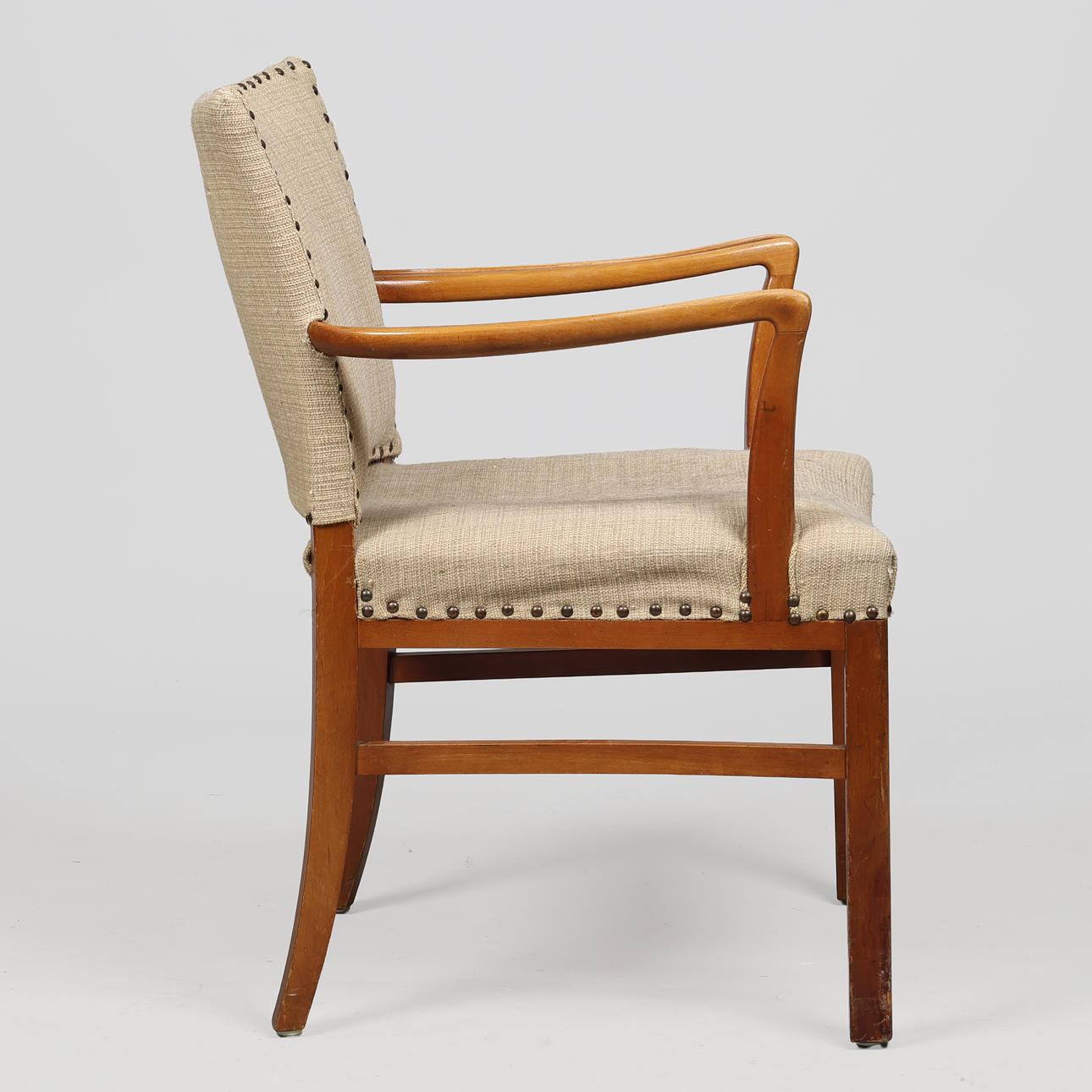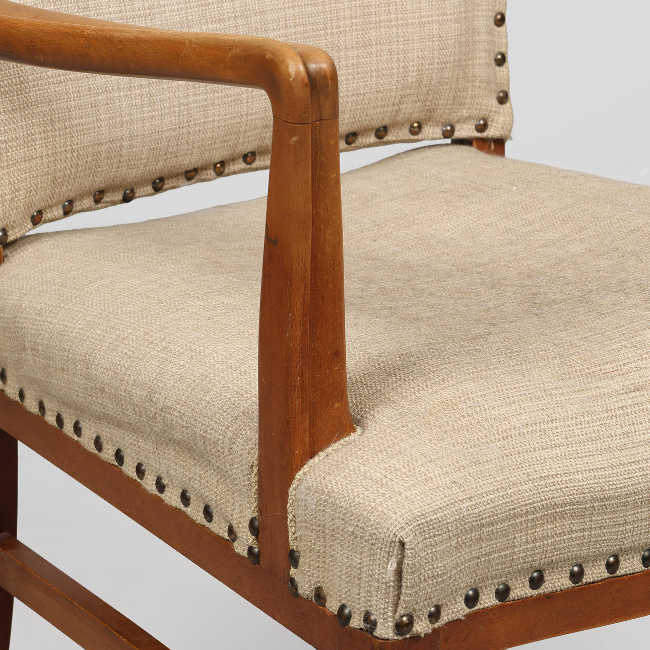 Armchair with solid, lacquered beech wood frame and seat and back upholstered with stitched, heavy woven fabric. Swing armrests with curved edge.