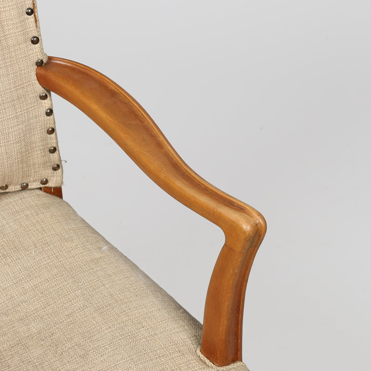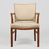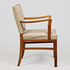 4450249. Danish master carpenter, armchair with curved armrests, solid beech wood and stitched textile, Denmark, 1930/40s.