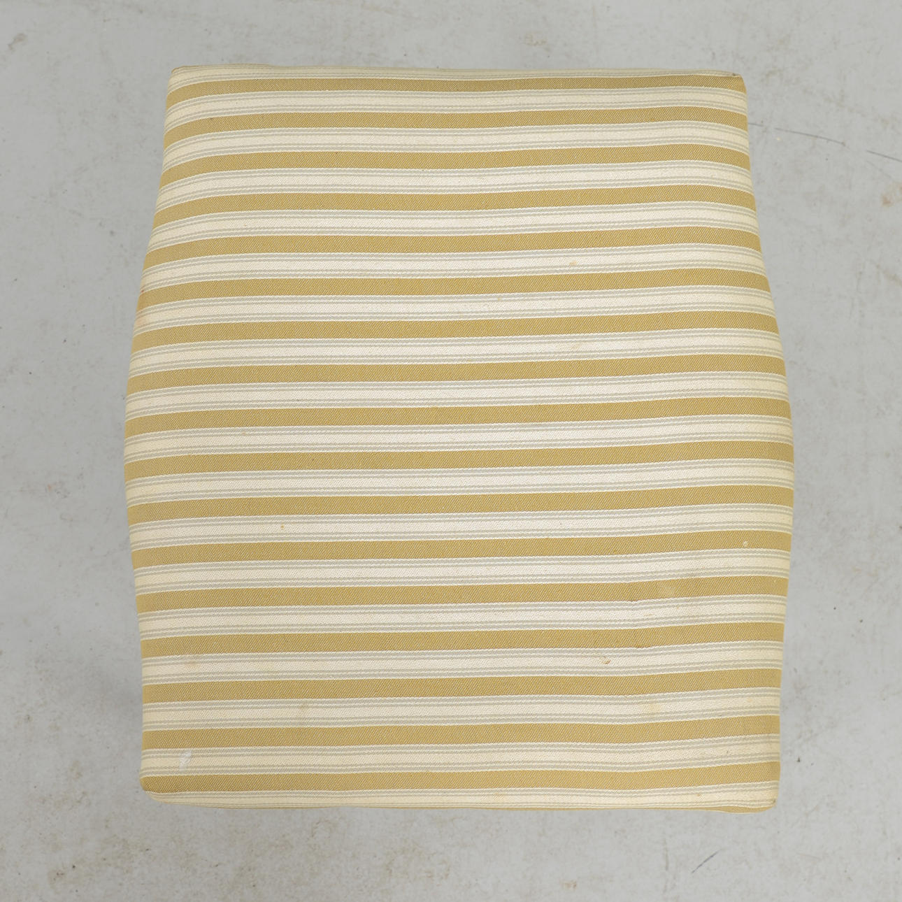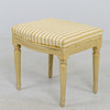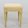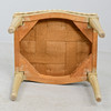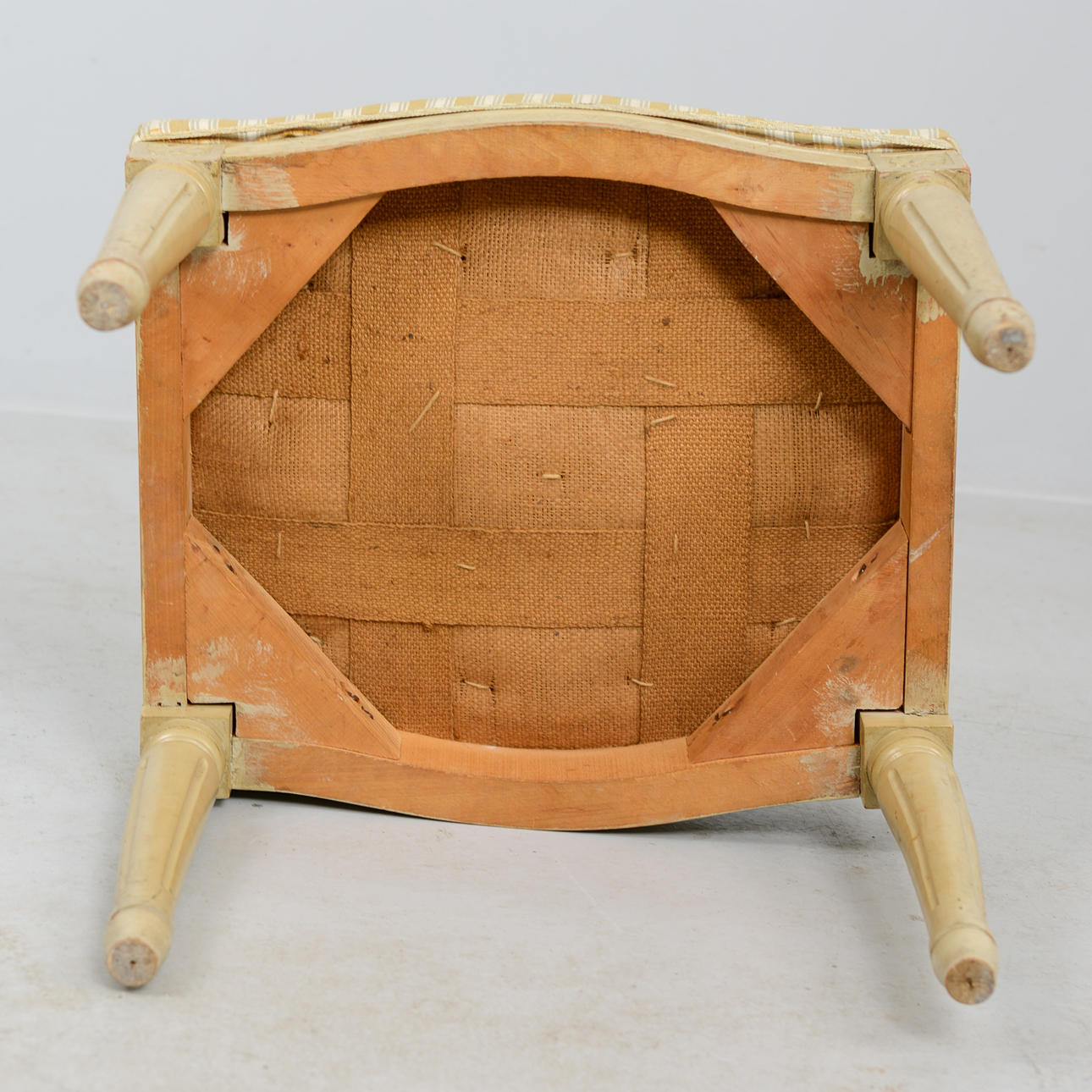 Painted wood and upholstered seat. Normal wear and tear. Marks and color loss on legs.