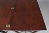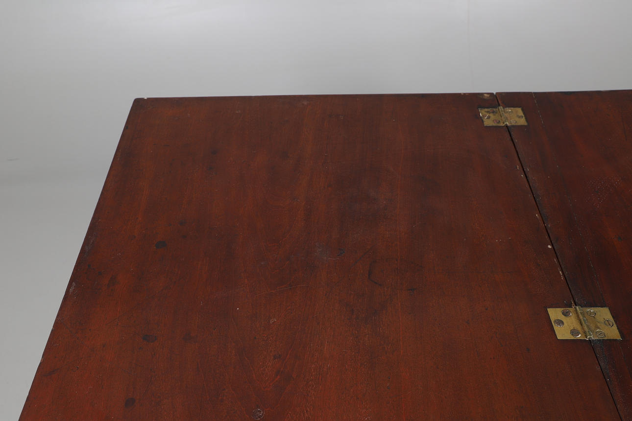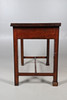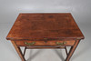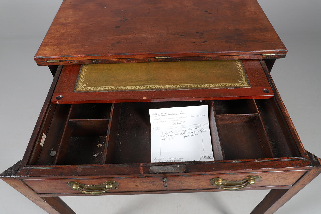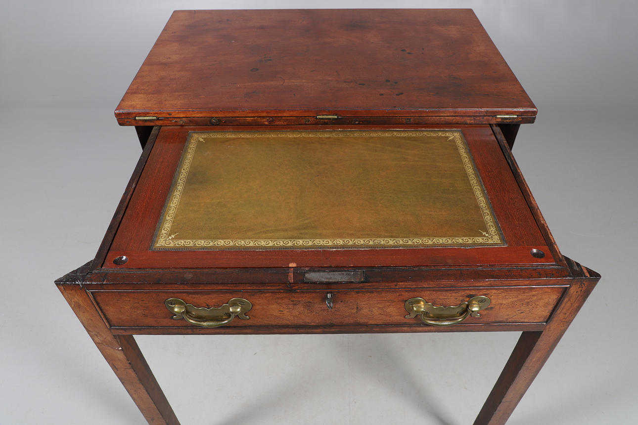 the rectangular hinged top over a fitted frieze drawer with leather-lined slide on split rectangular and column front legs, 80cm high x 91cm wide x 59cm deep.