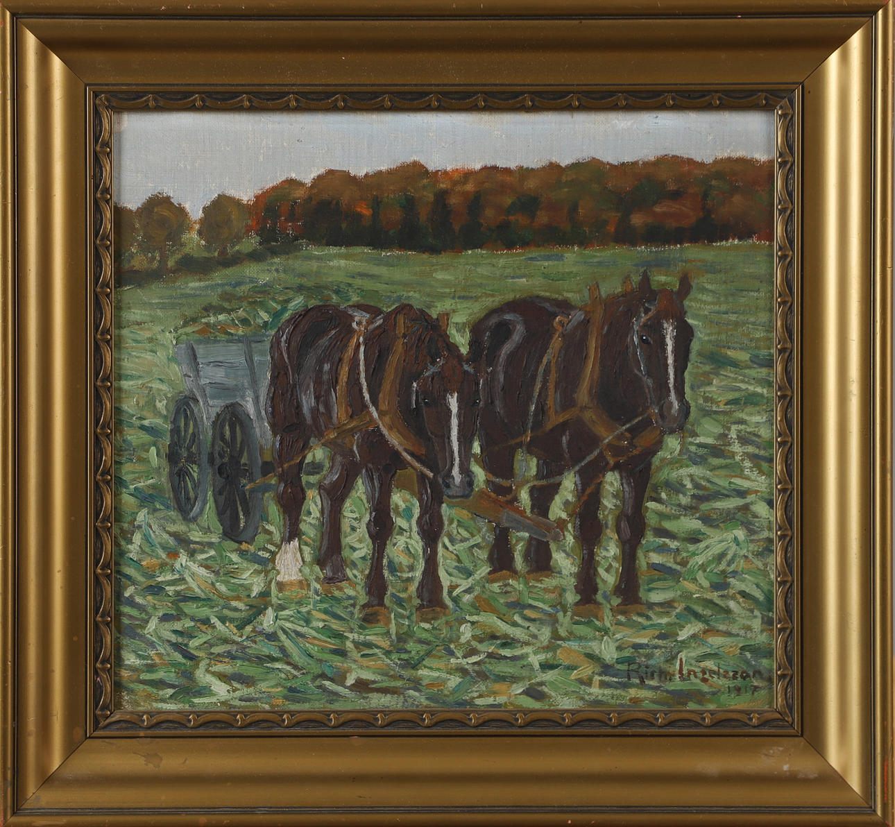 4451342. OIDENTIFIERAD KONSTNÄR. Workhorses, oil on panel, signed Rich. Ingelzón.
