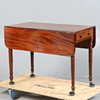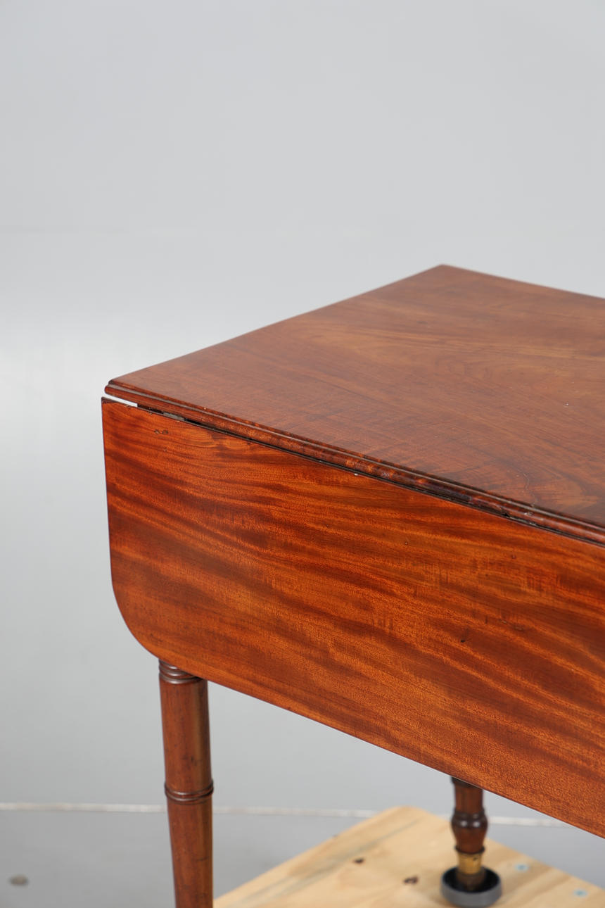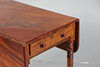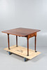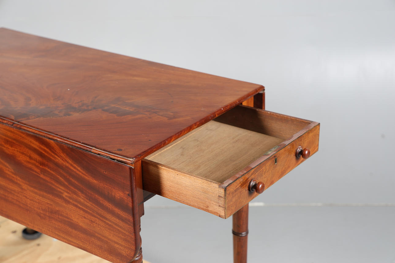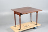 The drop leaf top fitted single end drawer and dummy drawer, raised on turned legs and castors, 91cm wide, 69cm high.