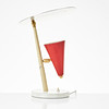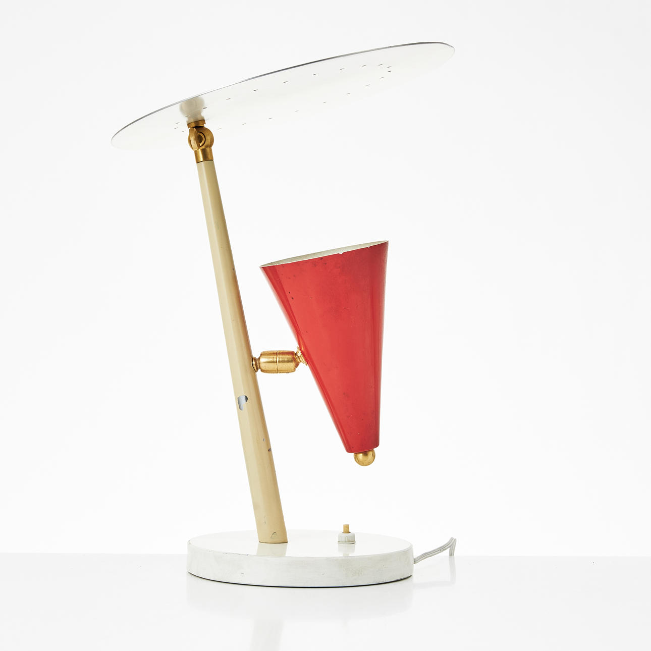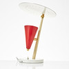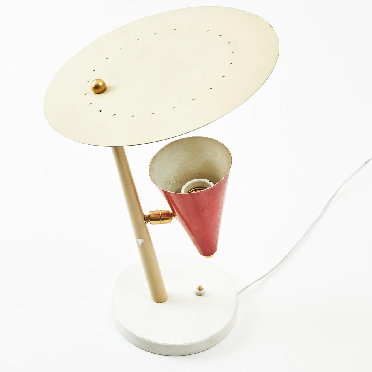 Cream white lacquered round perforated screen with brass details. Red lacquered candle holder. Round foot. Height 37 cm.
