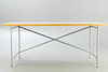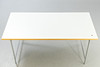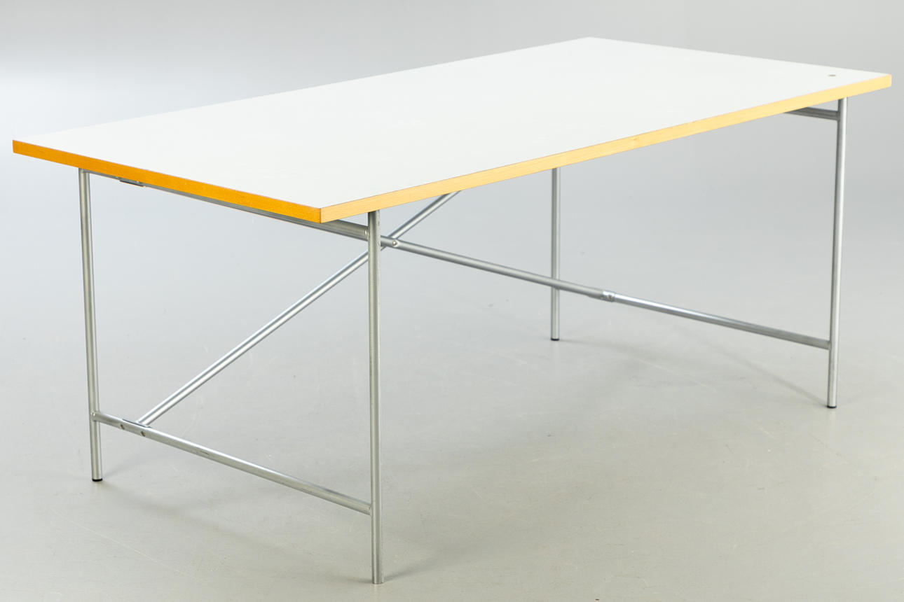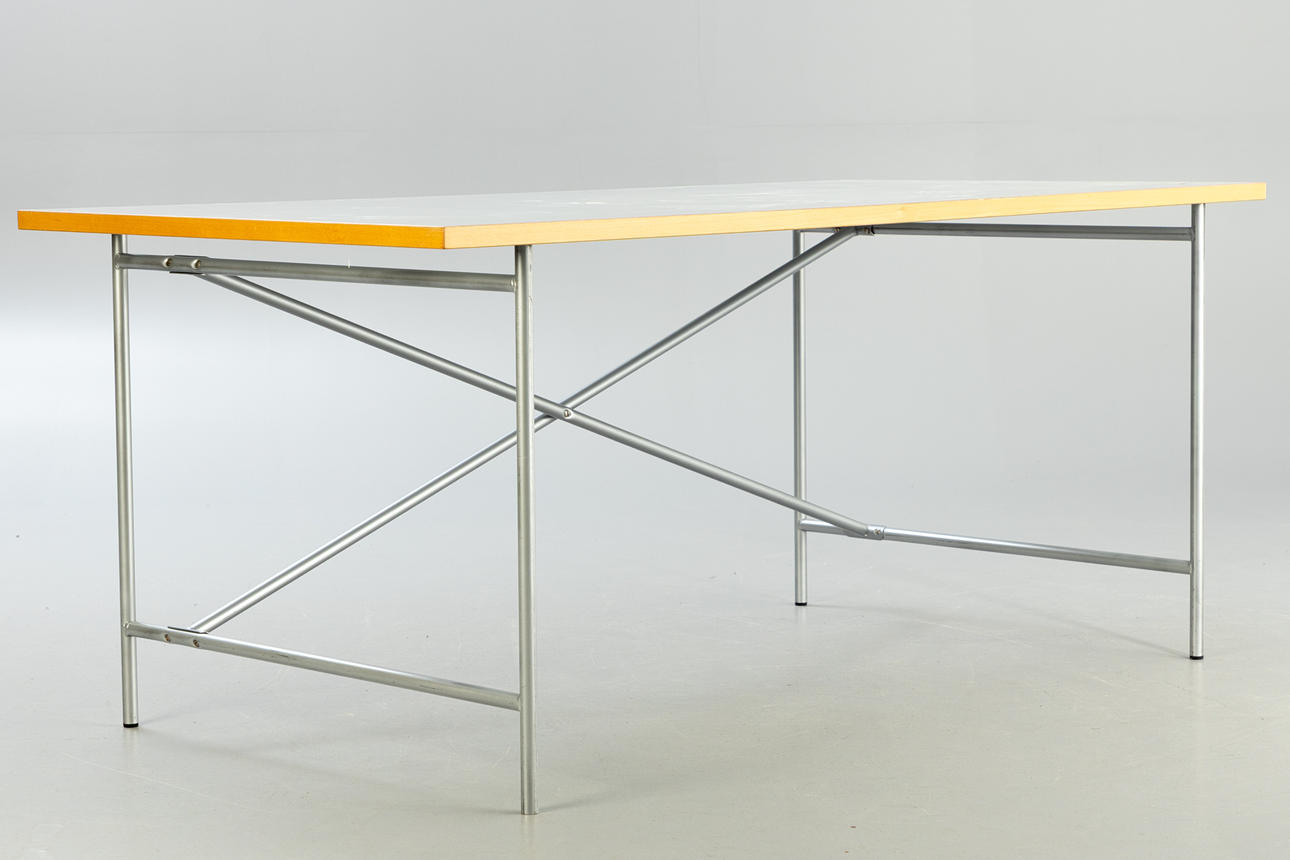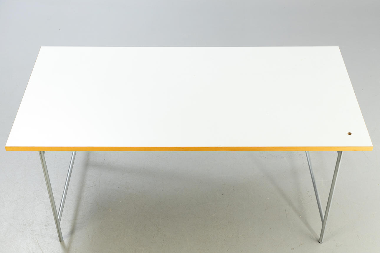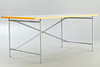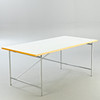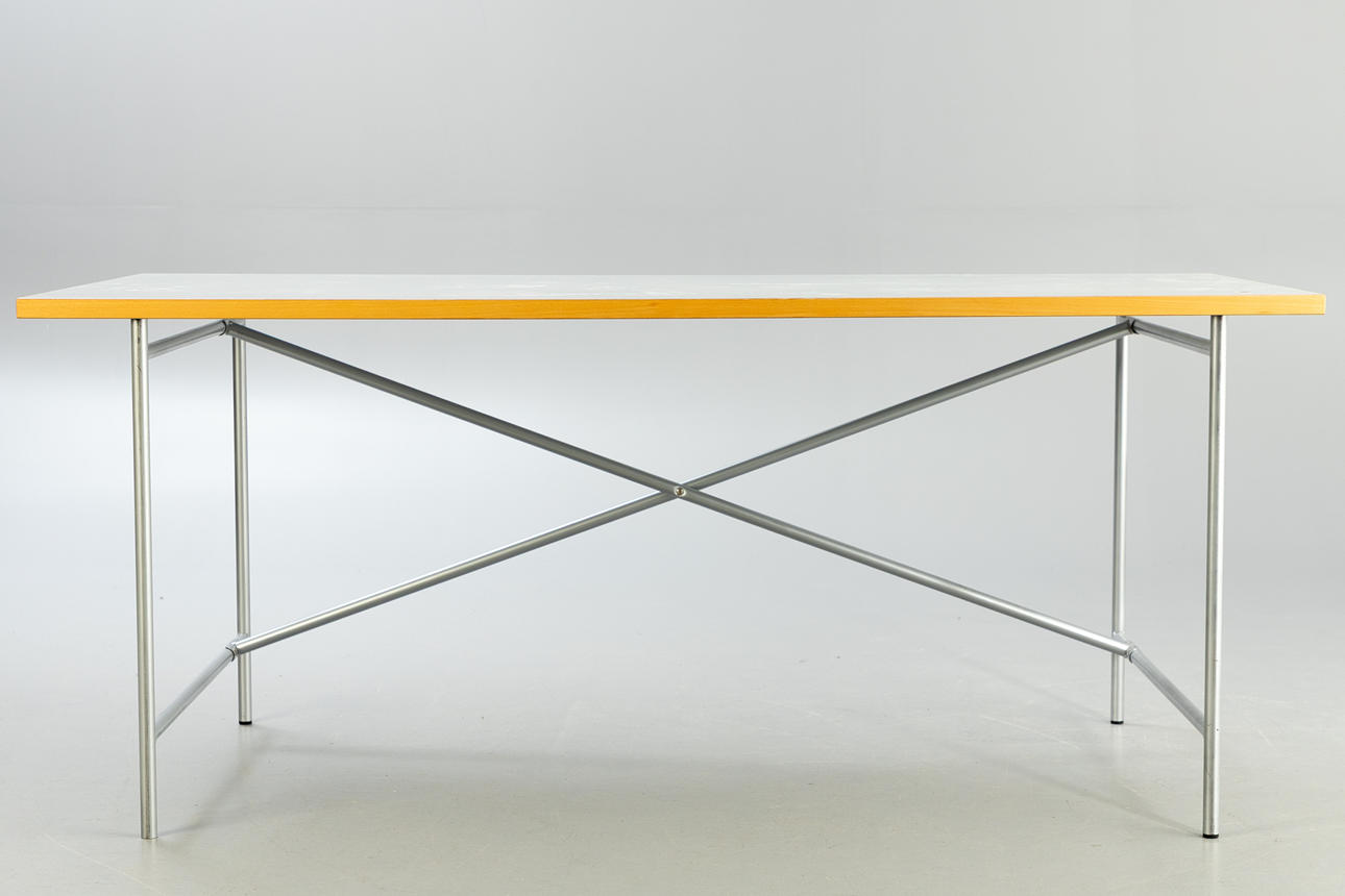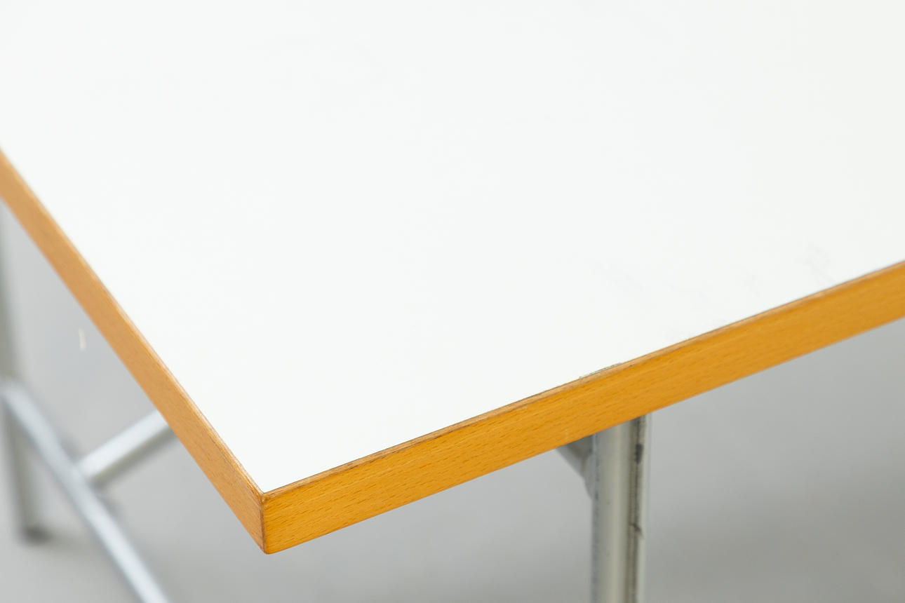Design: 1965. Powder-coated silver frame Vertical bracing moved backwards. Loose table top with white laminate.