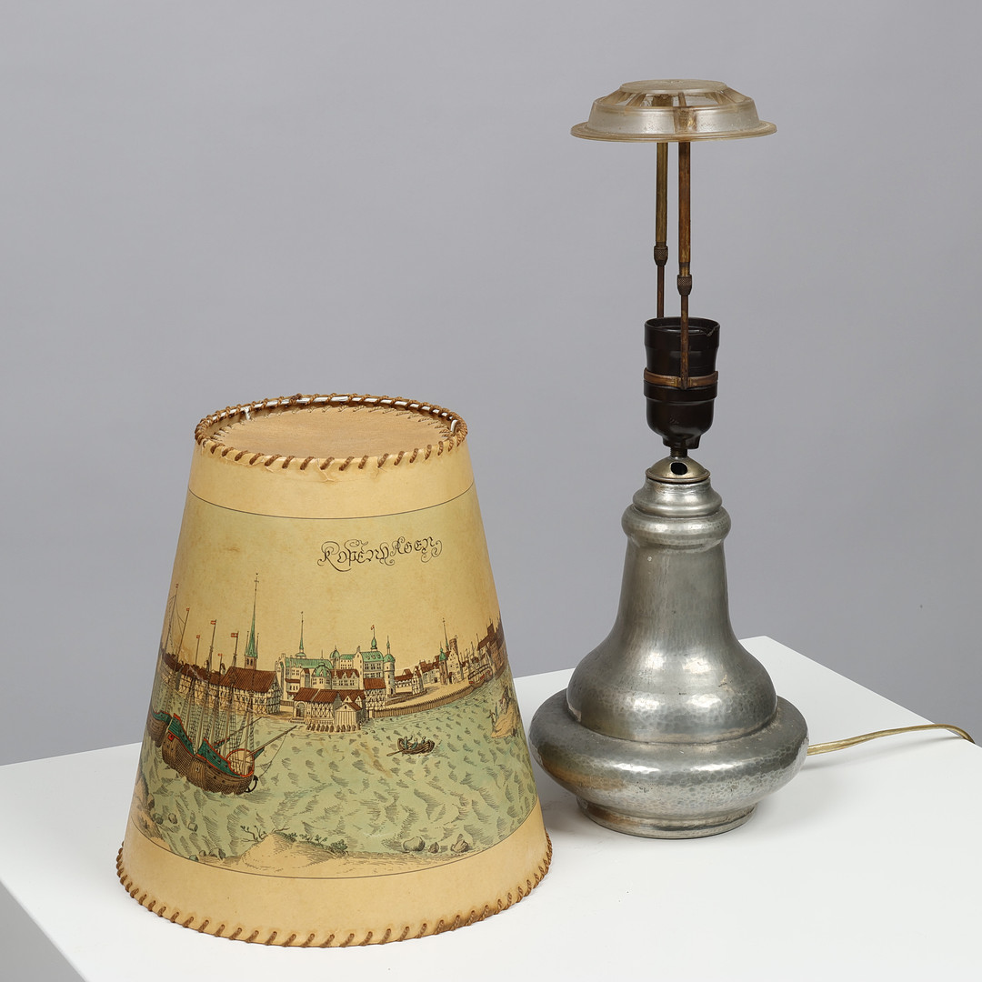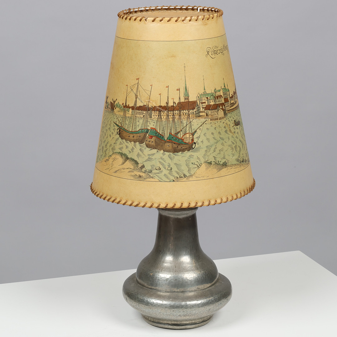 4452465. Table lamp made of pewter and screen with ship motif, Art Nouveau style, OR&S, Danish lamp manufacturer, beginning of the 20th century.
