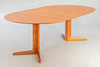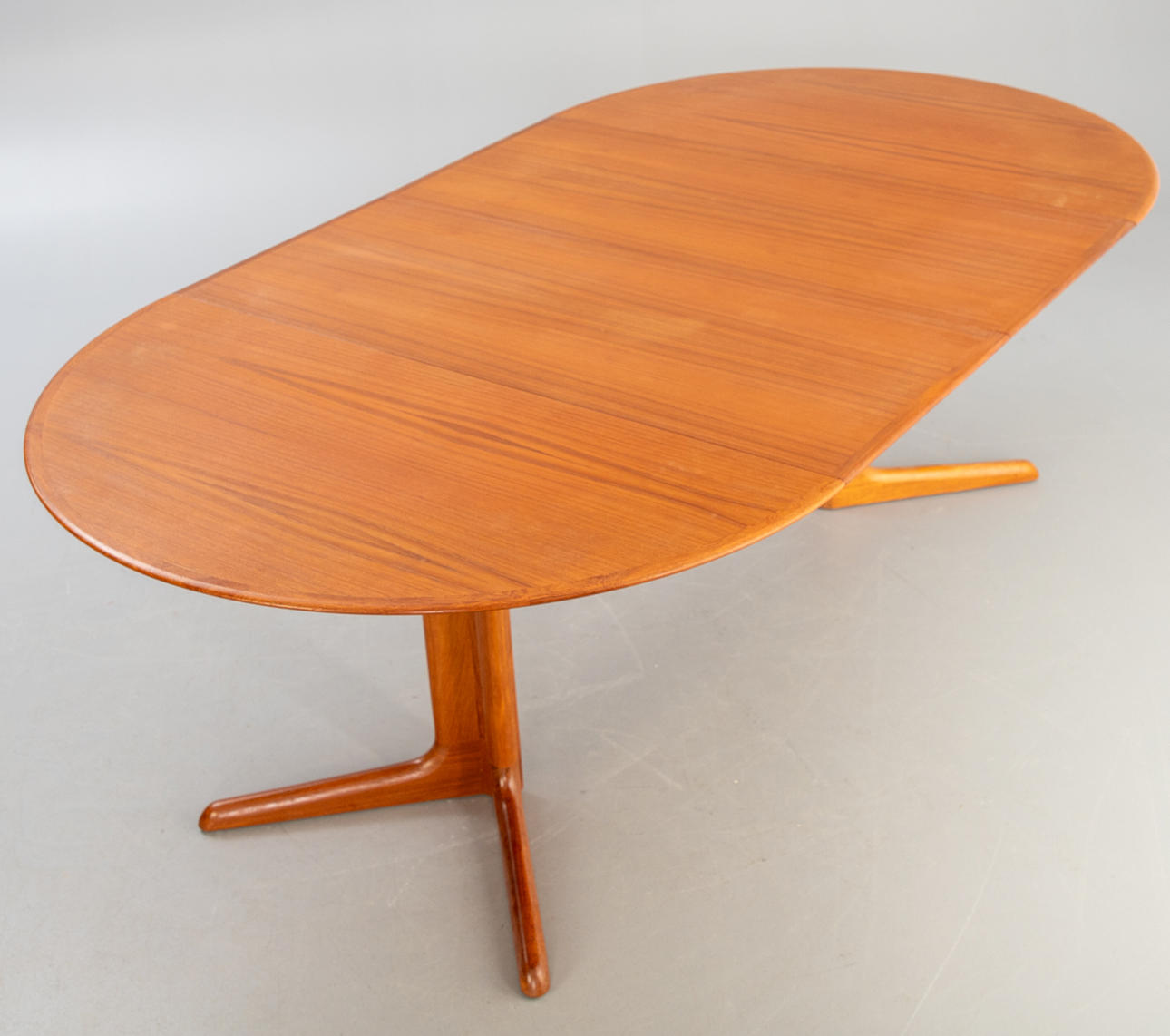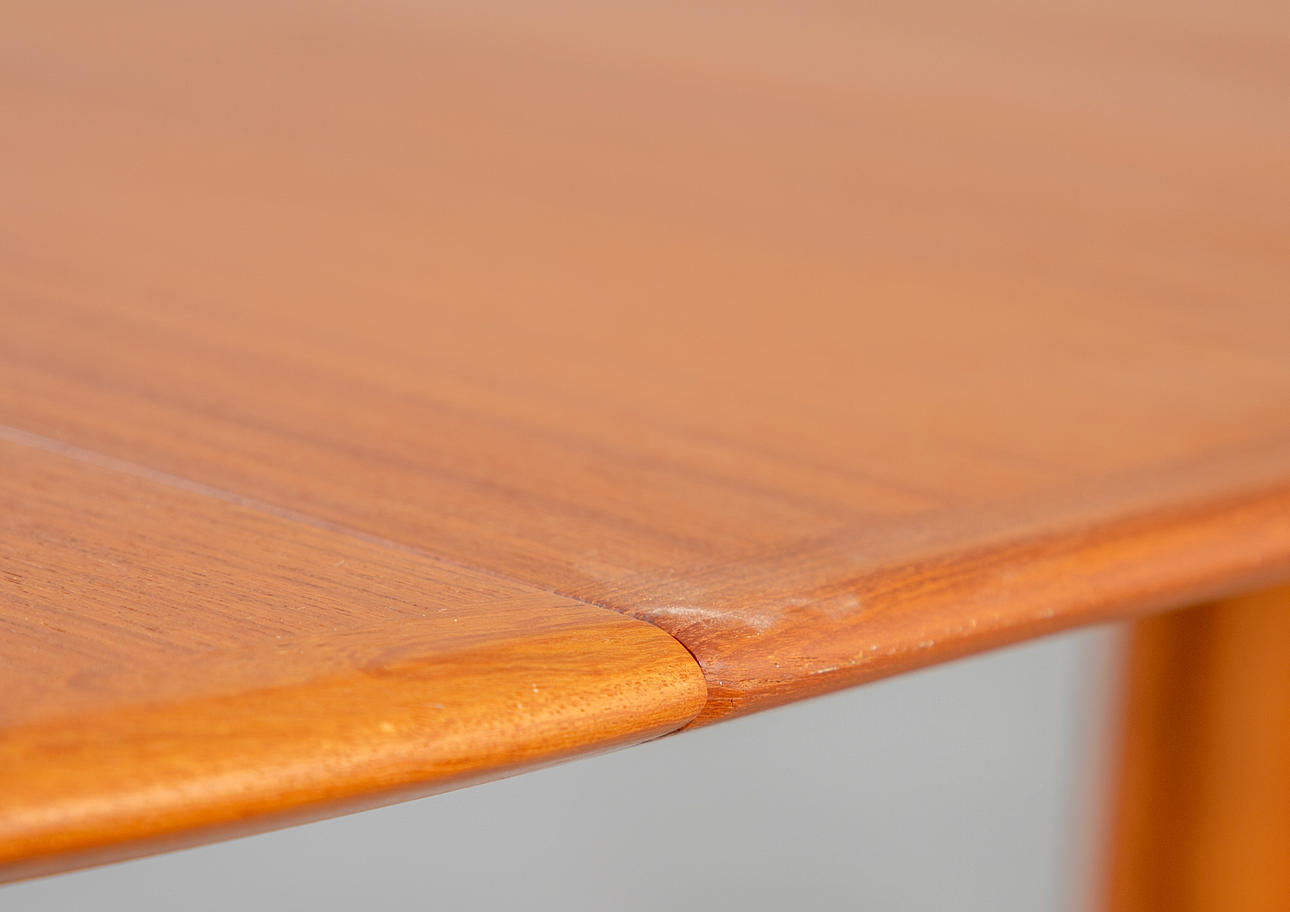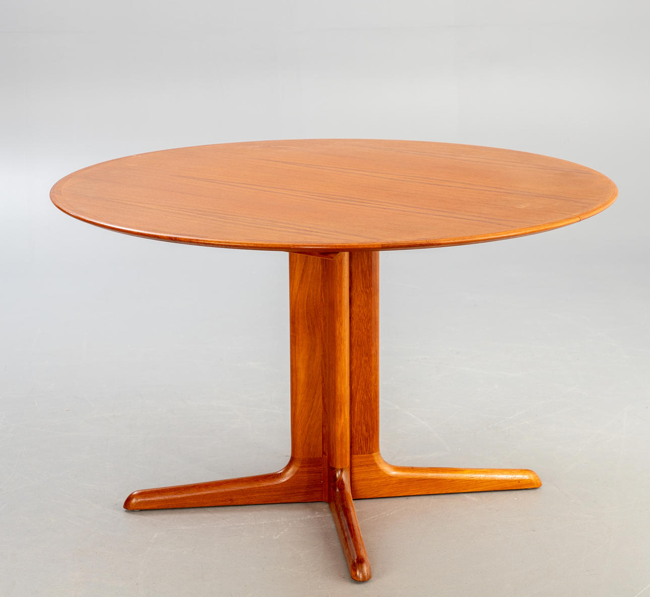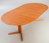 Partially veneered teak construction. Round extendable dining table, 2 50 cm extension plates, available.