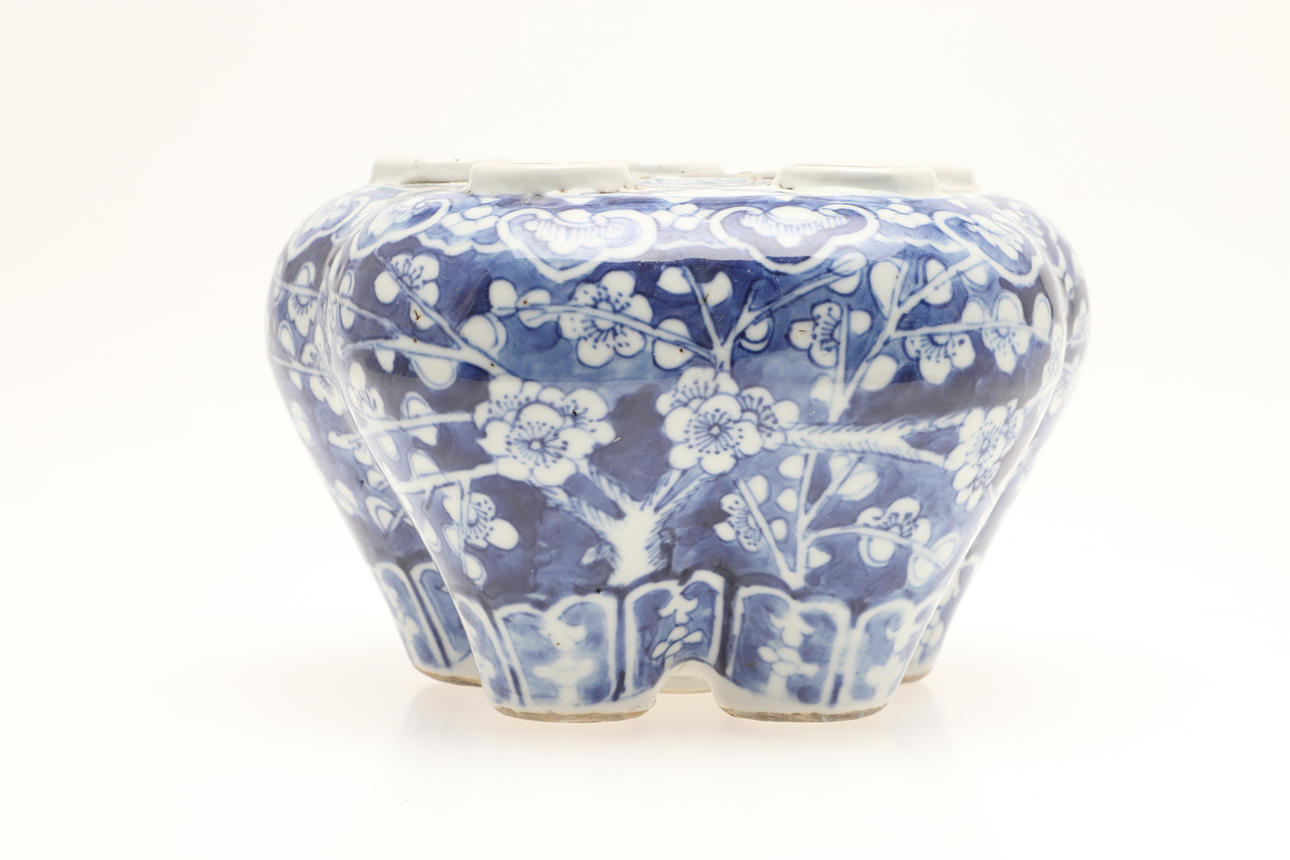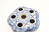 A blue and white porcelain tulip vase, painted with flowers and foliage and with an arrangement of holders, missing it's central stem. 11cms high, 16cms by 16cms.