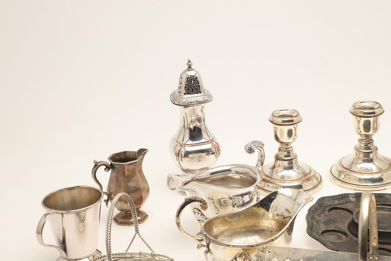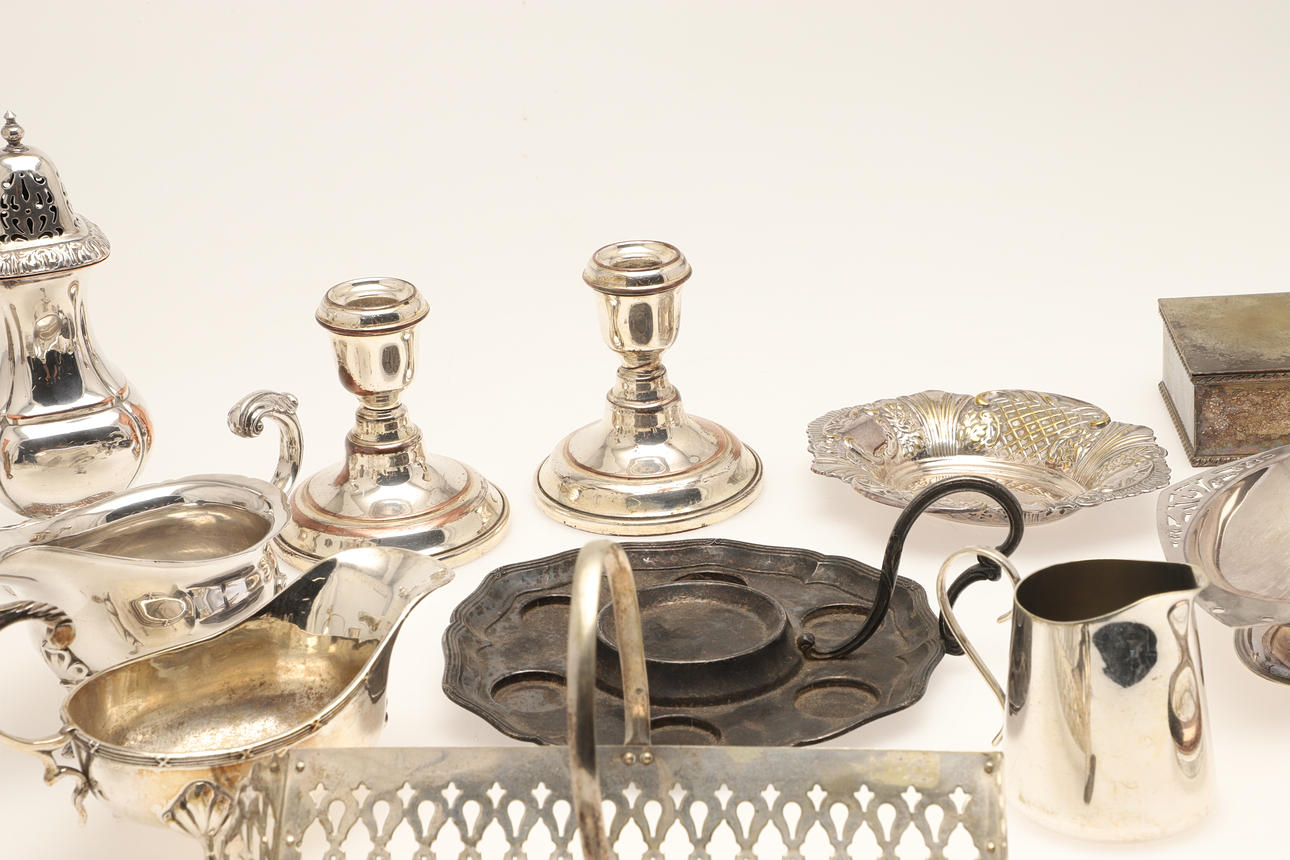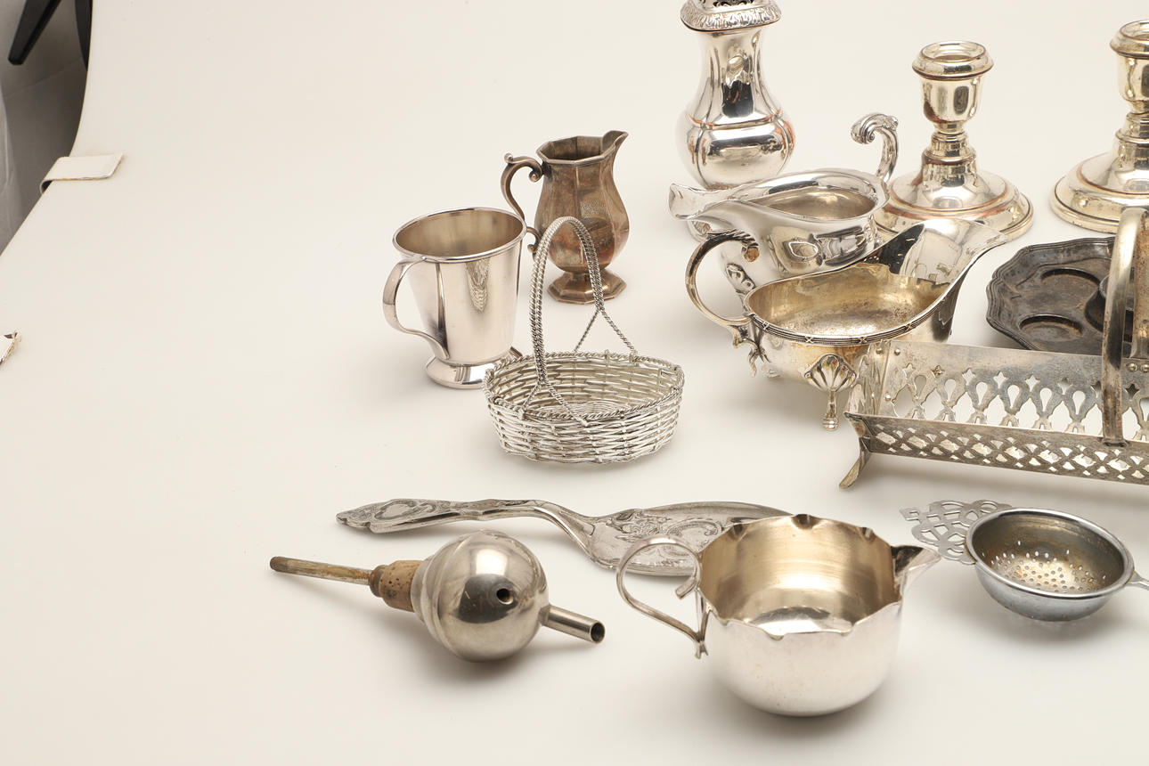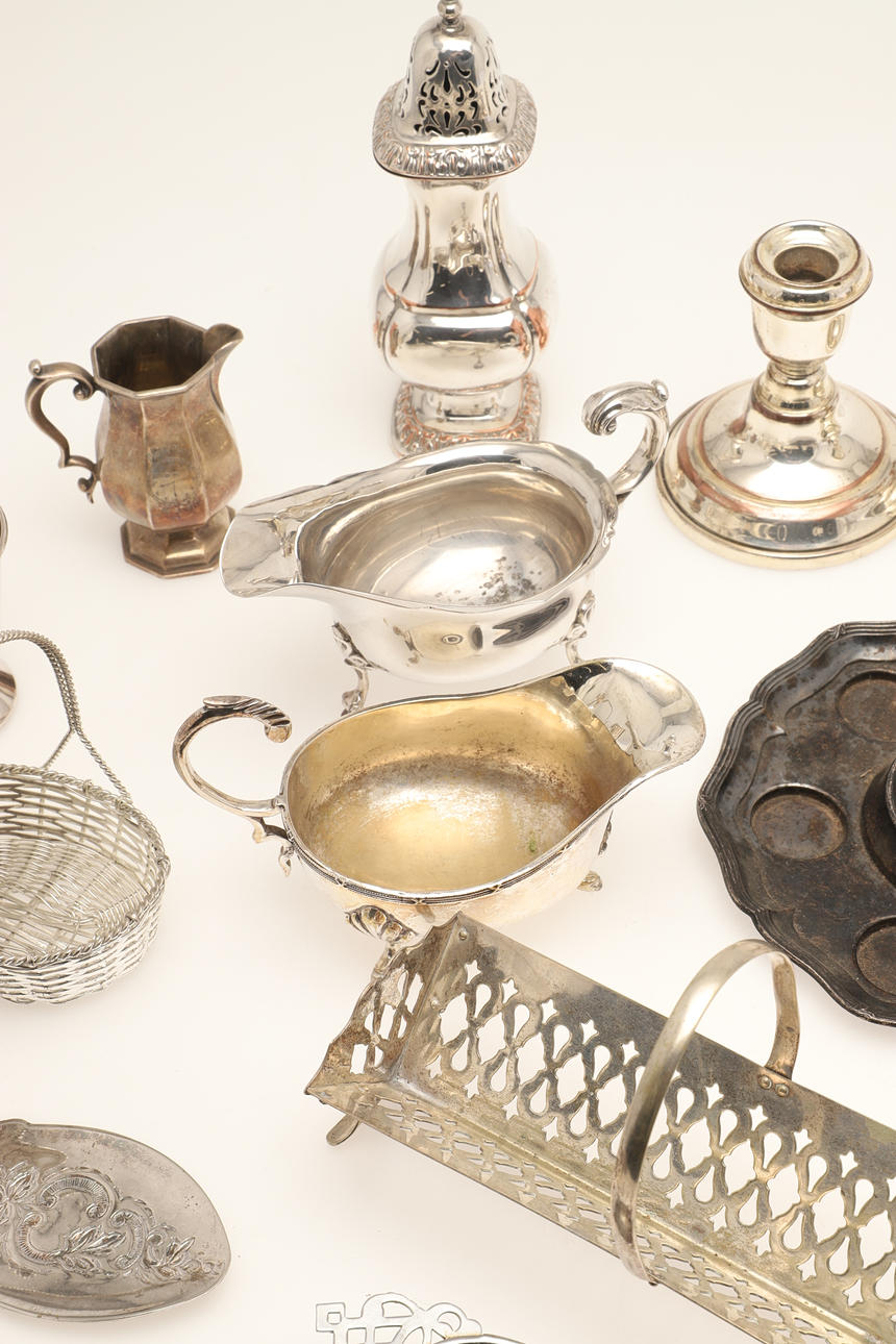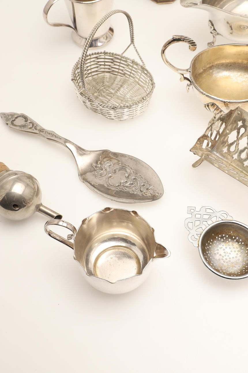 To include a pair of mini candlesticks (height 11cm), gravy boats, jugs, trays, and a sugar caster (height 18cm). (Qty).