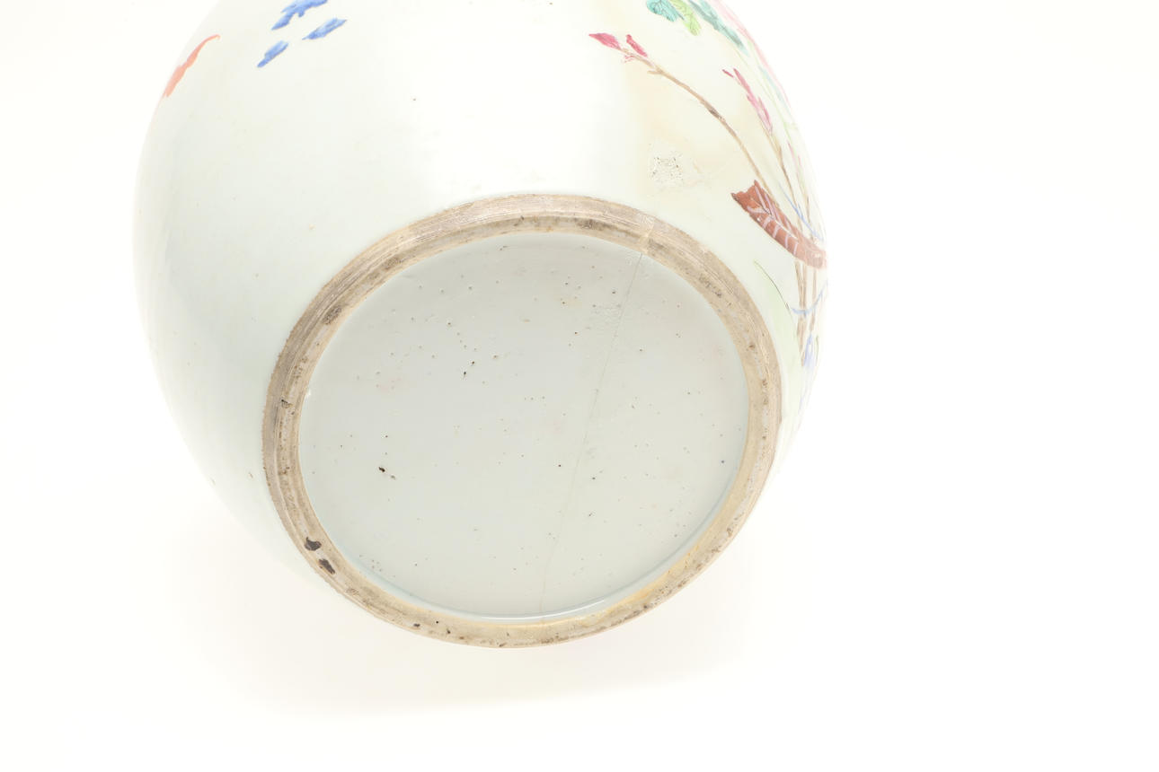A large 19thc ginger jar, painted with an exotic bird amongst rockwork and flowers. Some damages and restoration, 22.5cms high.