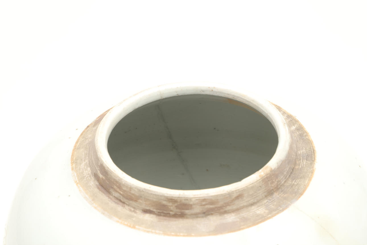 the jar has been completely broken and restored, with visible lines running down the body, inside and to the base, these areas have yellowed with time, chip to the footrim.