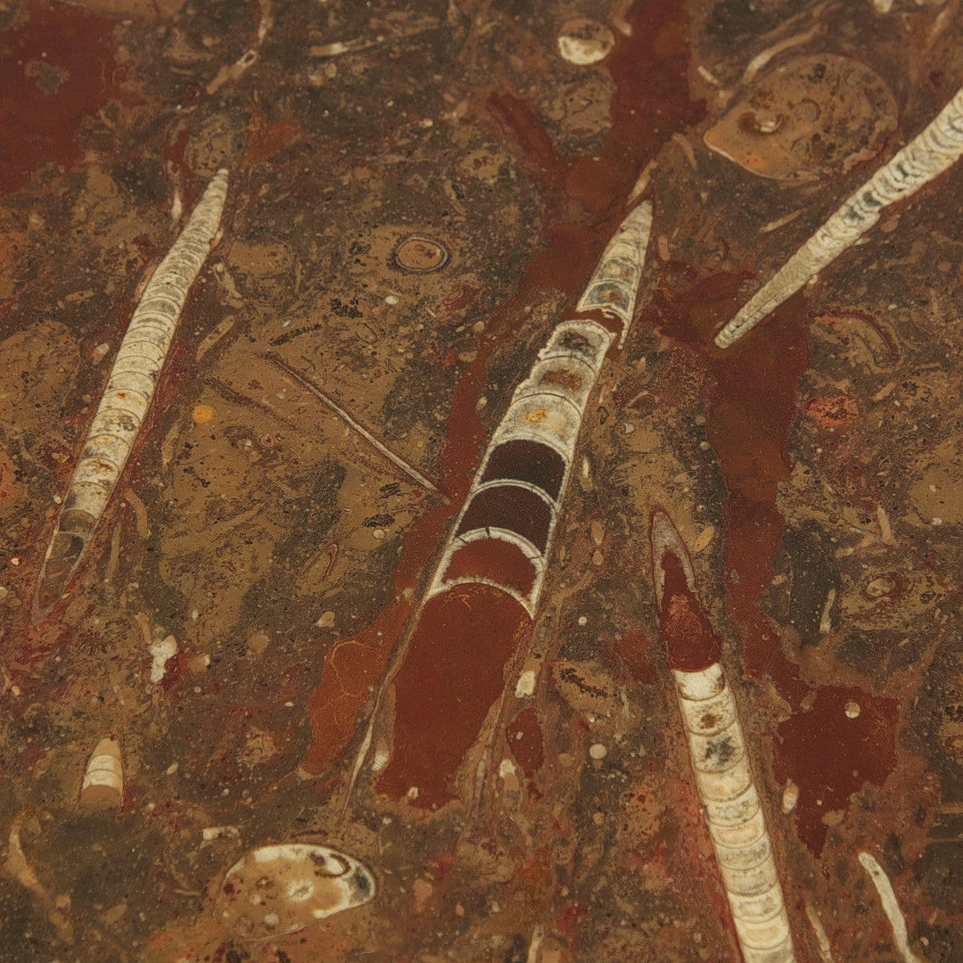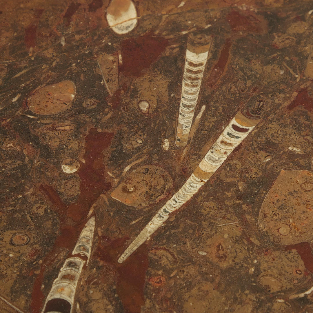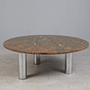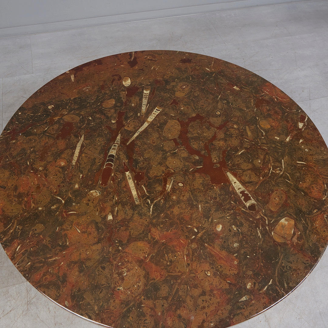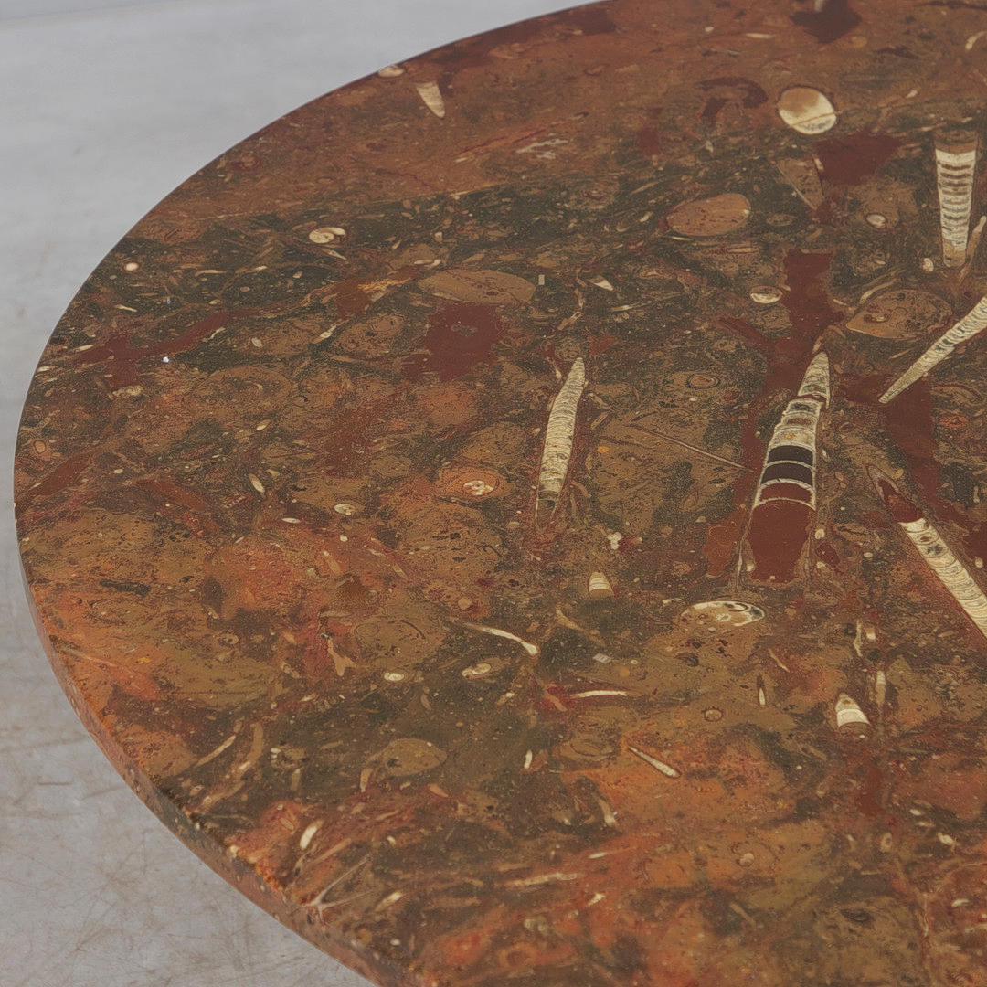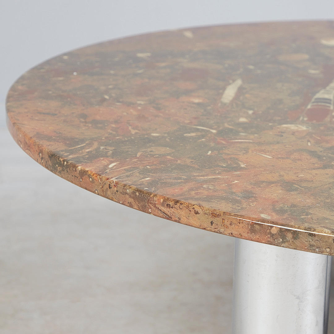 Coffee table with a three-legged tubular substructure and a loose, round table top made of fossil limestone with petrified orthoceras and goniatites, H.41cm, D.110.