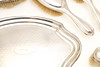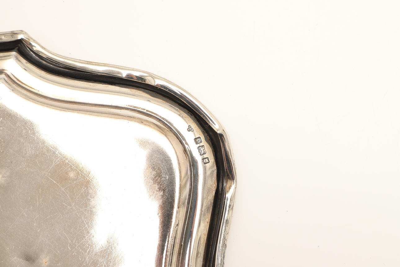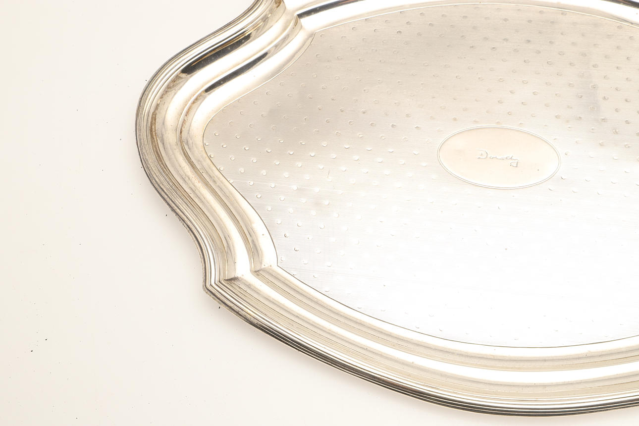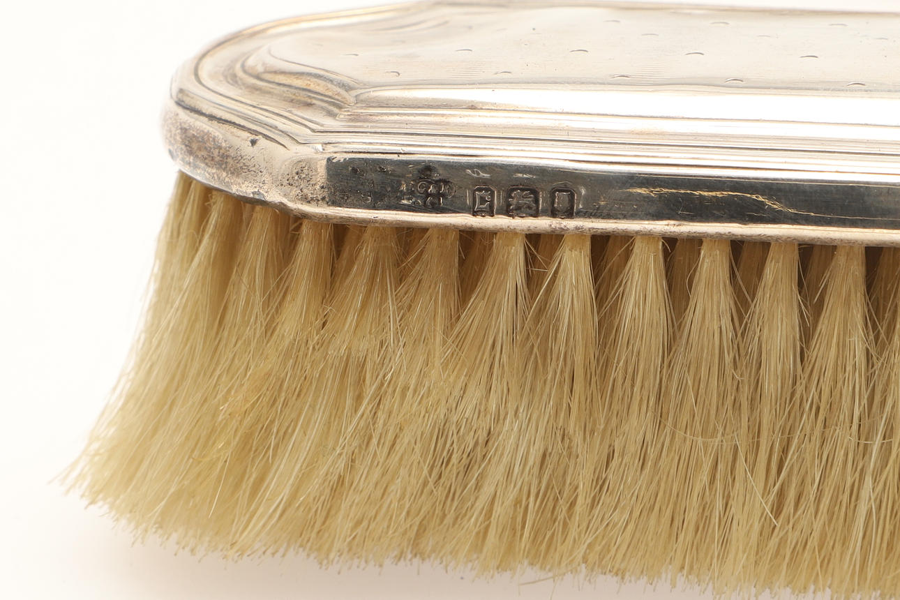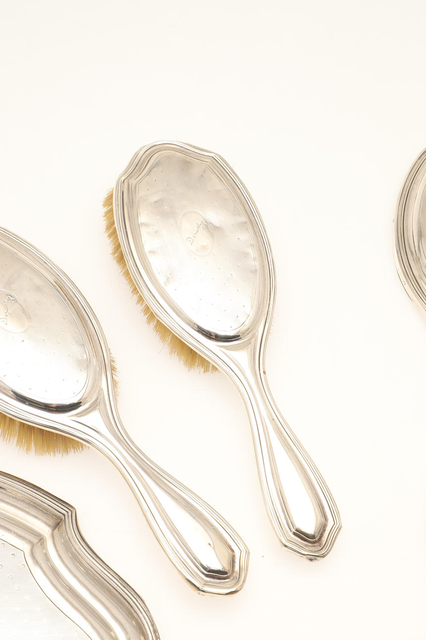 To include a bevelled edge vanity mirror (Length 28cm) and four brushes (two pairs), all with engine turned decoration and engraved name "Dorothy". Hallmarked Charles & Richard Comyns, London, 1918 and 1919. (5).