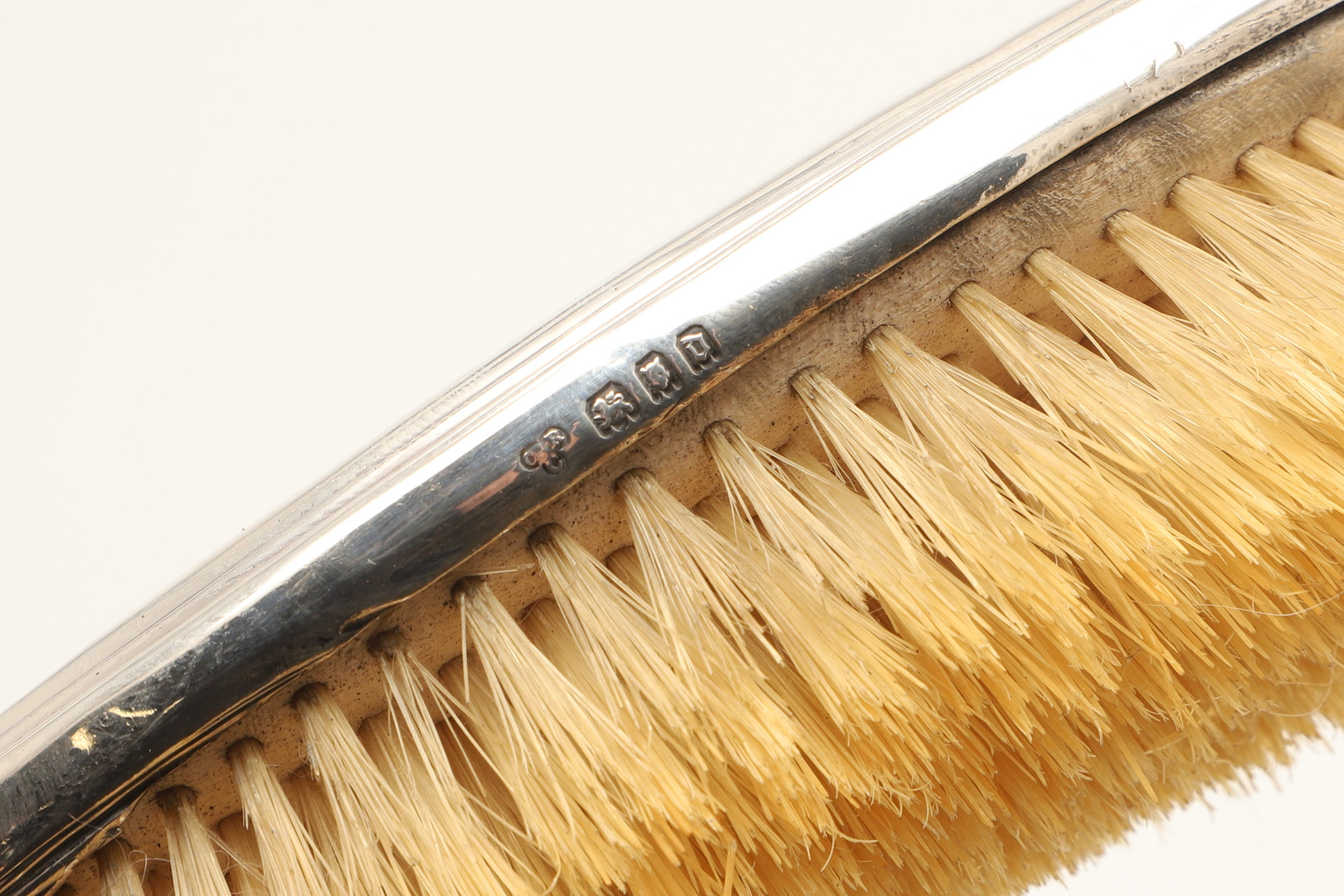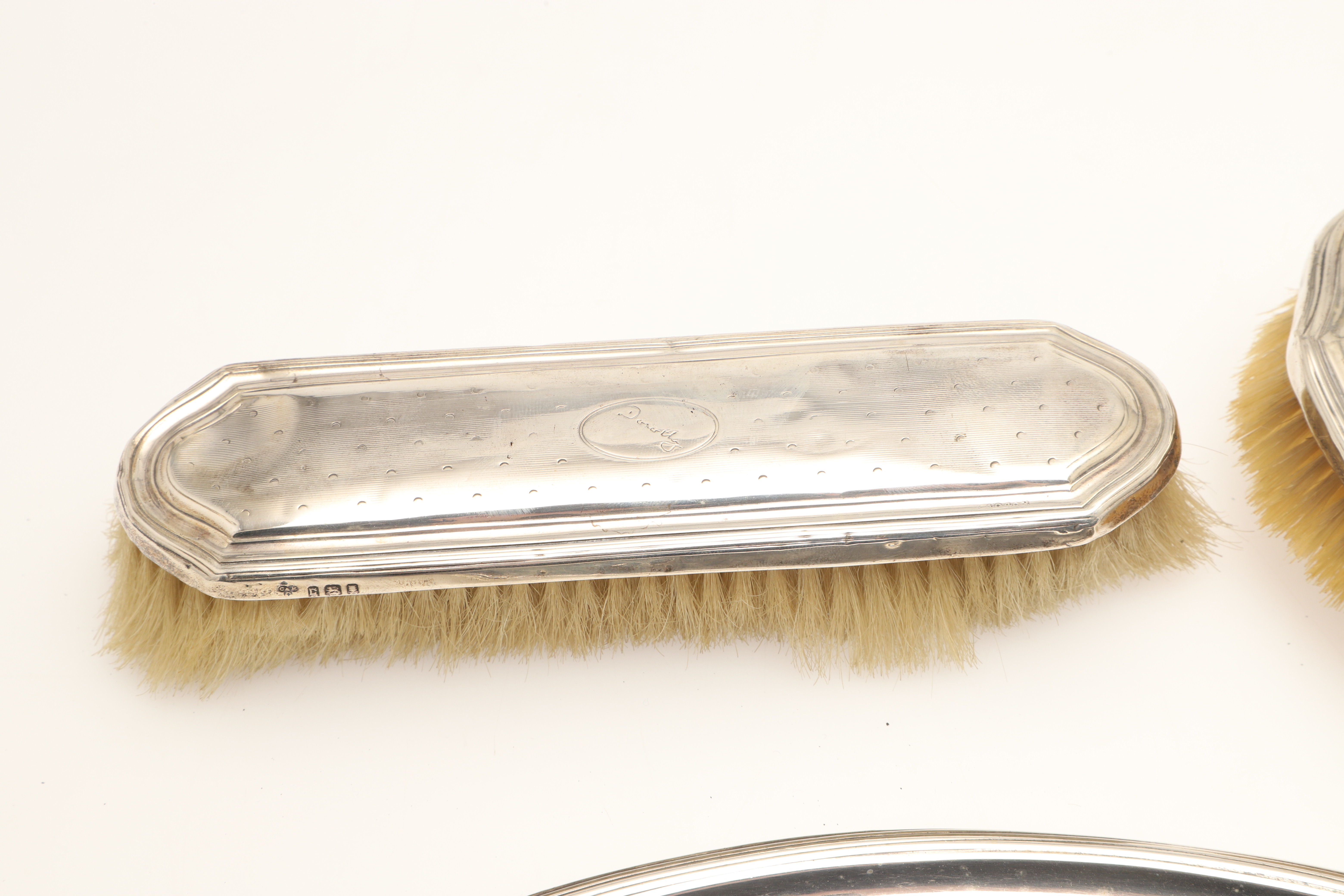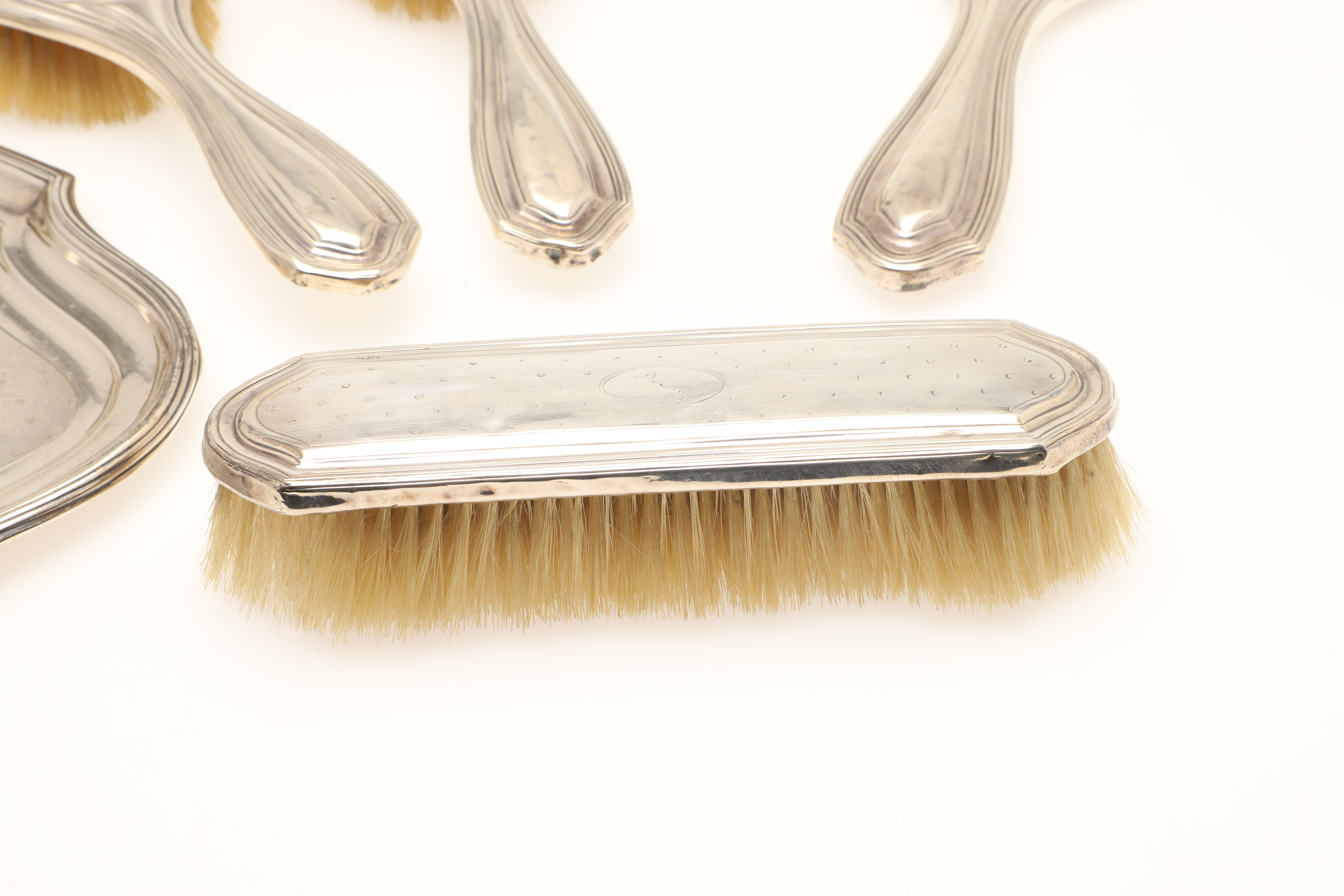 4453954. A GEORGE V FIVE PIECE SILVER BACKED DRESSING TABLE SET.