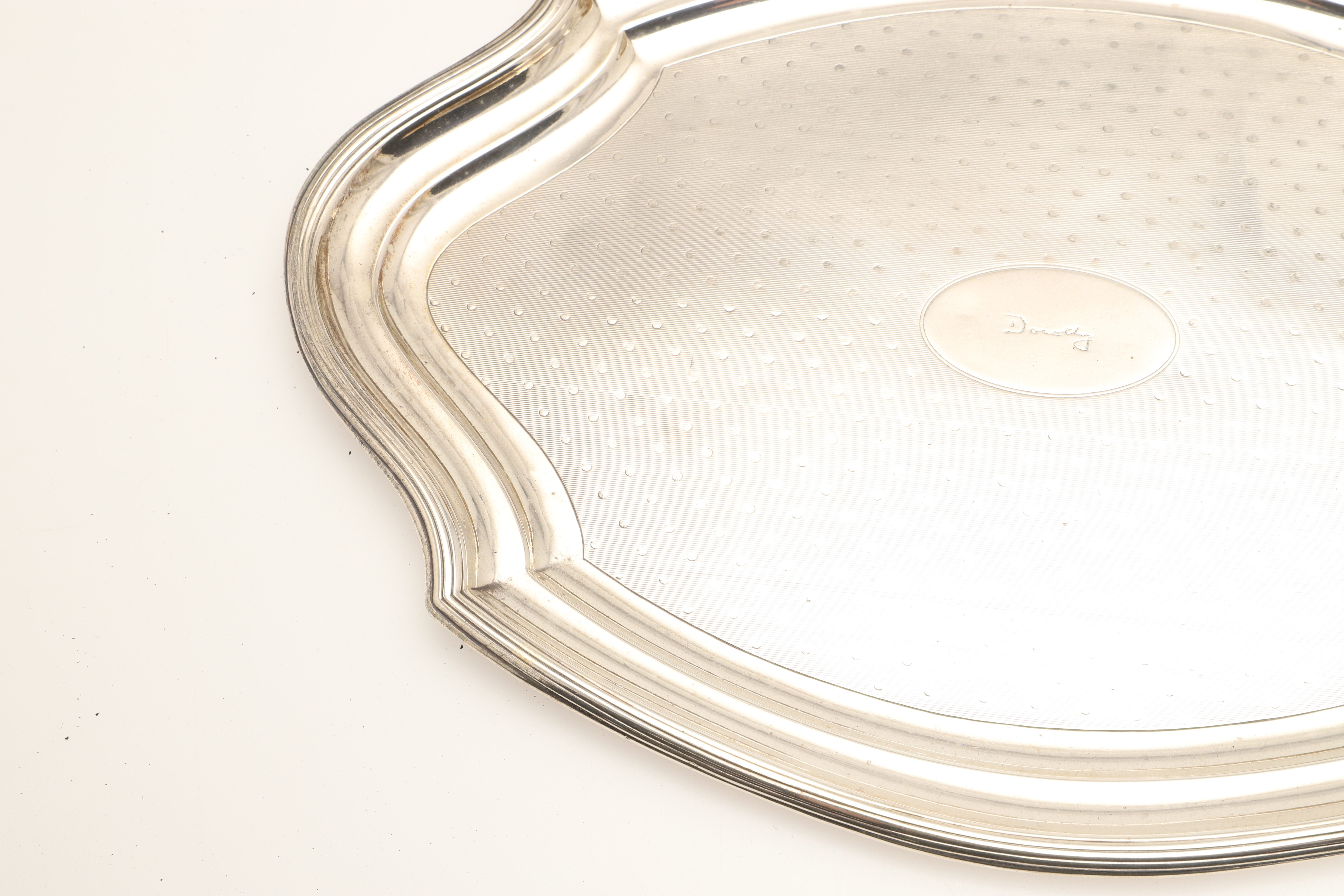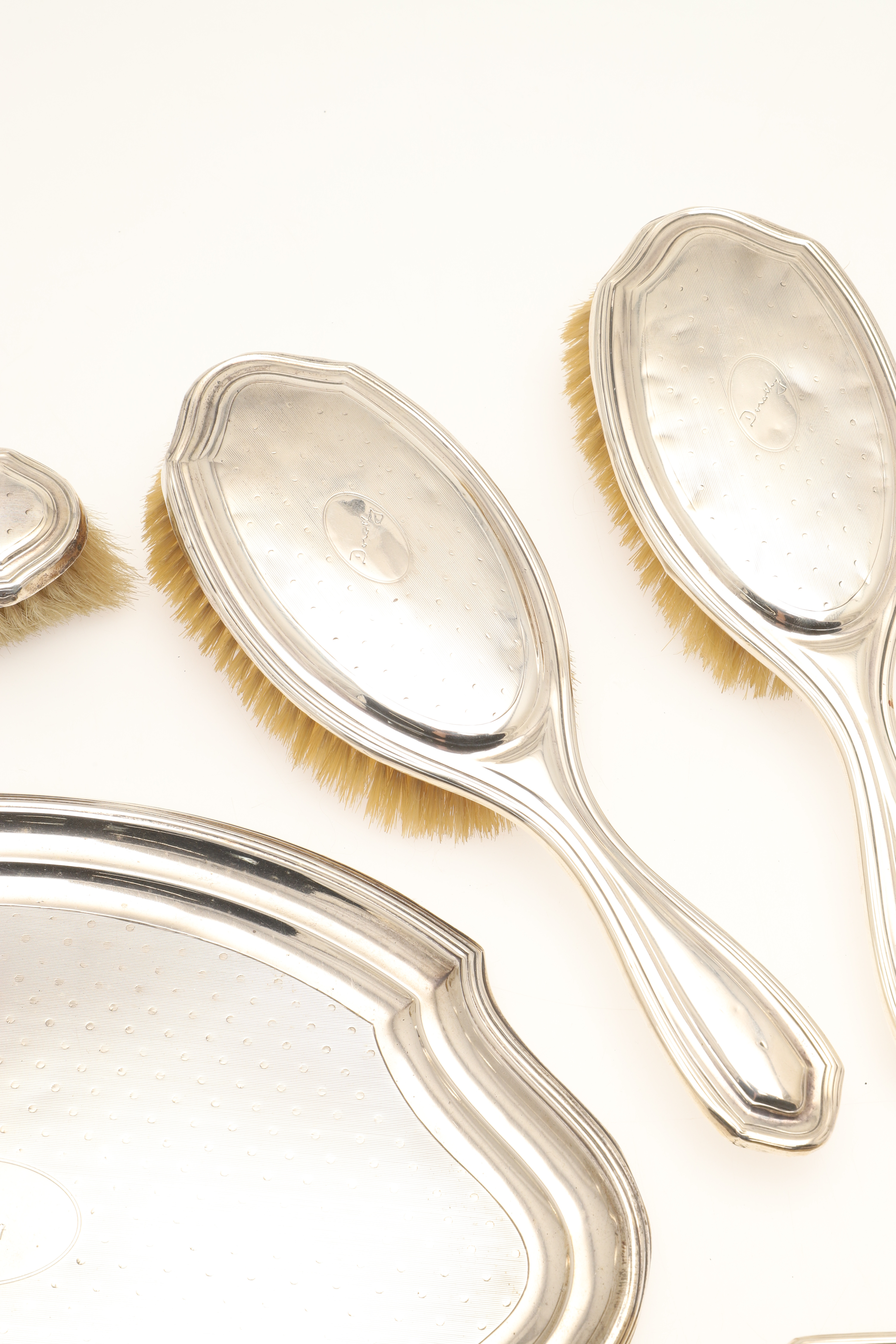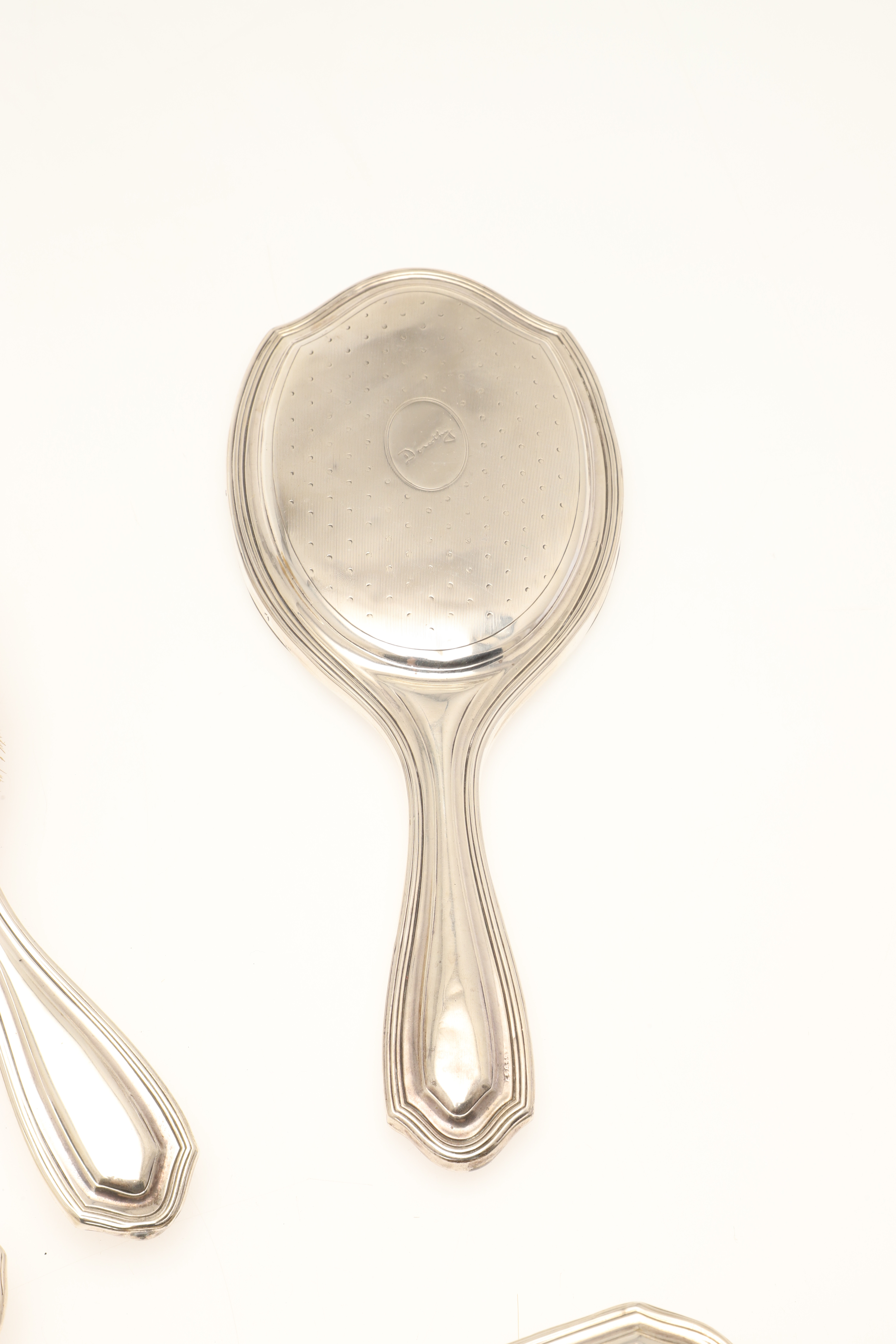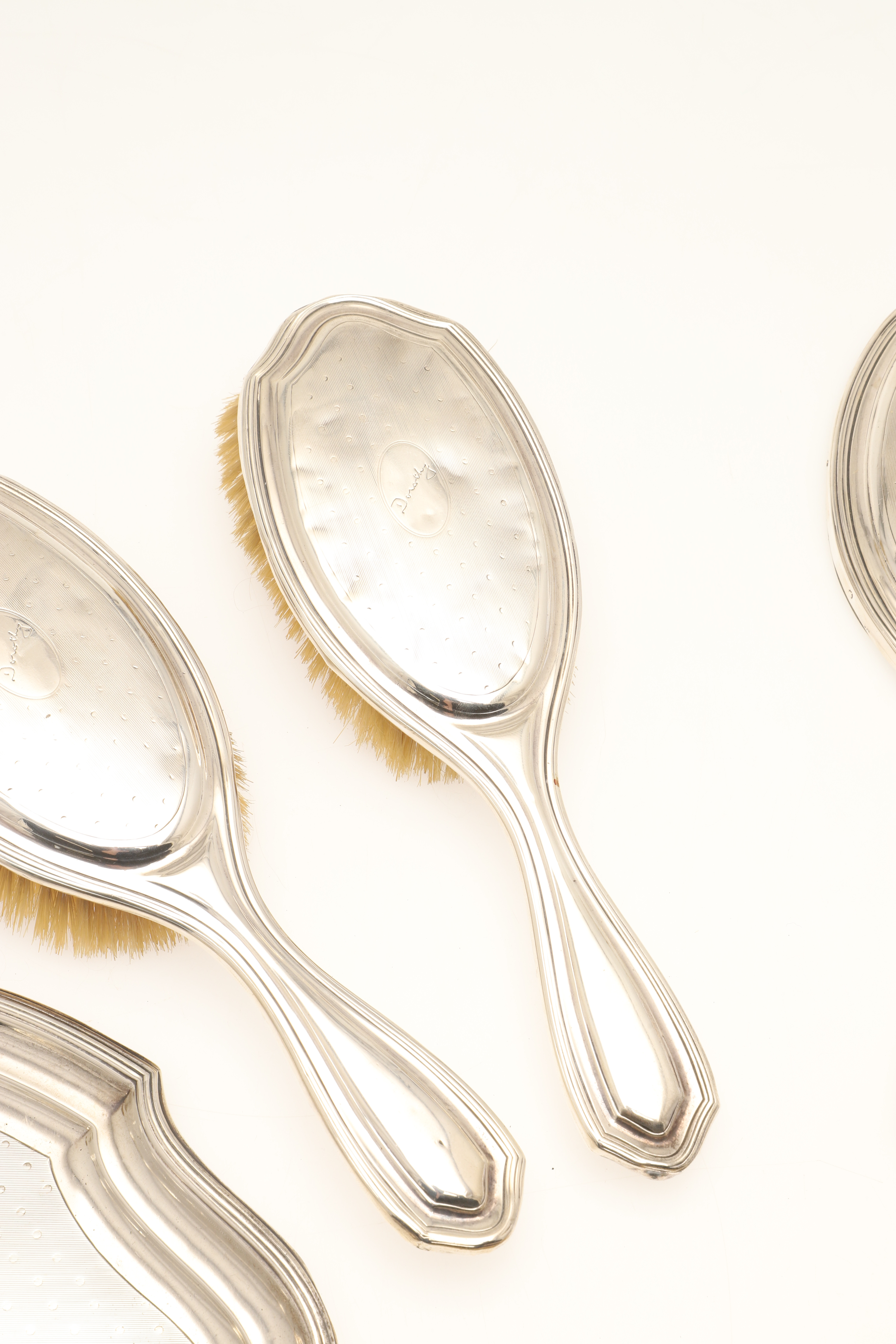 4453954. A GEORGE V FIVE PIECE SILVER BACKED DRESSING TABLE SET.