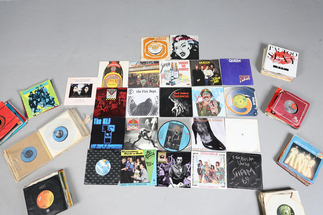 7" singles to include Black Sabbath - Paranoid (BSS 101), The Fire Dept. - Girl Girl Girl Girl (KL-001), David Bowie - The Laughing Gnome (DM 123), The Damned - Eloise (GRIM 4), Queen - Flash (EMI 5126), The Move - California Man (HAR 5050), PiL - This Is Not A Love Song (VS 529), Sham 69 (x2) - Hurry Up Harry / No Entry (POSP 7) and If The Kids Are United (2059050), Lynyrd Skynyrd - Free Bird (MCA 251), The Shakin' Pyramids - Tennessee Rock 'N' Roll (VS 415), The Clash / BAD II - Should I Stay Or Should I Go / Rush (656667-7), XTC - Generals And Majors (VS365), The Rolling Stones - Start Me Up (RSR 108), The Beatles - The Beatles' Movie Medley (R6055), Dr. Feelgood - Milk And Alcohol (UP36468), Echo & The Bunnymen - People Are Strange (YZ 567), The Clash (x2) - Rock The Casbah (656814 7) and London Calling (656946 7), other artists to include The Animals, Billy Joel, Wizzard, The Inmates, Ian Dury And The Blockheads, Robert Palmer, Toto Coelo, Creedence Clearwater Revival, Captain Sensible, Fleetwood Mac, Pink Floyd, Dire Straits, Jilted John, Pretenders, Run DMC, Meat Loaf, The Who, John Lennon, Wings, Haysi Fantayzee, The KLF, The Peppers and more, stored in four carrying cases. (qty).