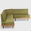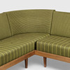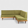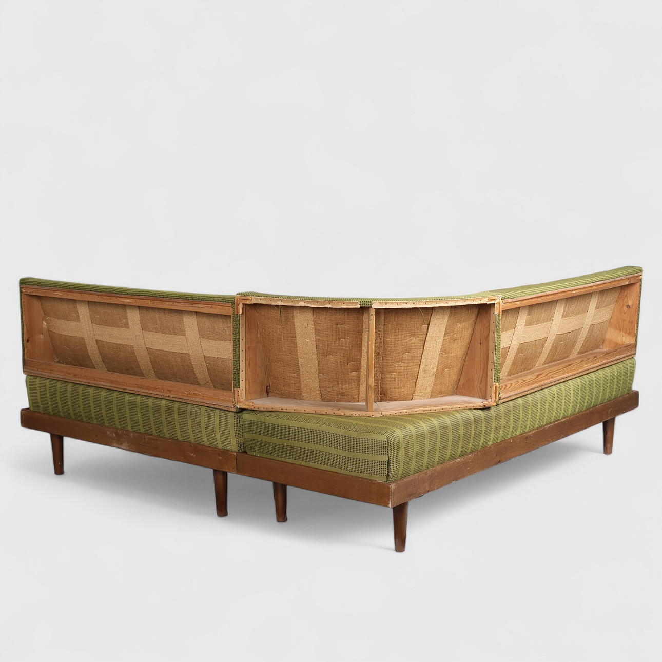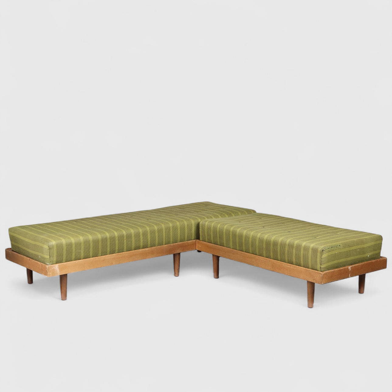 Corner sofa/daybed with oak frame. Loose mattresses with depth attachments and backs upholstered with wool.