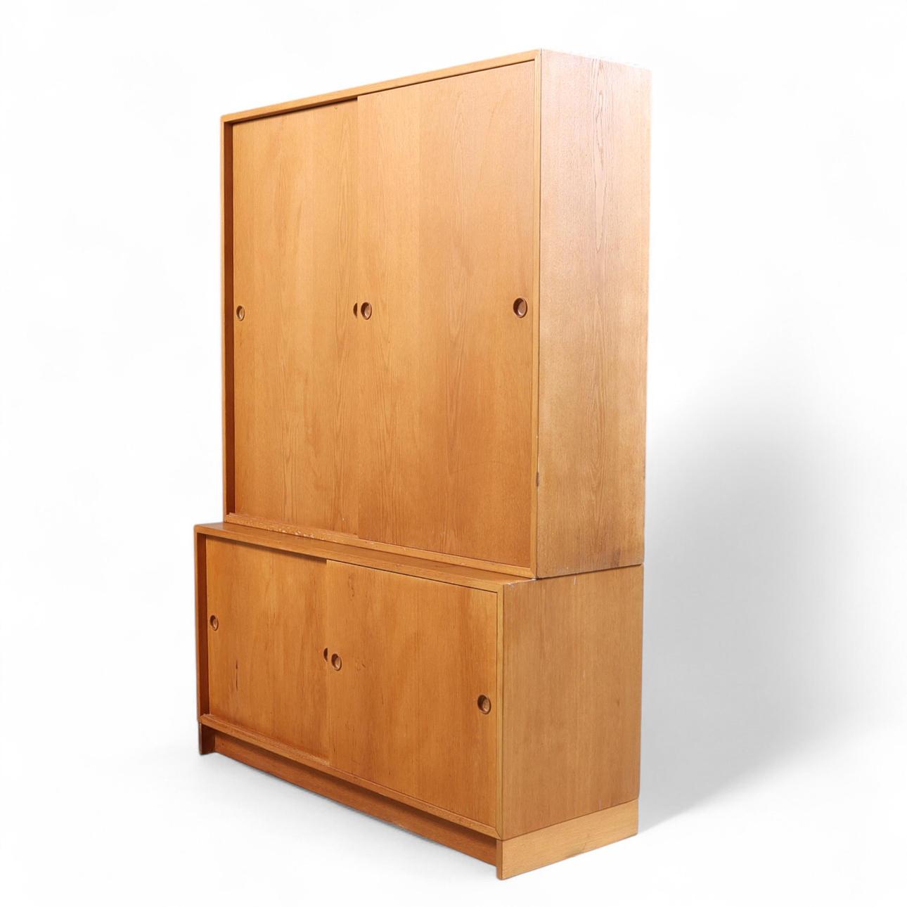 Two-part. Ek. Branded.. Top with a pair of doors with rear shelf. Lower part with a pair of doors with rear shelves and drawer compartments.
