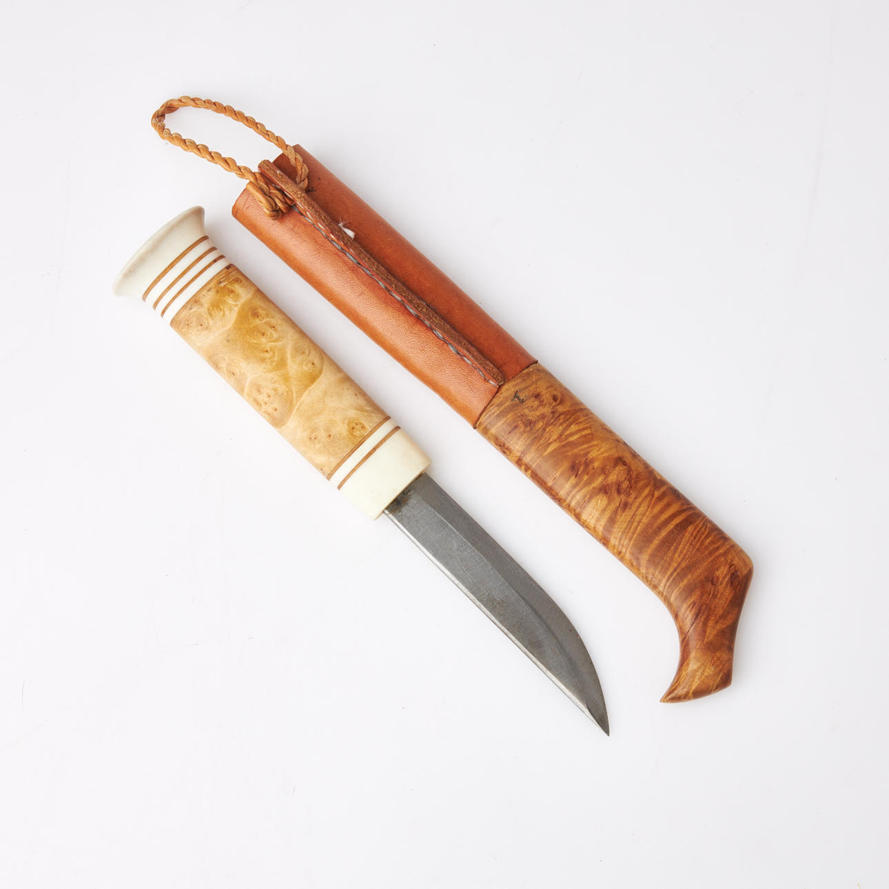 Shank in masur birch and reindeer horn with fist slats, knife sheath in tanned leather, masur birch and reindeer horn with engraved decoration.