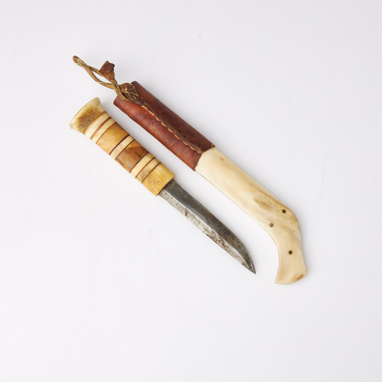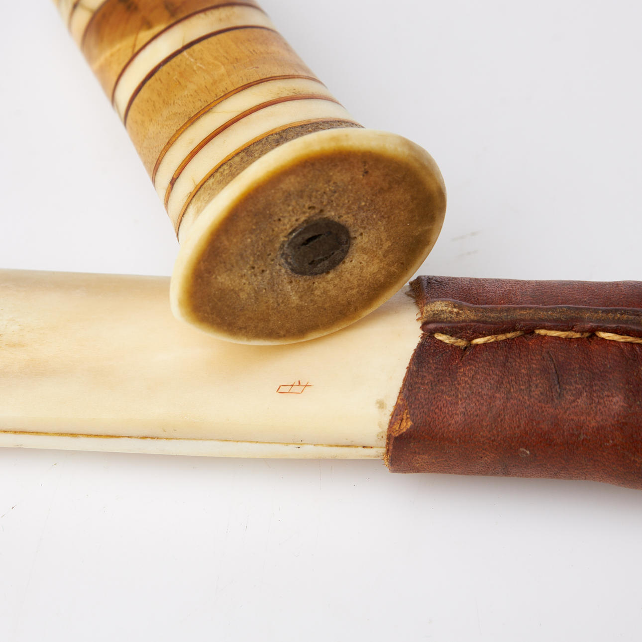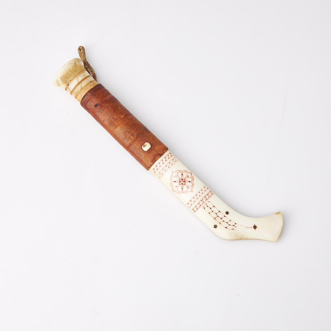 Shank in reindeer horn and masur birch with fist slats, knife sheath in tanned leather and reindeer horn with engraved decoration.